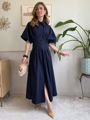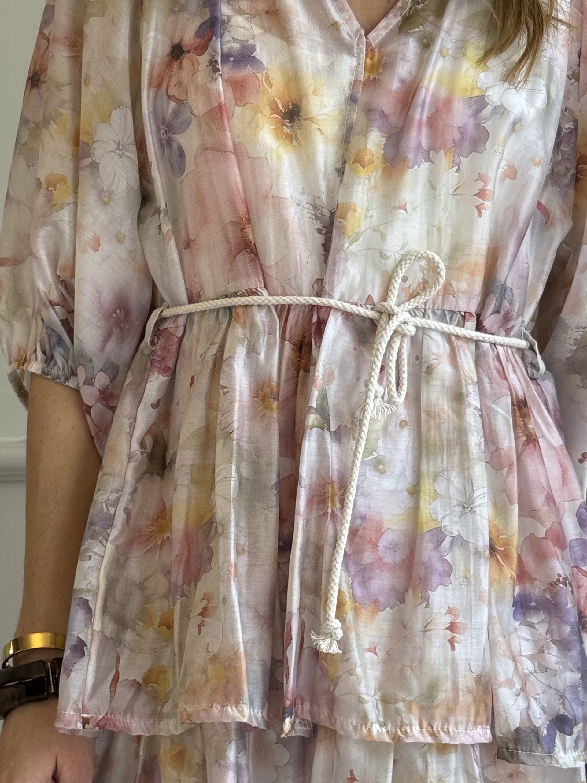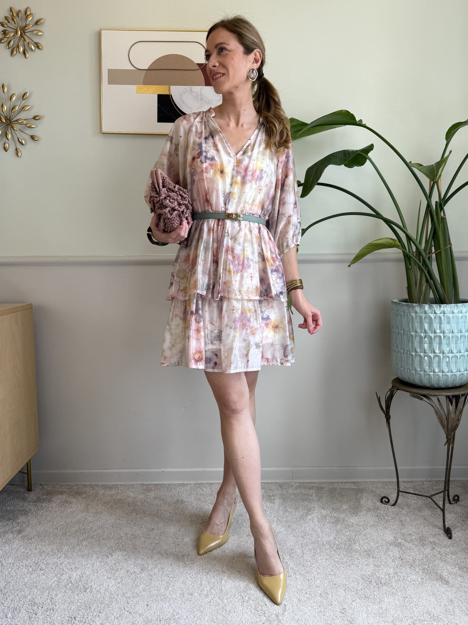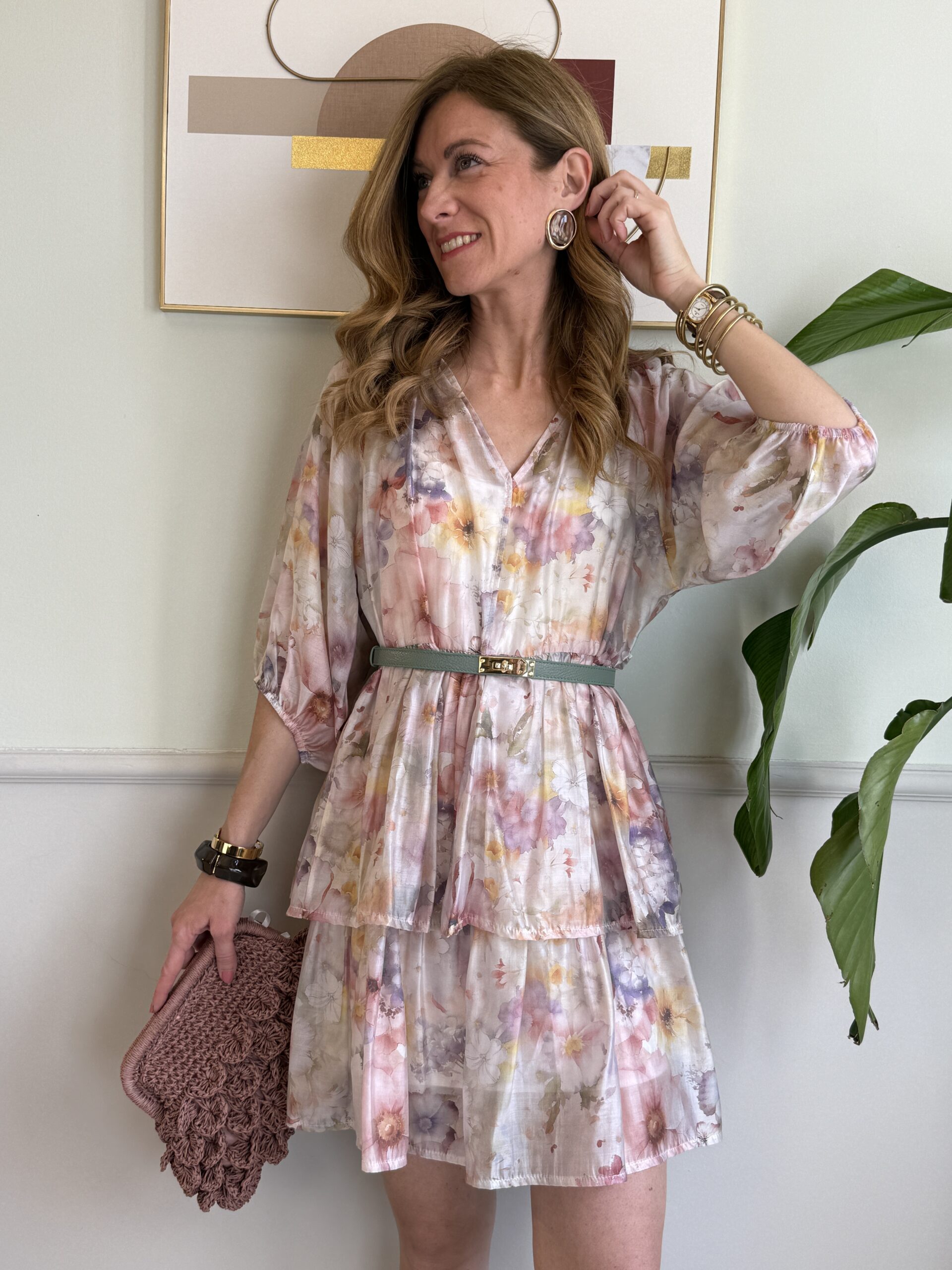 Abito corto in fantasia acquarello con gonna a balze. Corredato di sottoveste e cintura in corda. Scollo a V, manica a palloncino a 3/4.