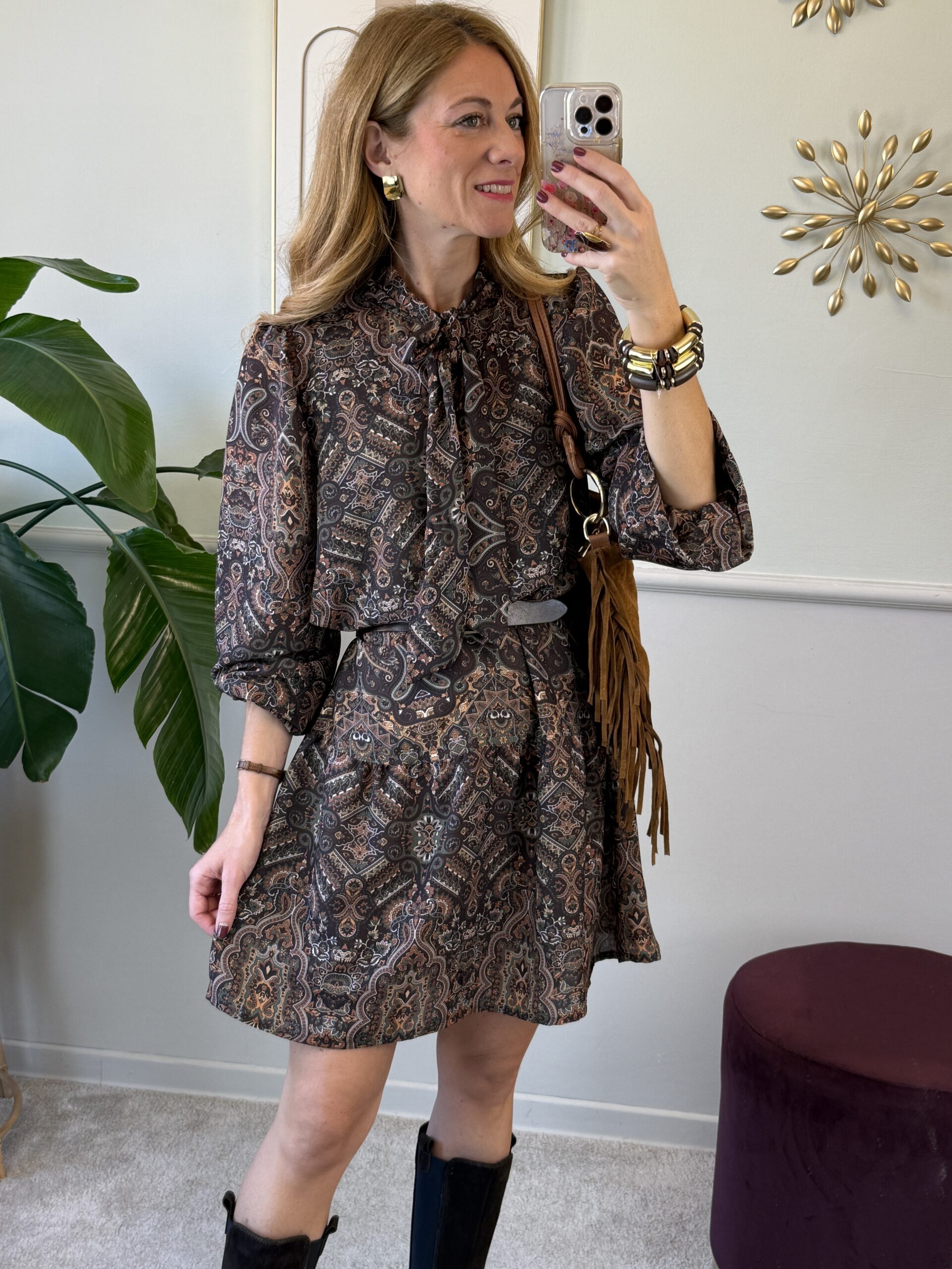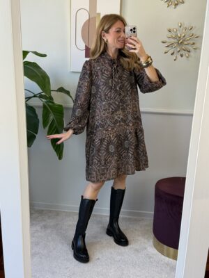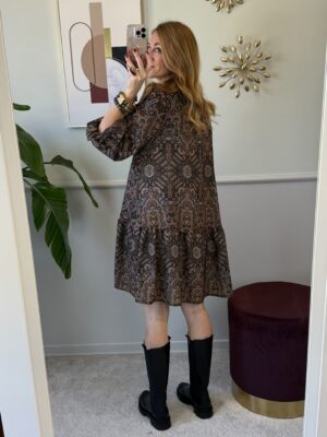 Abito in fantasia paisley a manica lunga con balza al fondo, laccetti al collo per fare il fiocco.