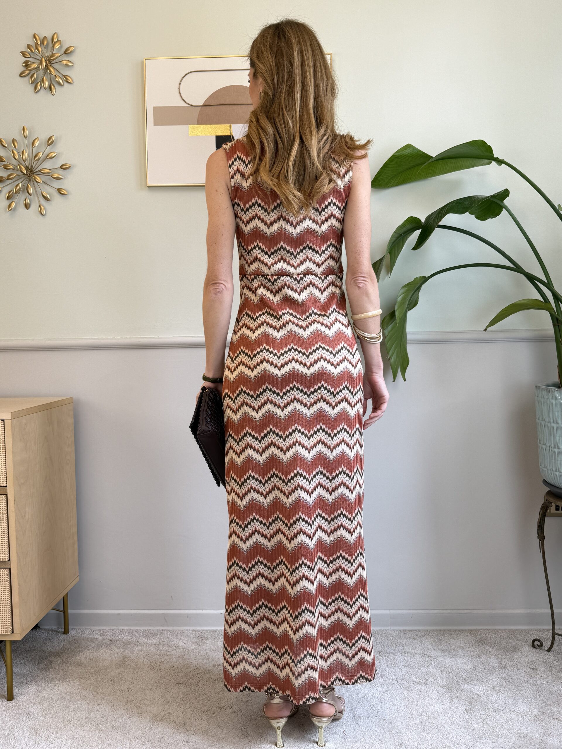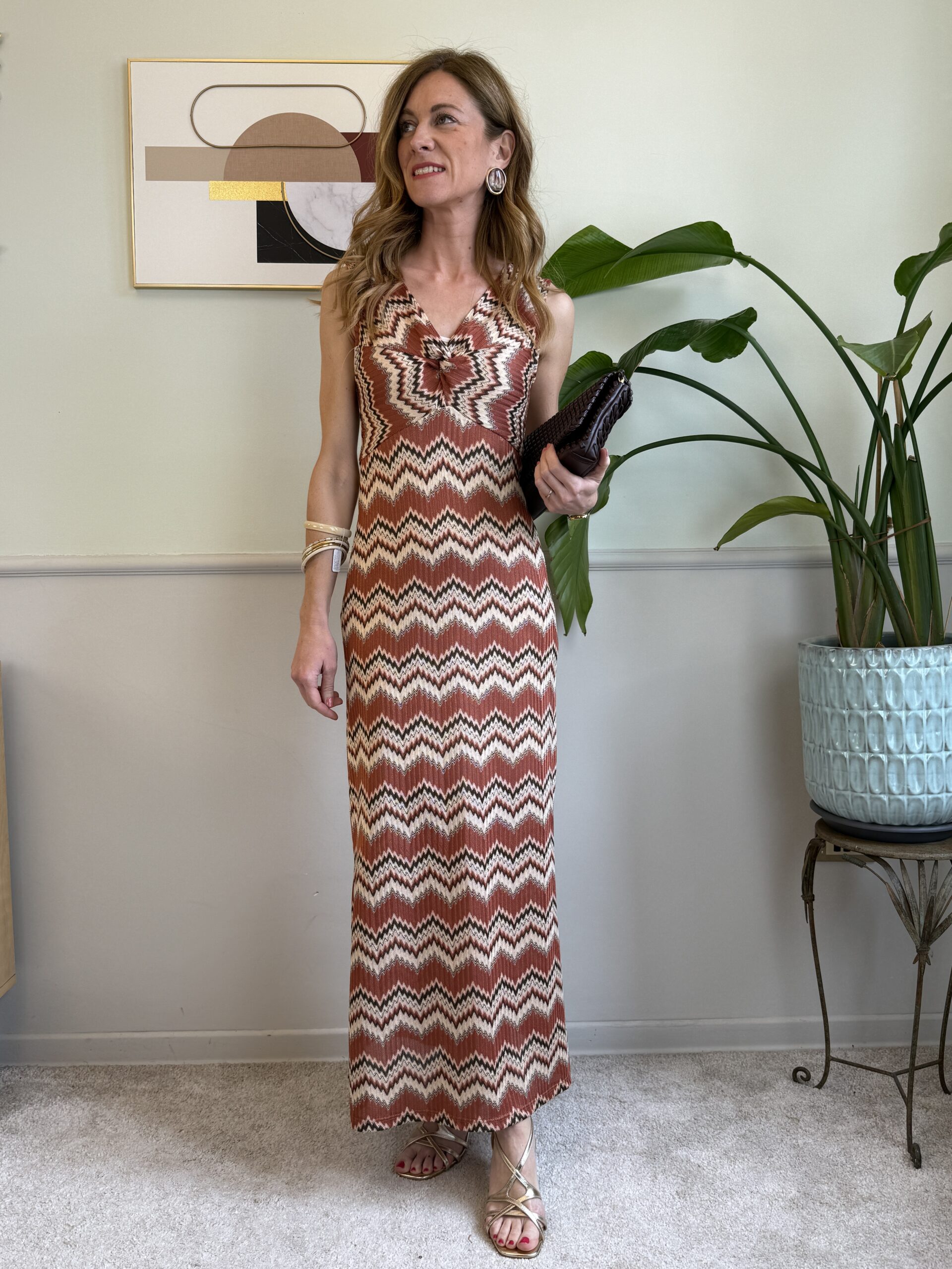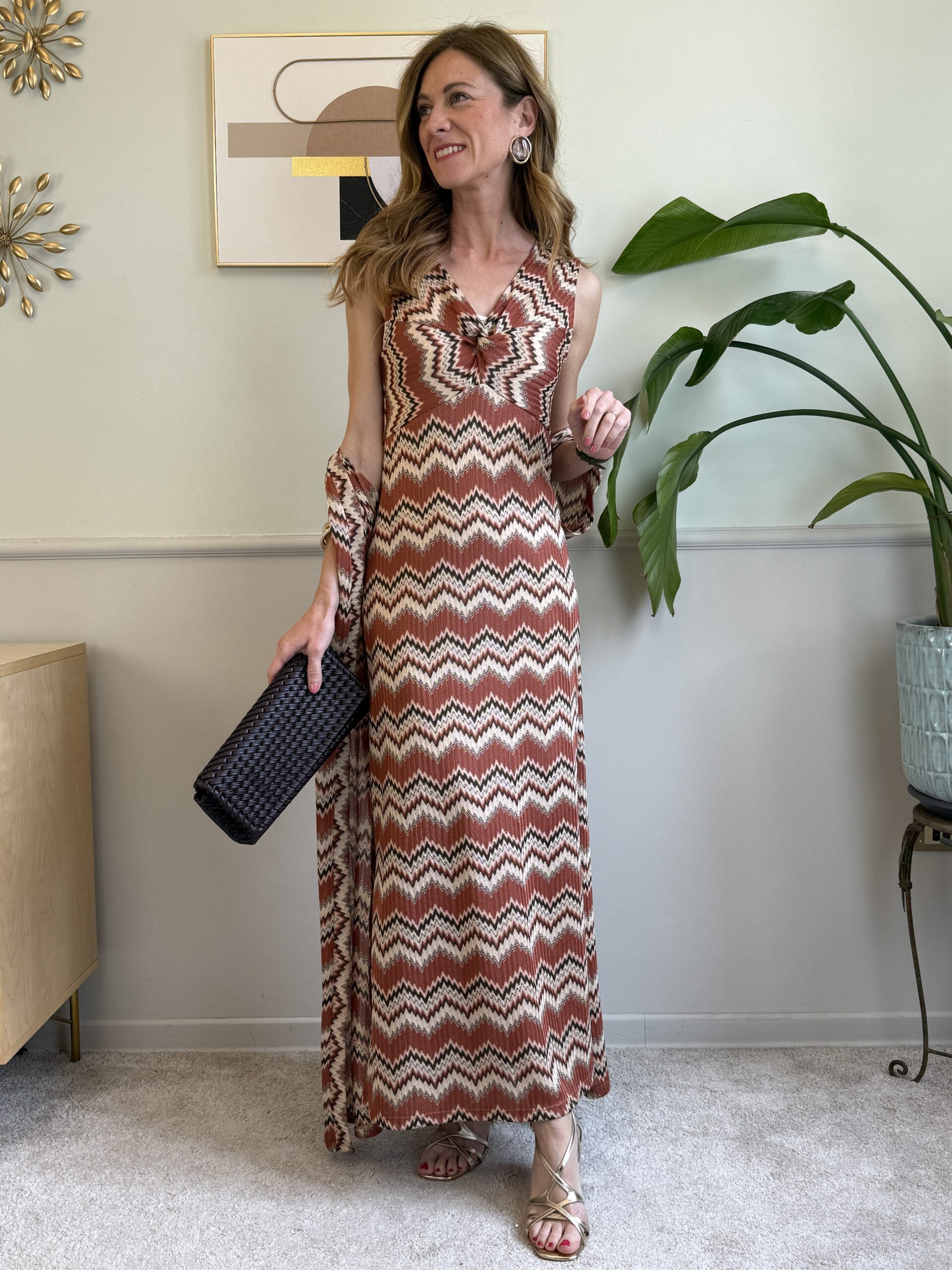 Abito lungo con nodo in fantasia sui toni del terracotta, moro, beige e rosa.