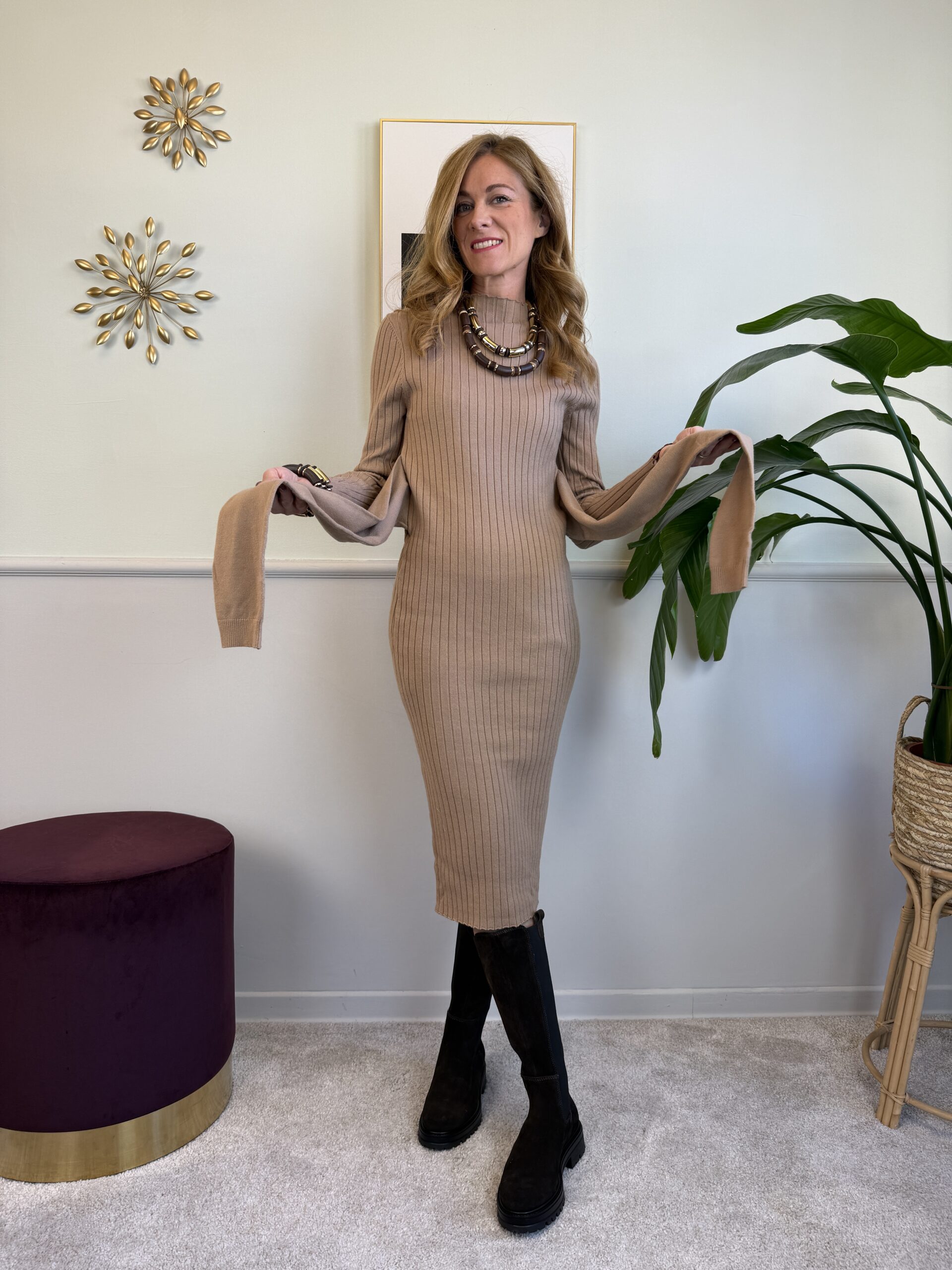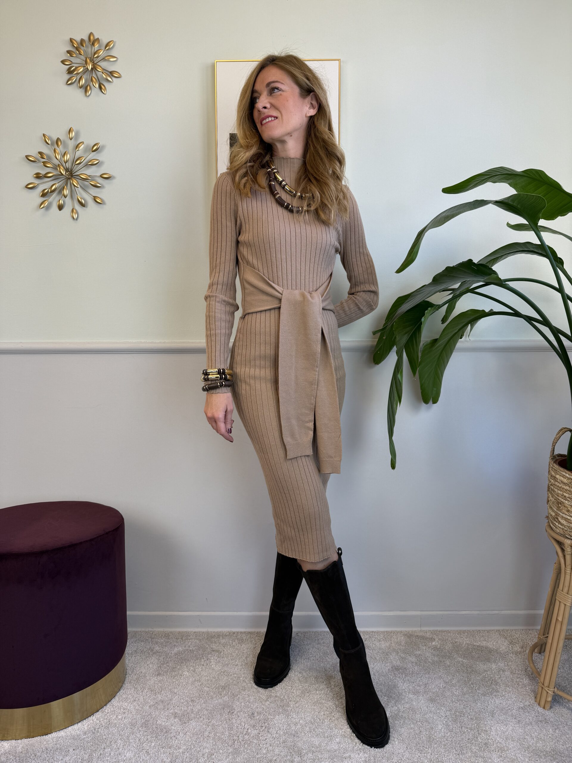 Abito midi in maglia a coste, “maniche” in vita che si legano davanti o dietro.
