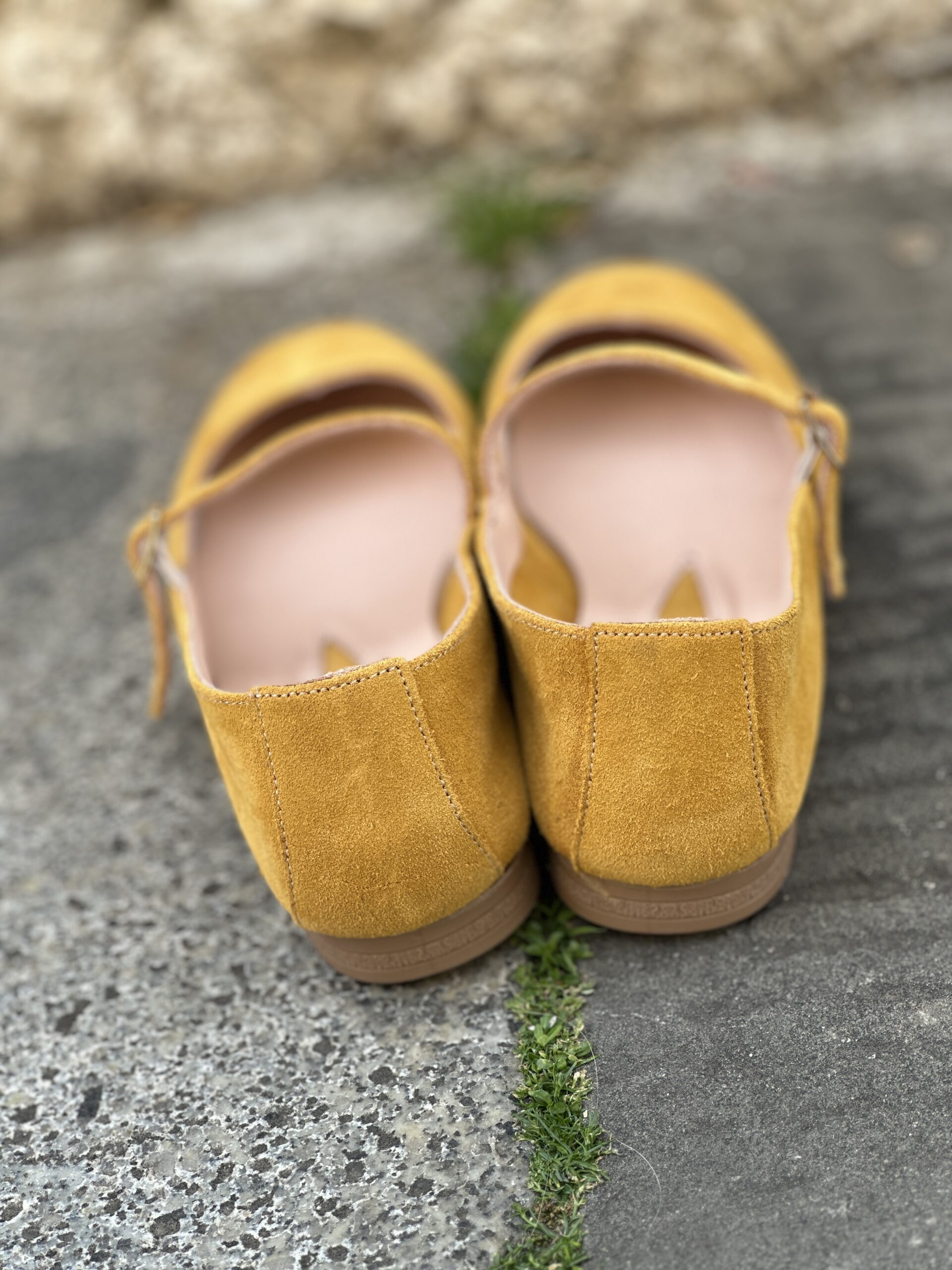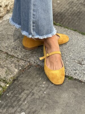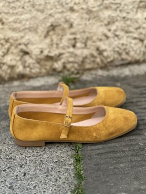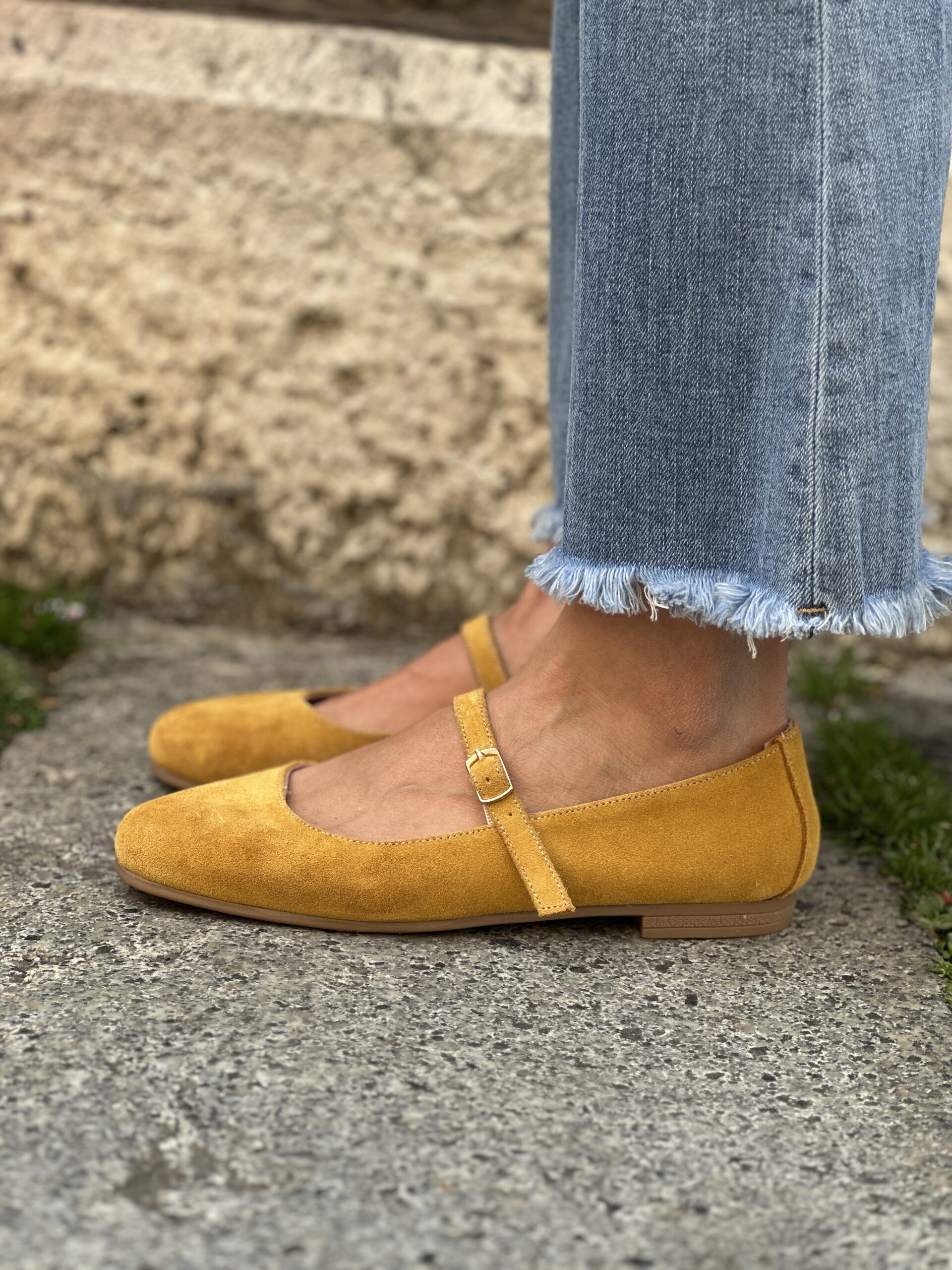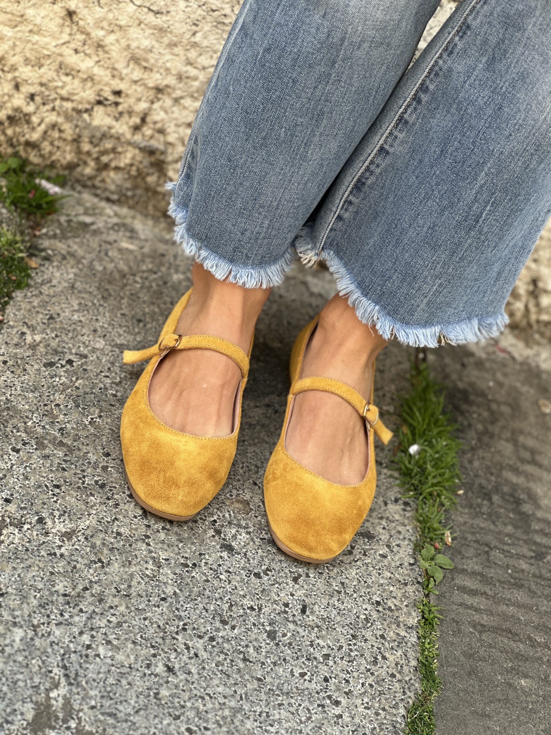 Ballerina in pelle scamosciata morbida con cinturino sul collo del piede regolabile e sottopiede in pelle.