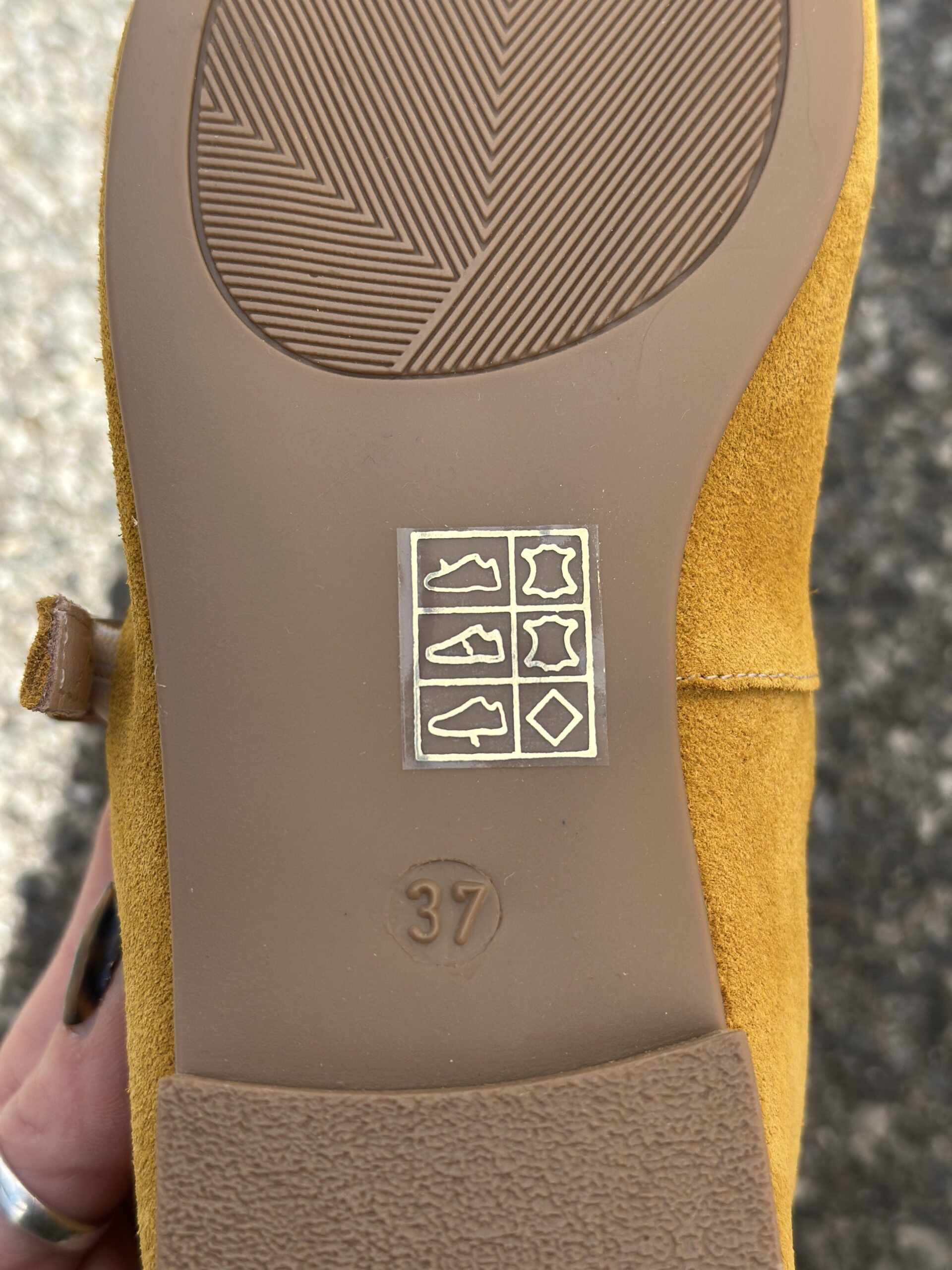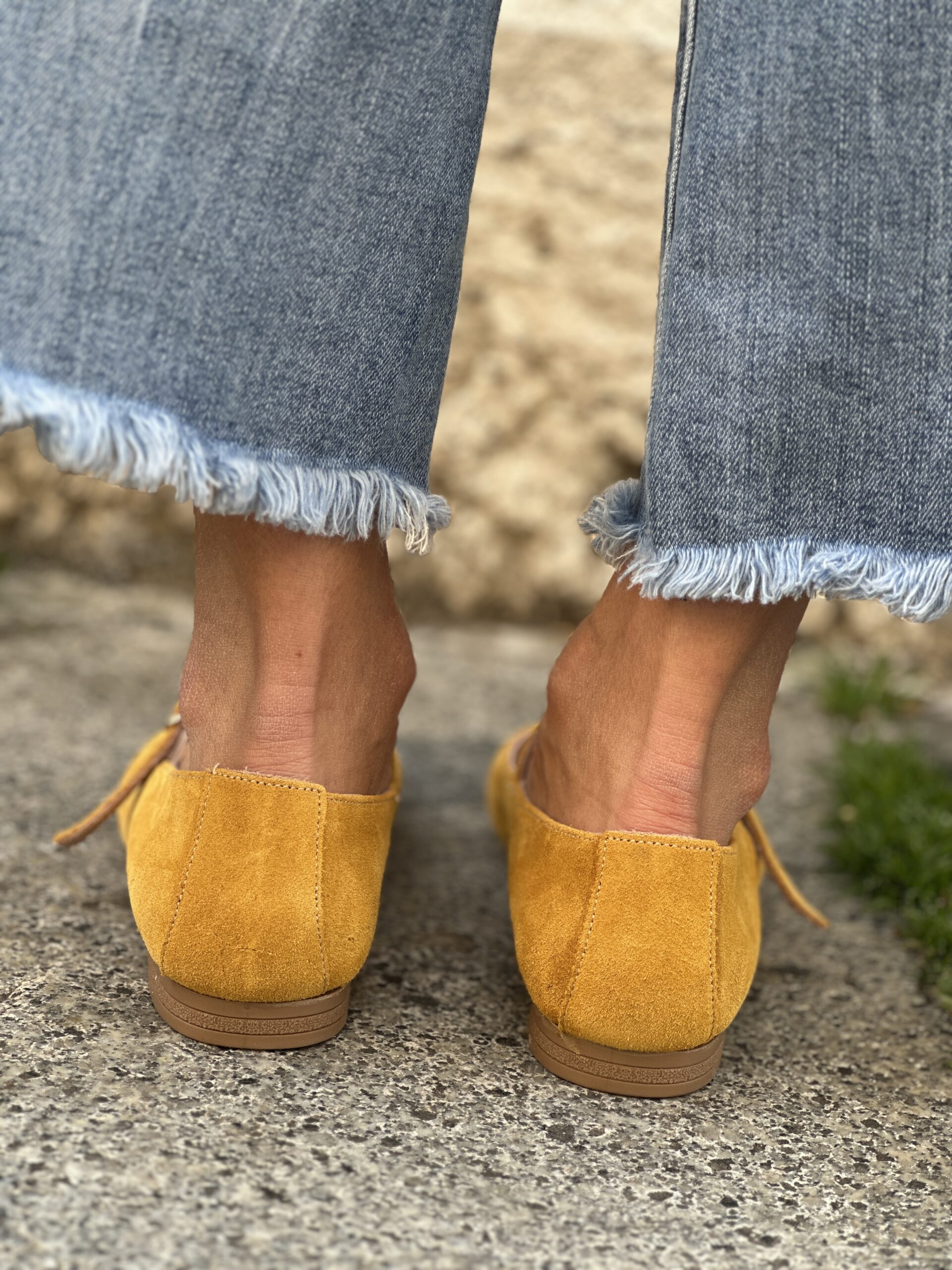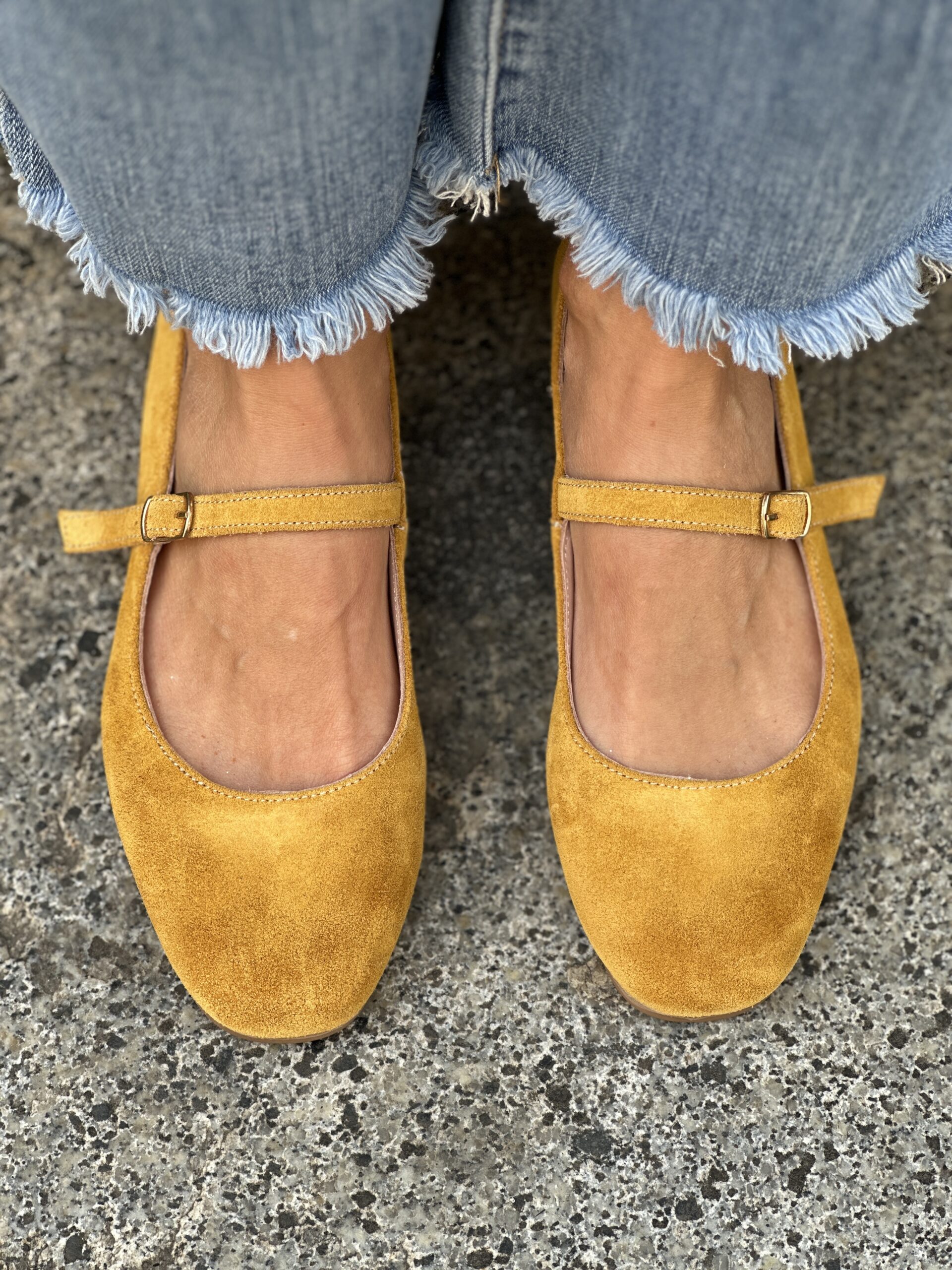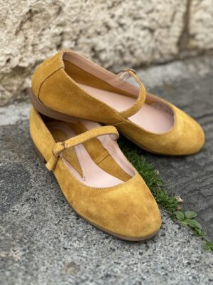 Ballerina in pelle scamosciata morbida con cinturino sul collo del piede regolabile e sottopiede in pelle.