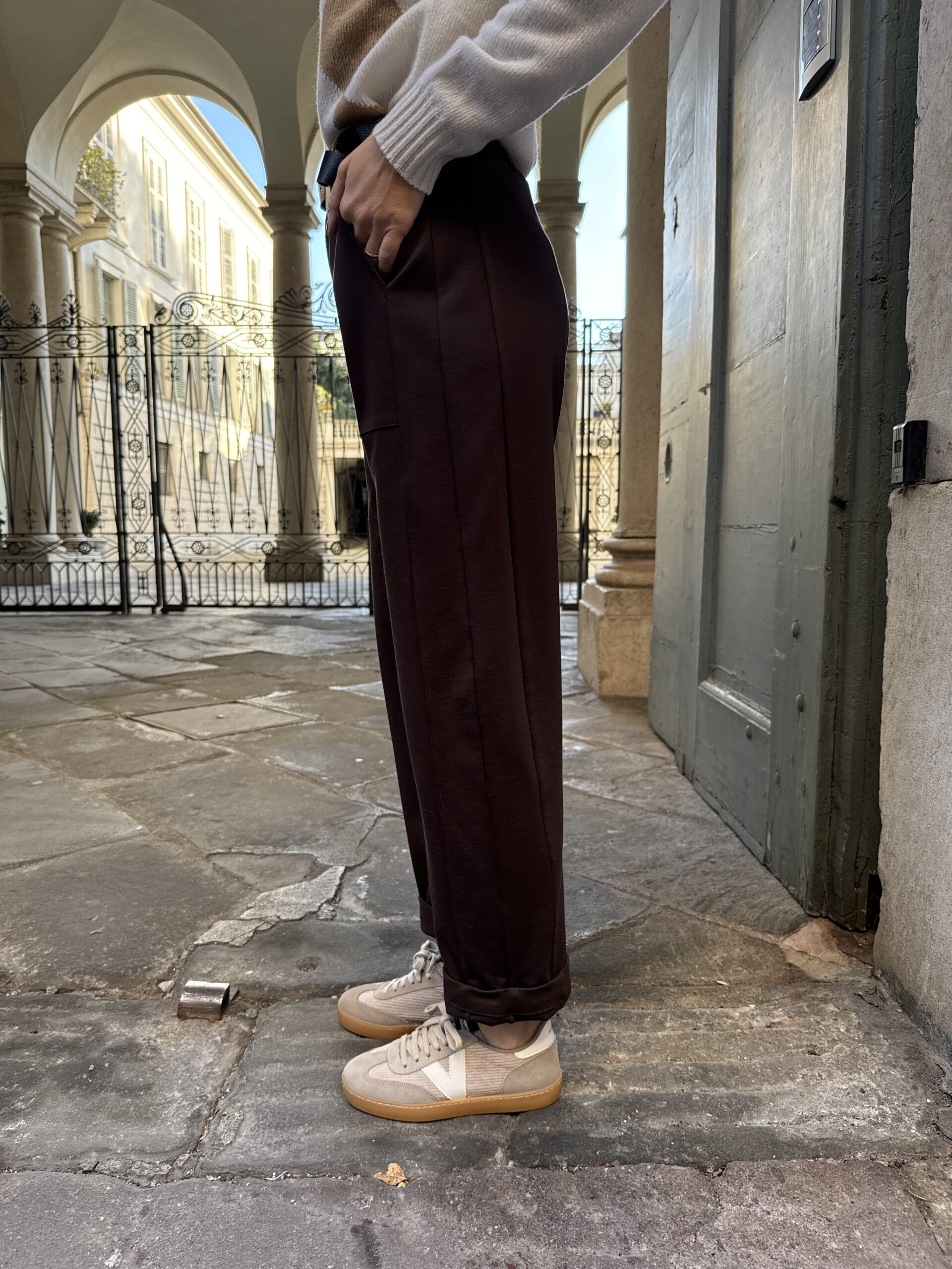 Pantalone barrel in punto Milano con cintura in ecopelle nera e risvolto al fondo. Vita alta con elastico posteriore, tasche applicate sul davanti, gamba morbida.