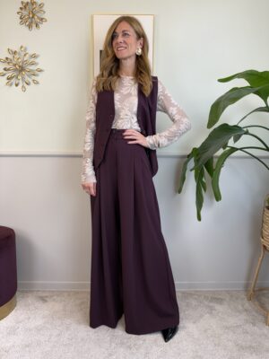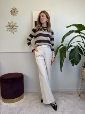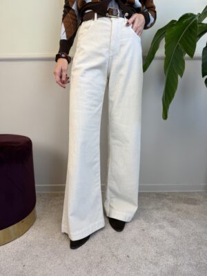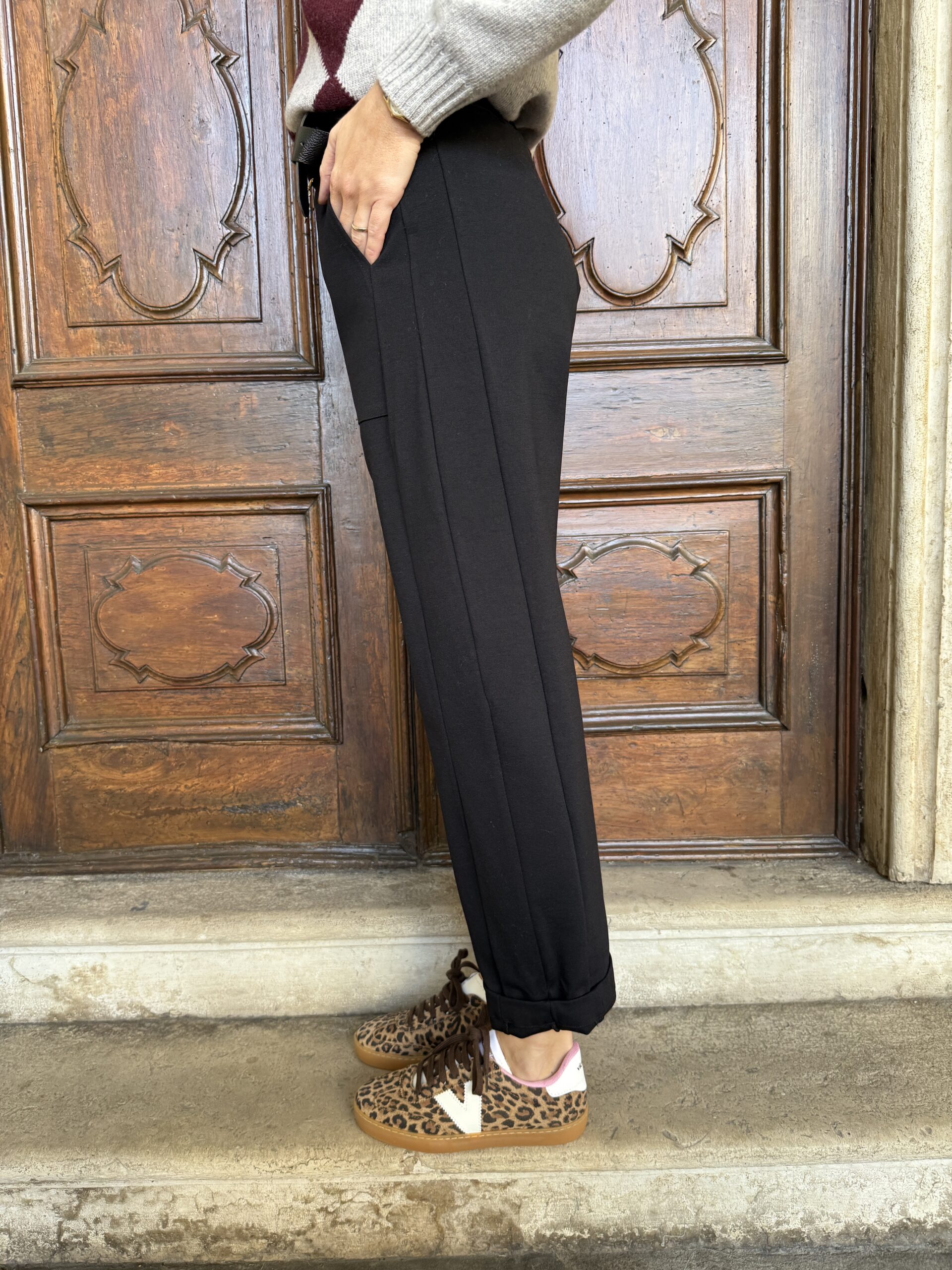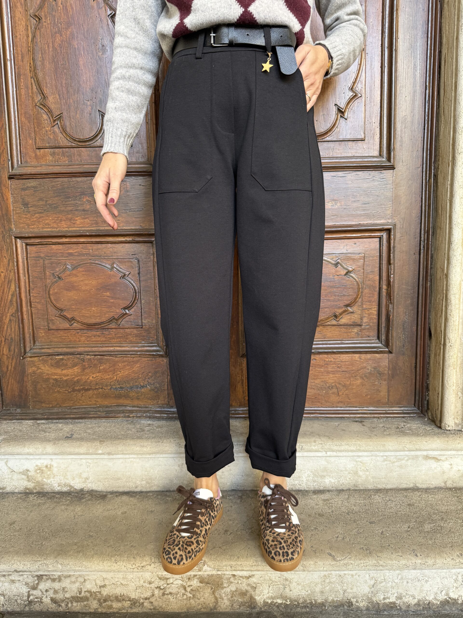 Pantalone barrel in punto Milano con cintura in ecopelle nera e risvolto al fondo. Vita alta con elastico posteriore, tasche applicate sul davanti, gamba morbida.