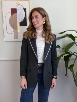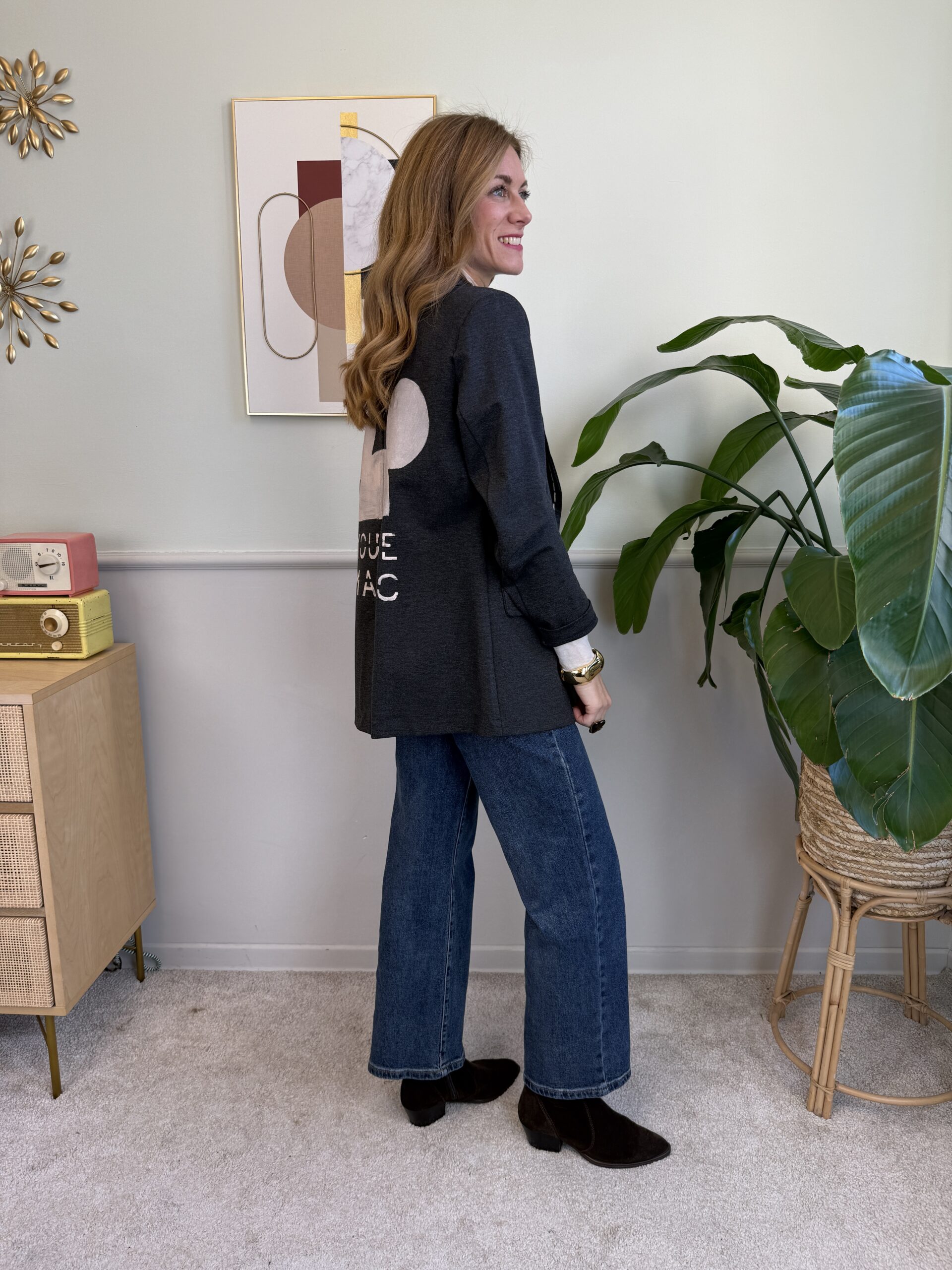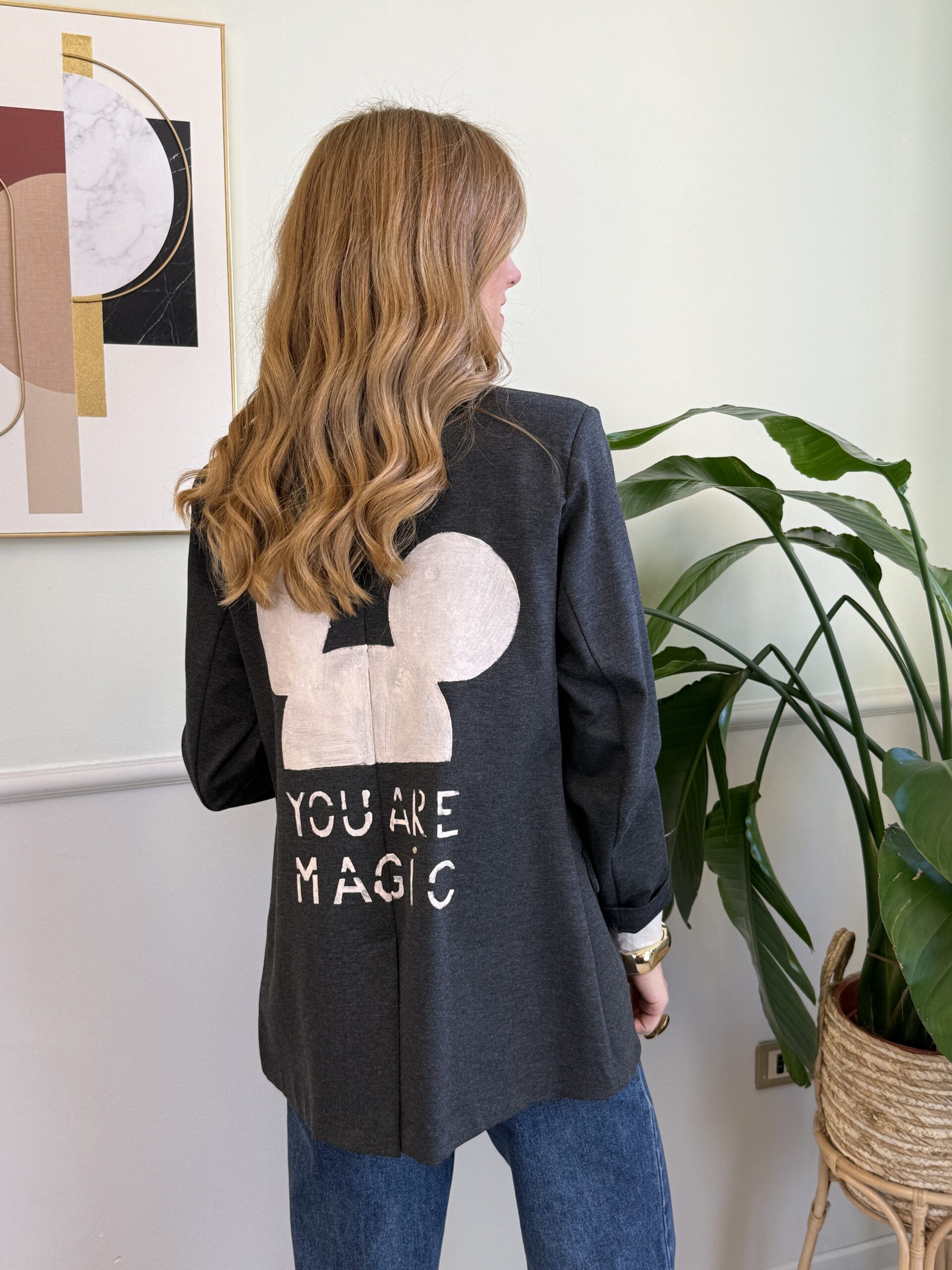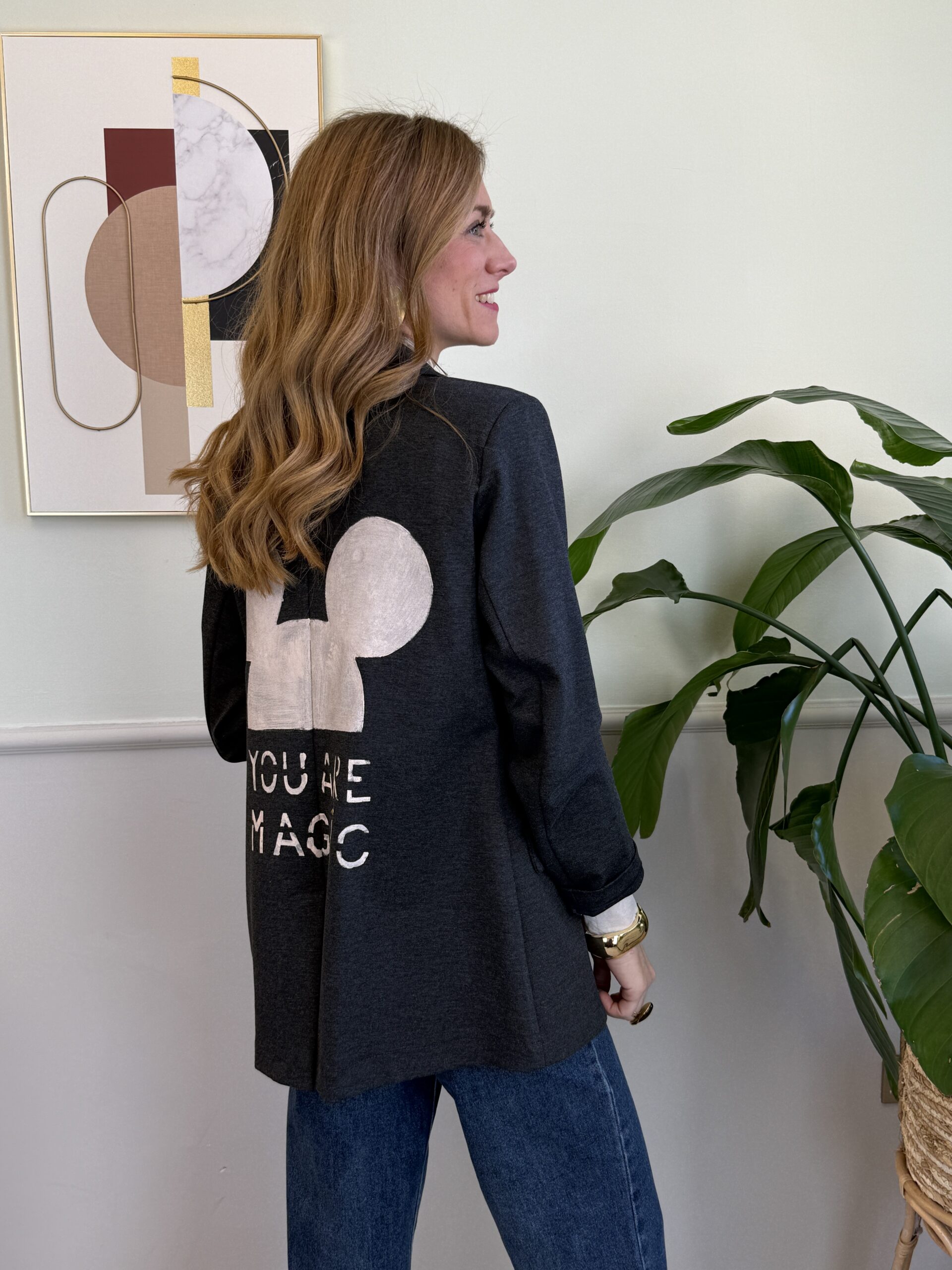 Blazer in punto Milano con “Topolino” sul retro e scritta “You are magic”.
