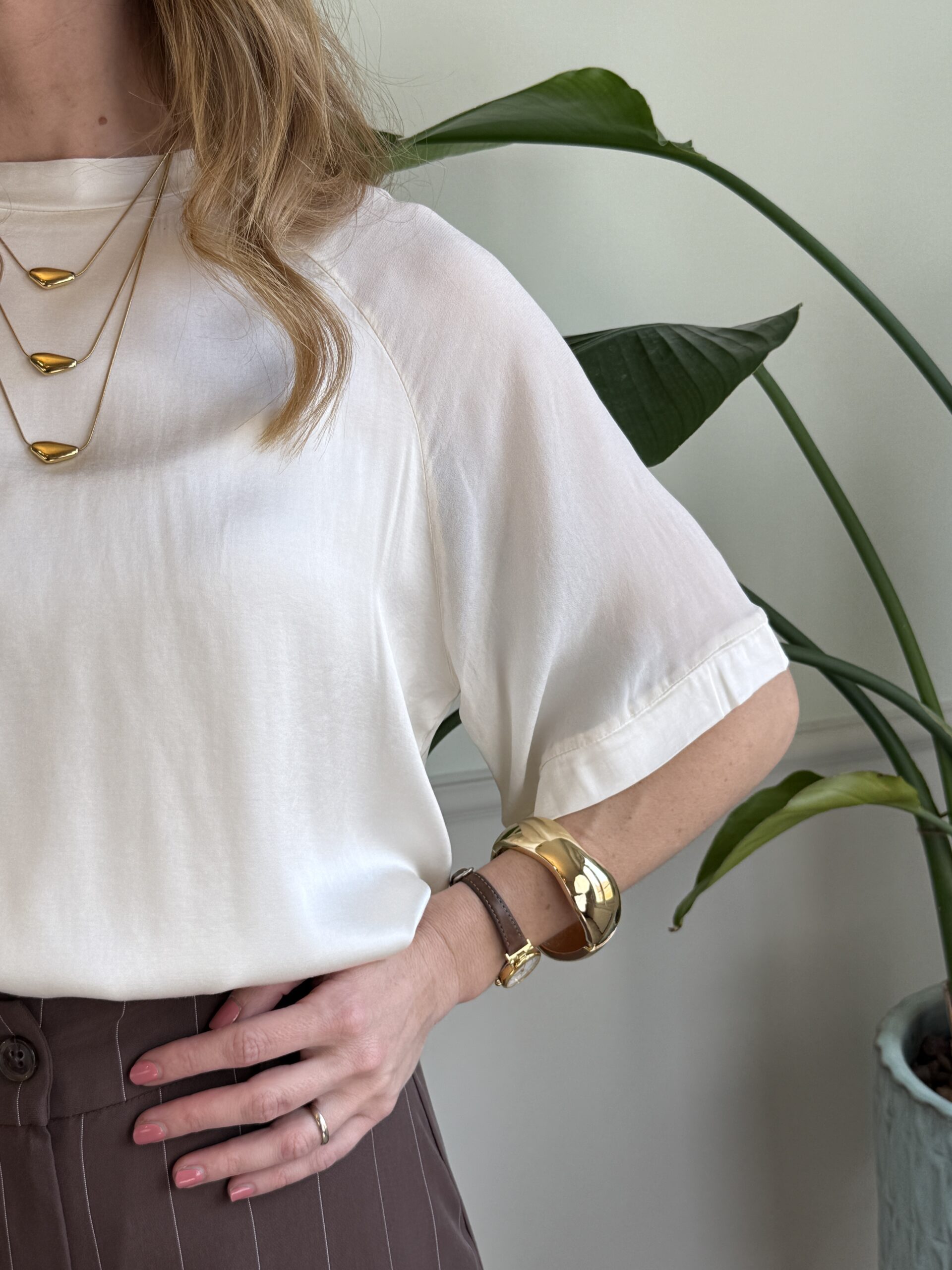 Blusa in raso girocollo con manica raglan in voile.