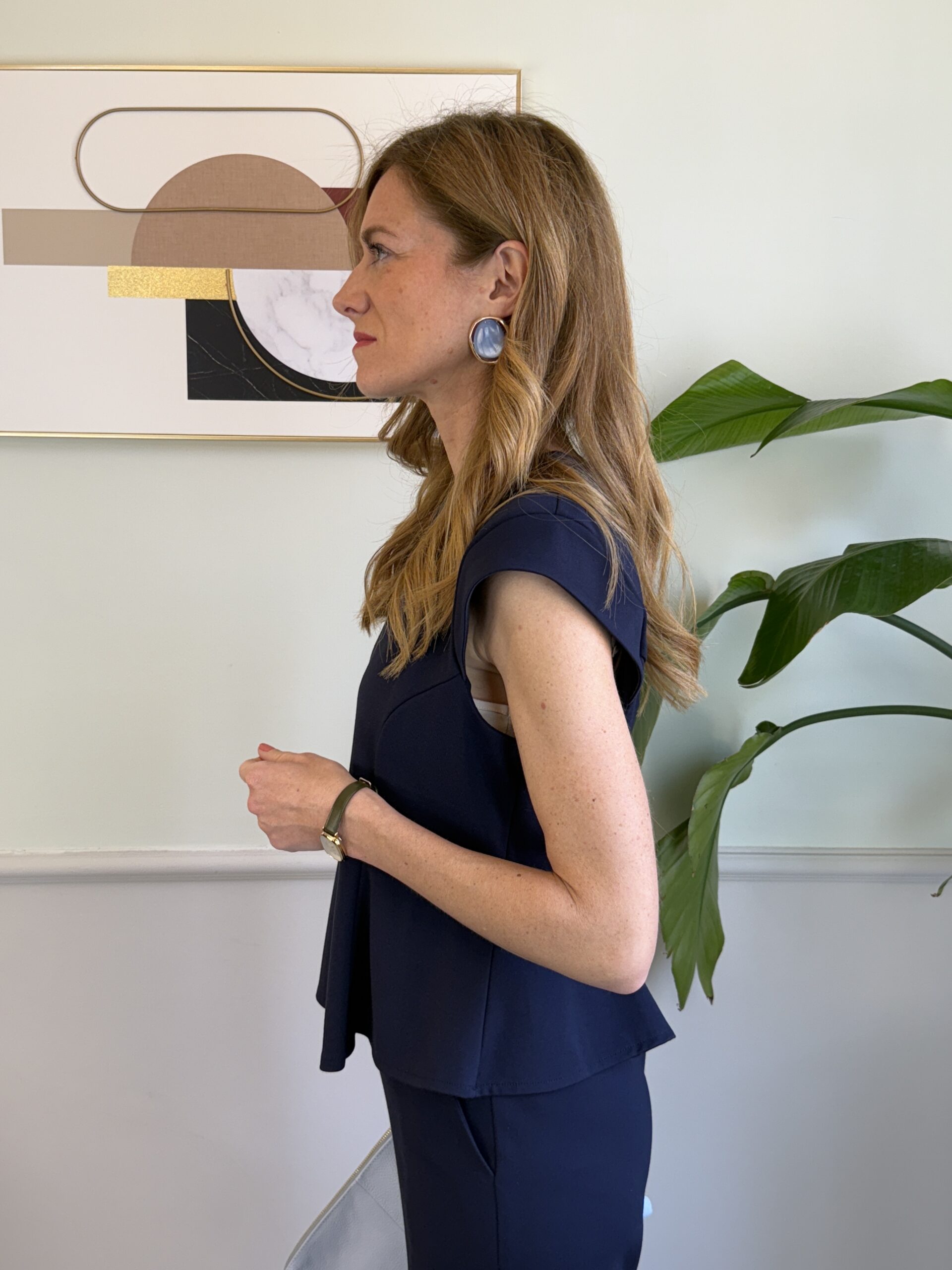 Blusa peplo in punto Milano, girocollo con spallina imbottita.