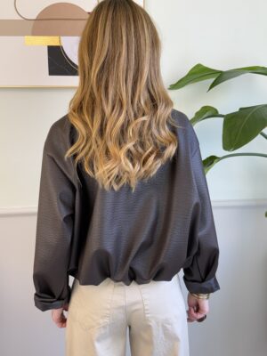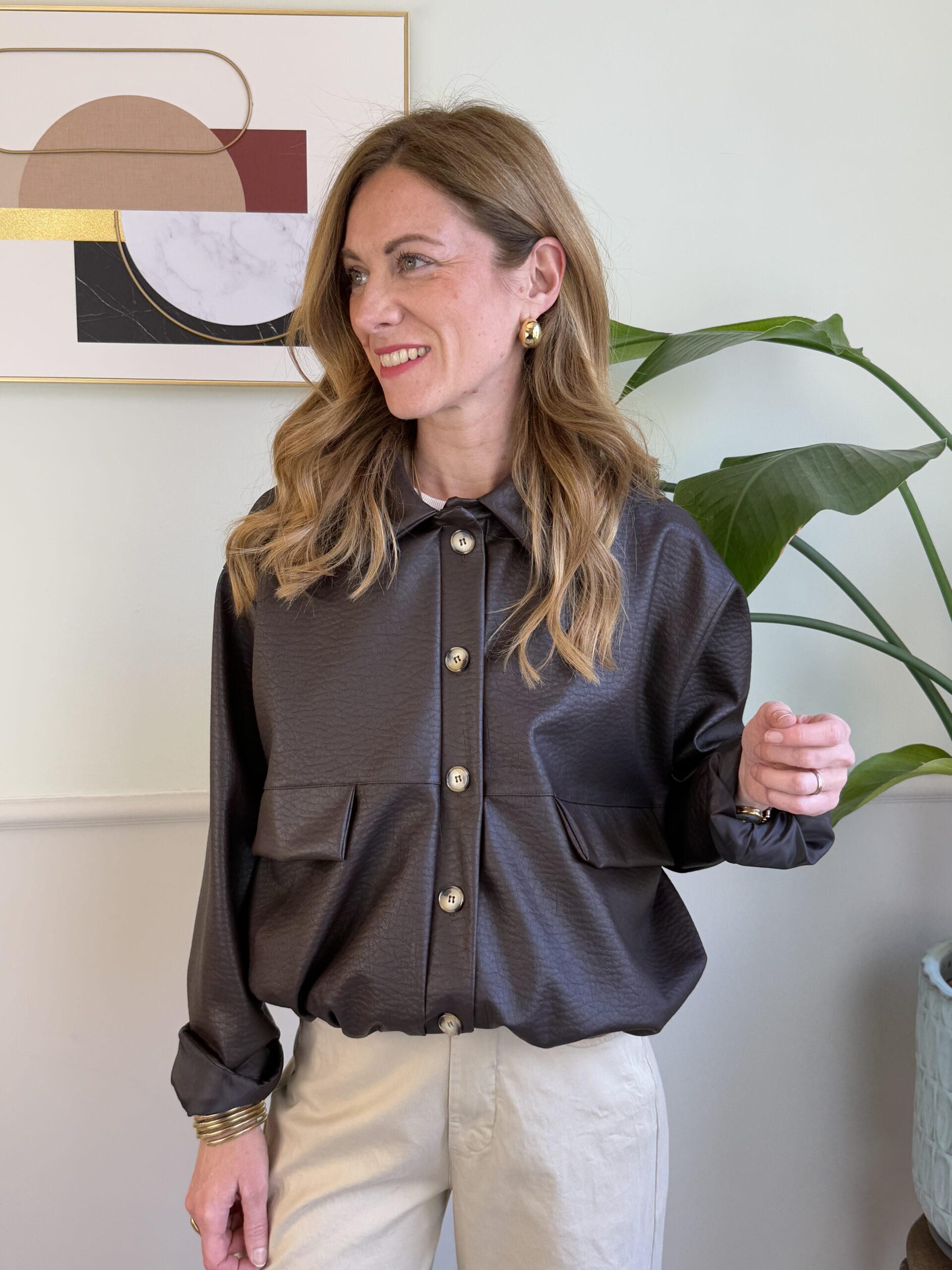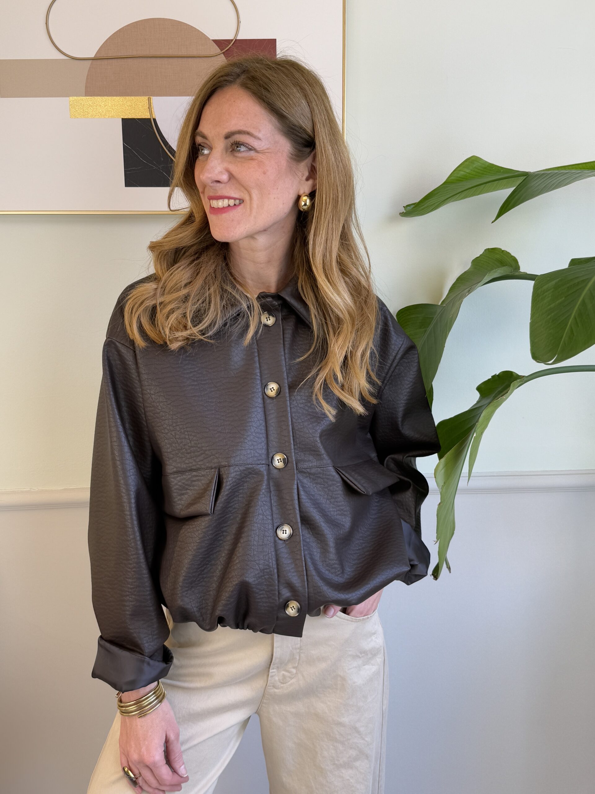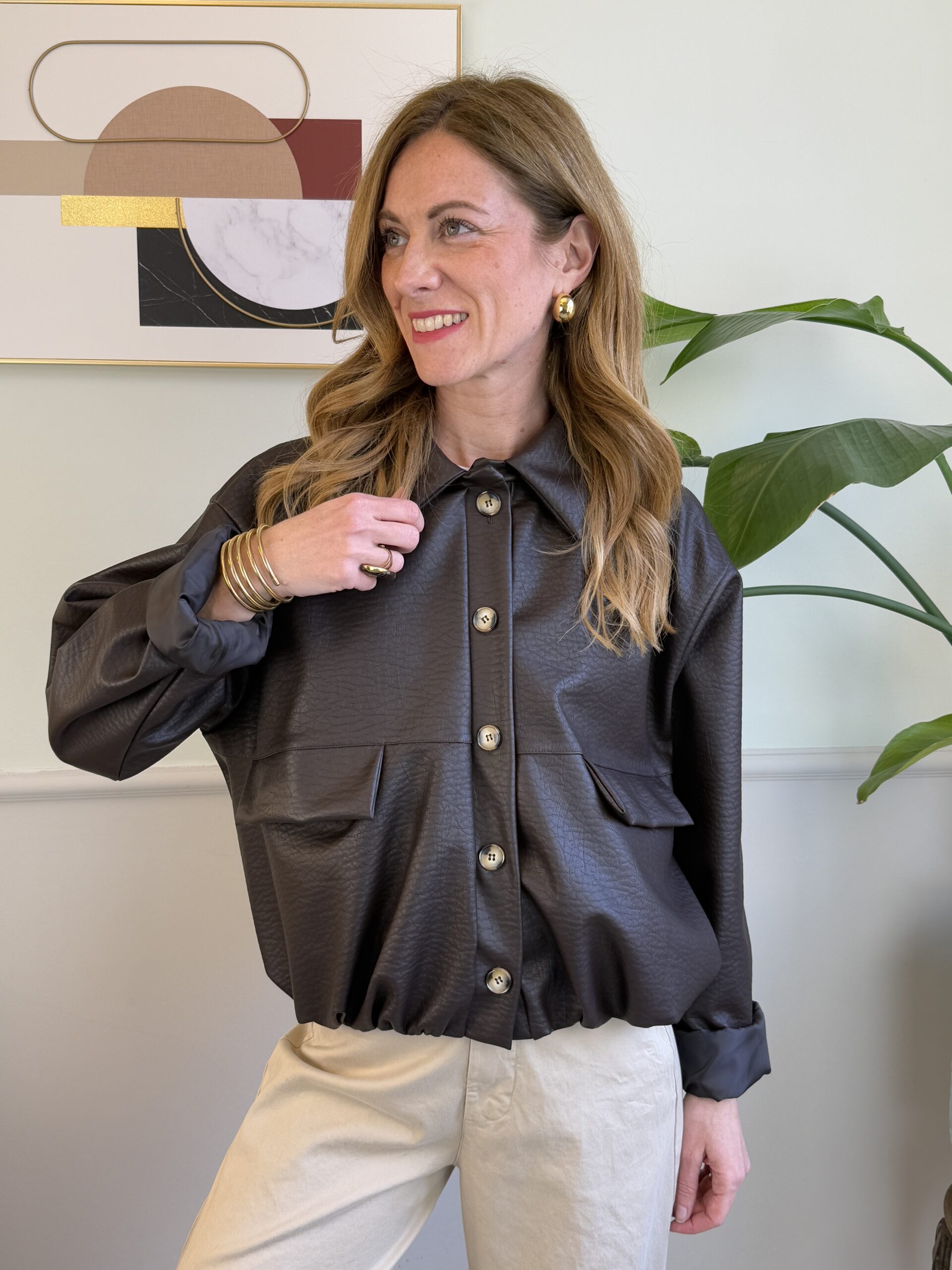 Bomber in eco-pelle effetto goffrato. Colletto camicia, tasche sul davanti e tessuto arricciato e bombato al fondo. Interno foderato.