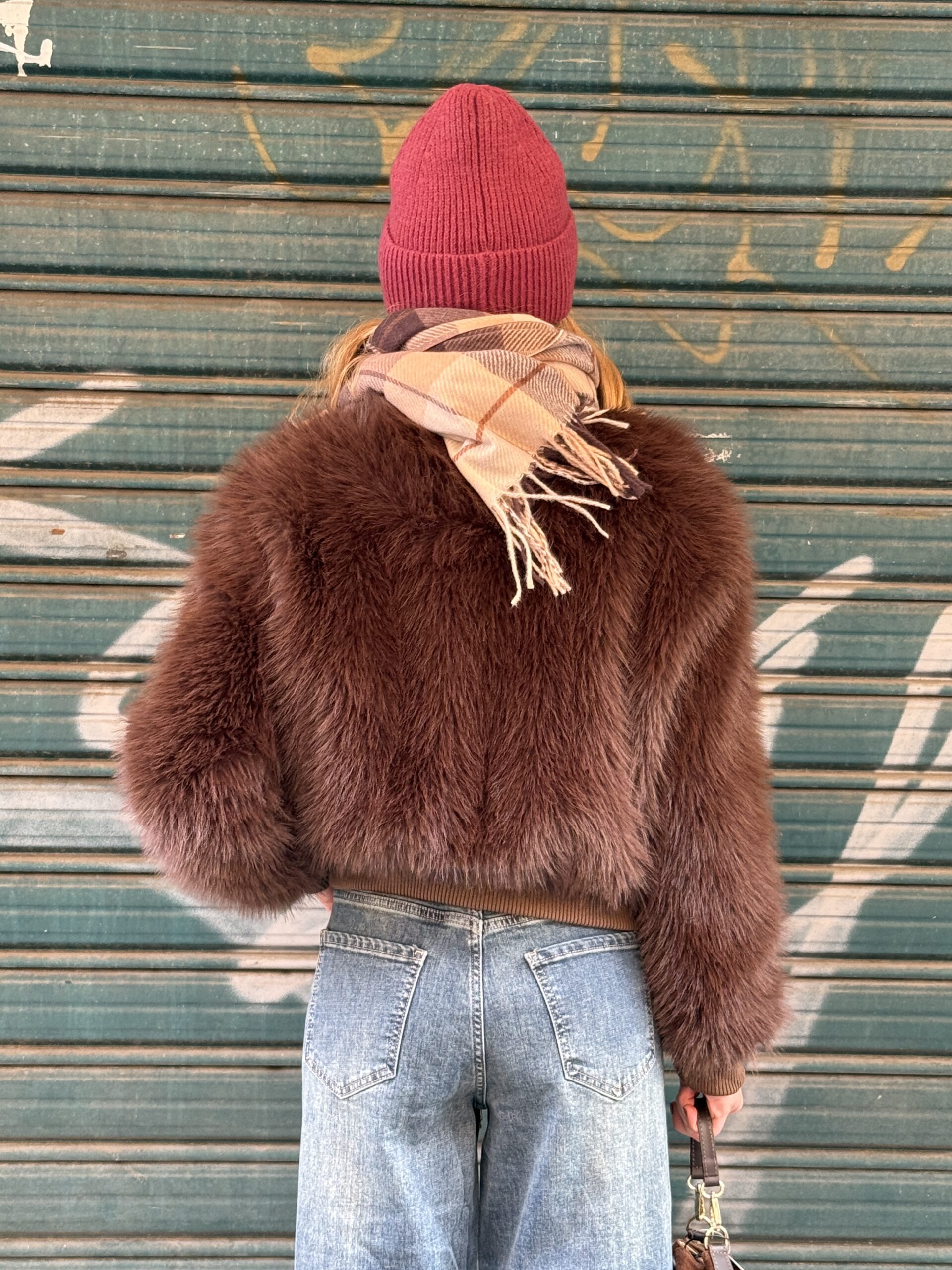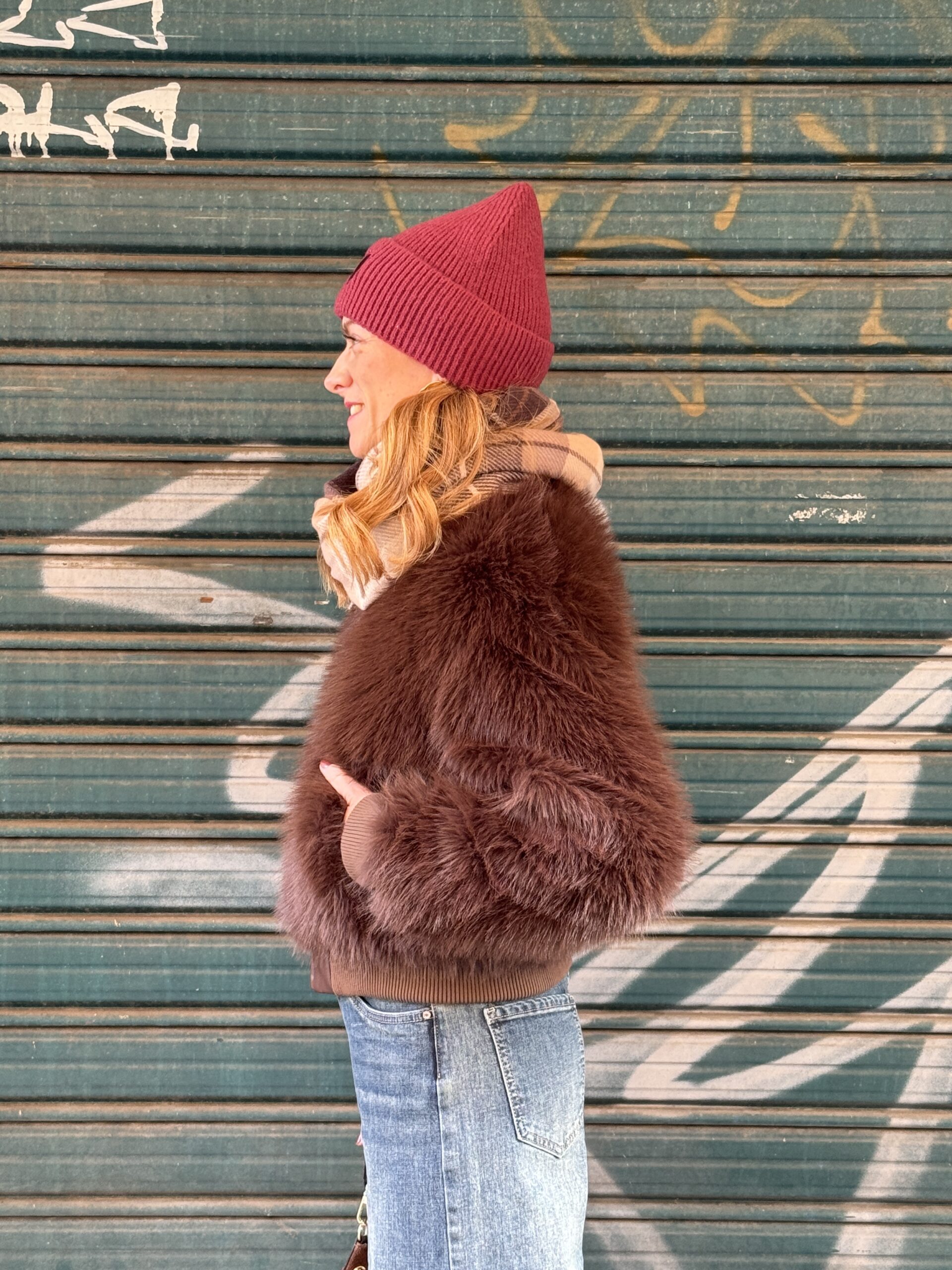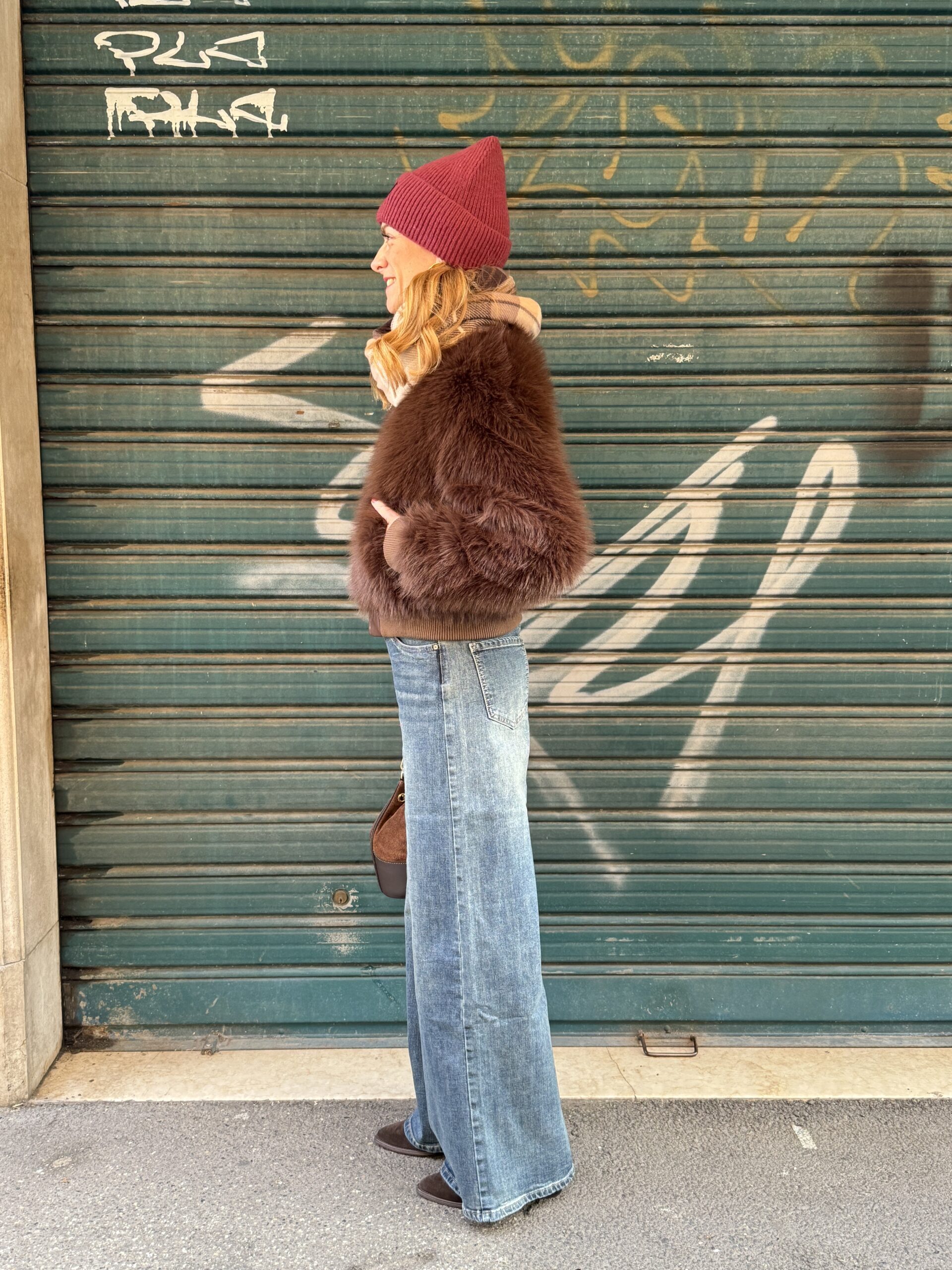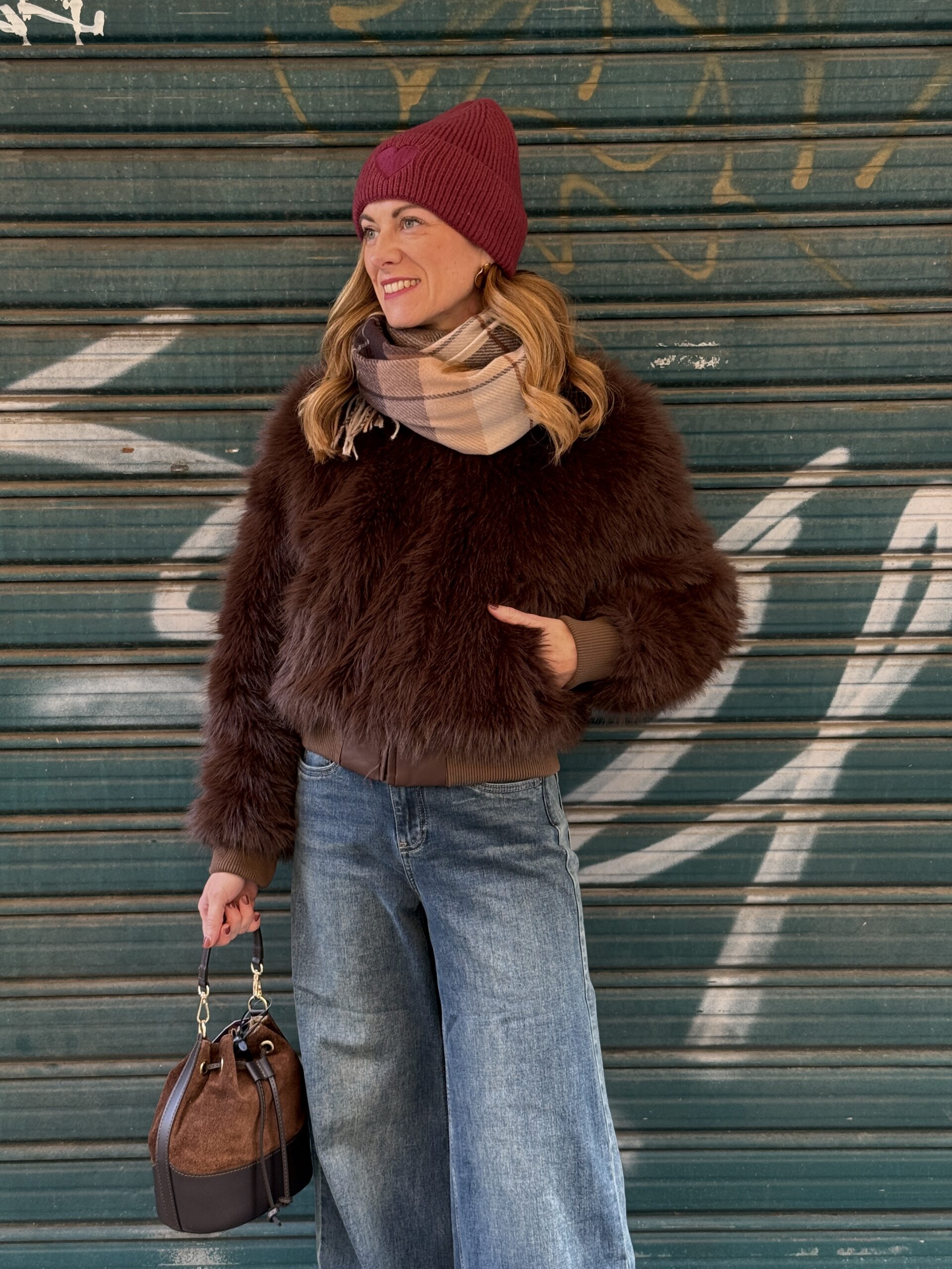 Bomberino in eco-pelliccia nero con profili in ecopelle, orli elasticizzati e tasche sul davanti.