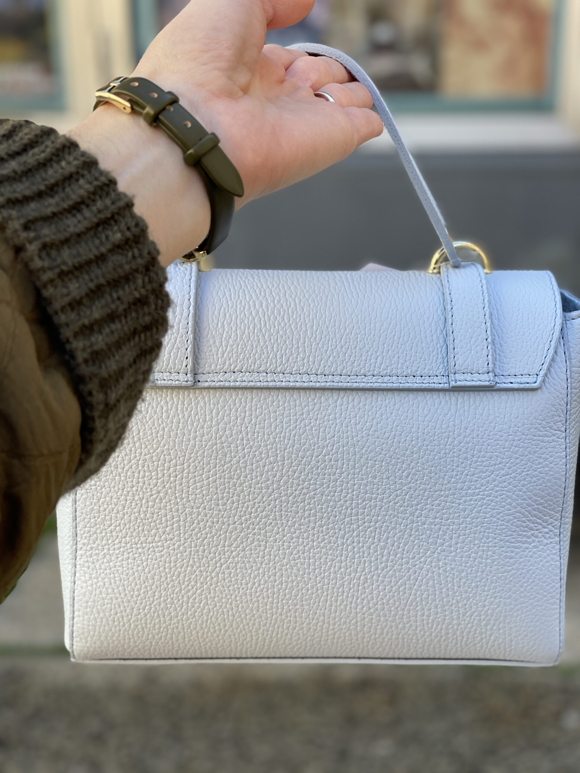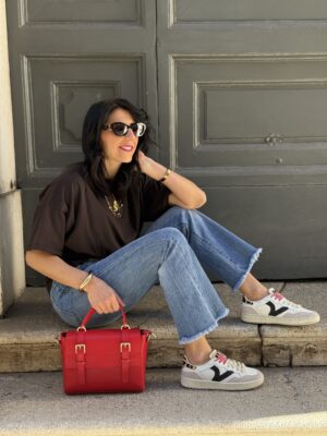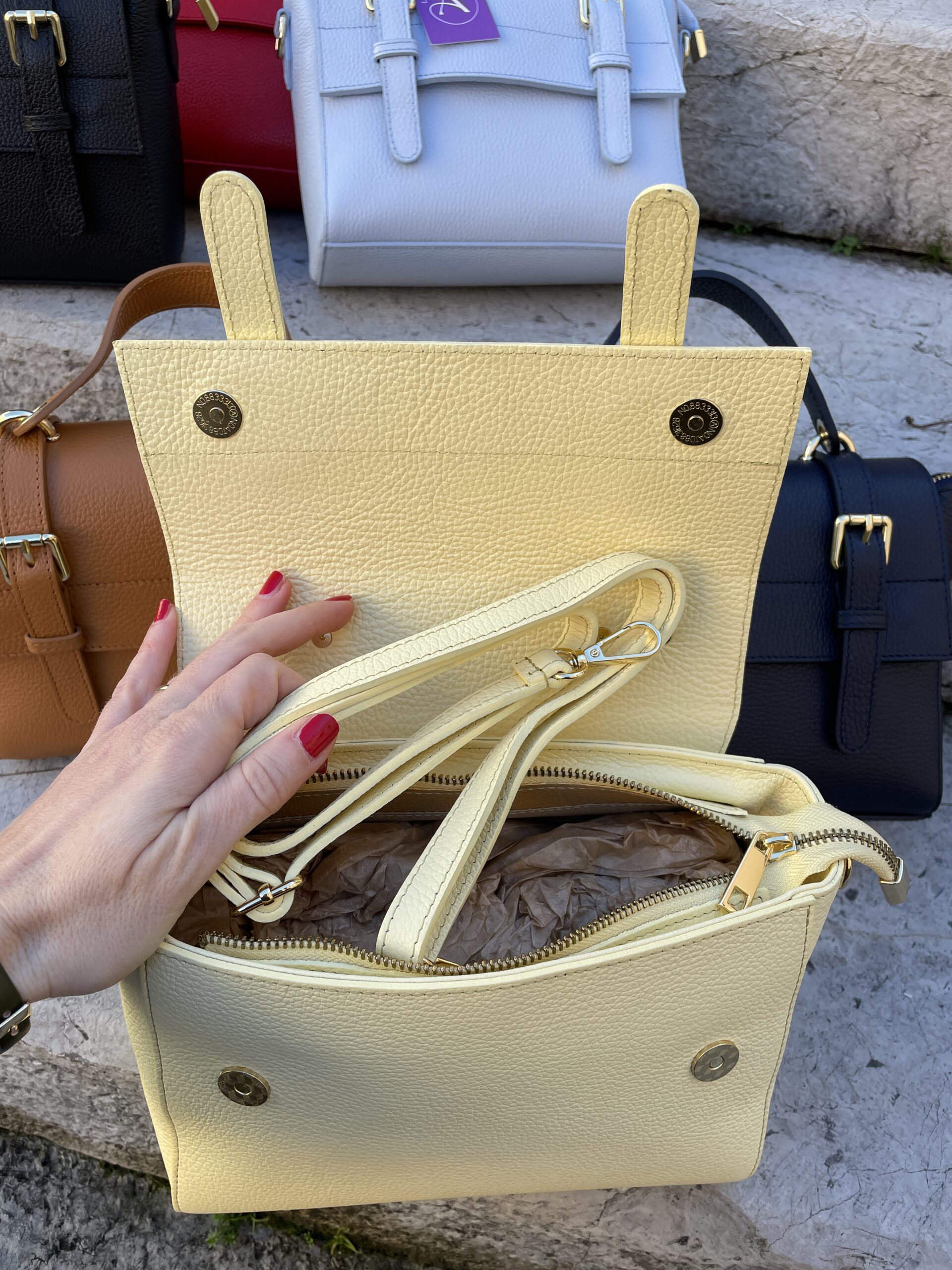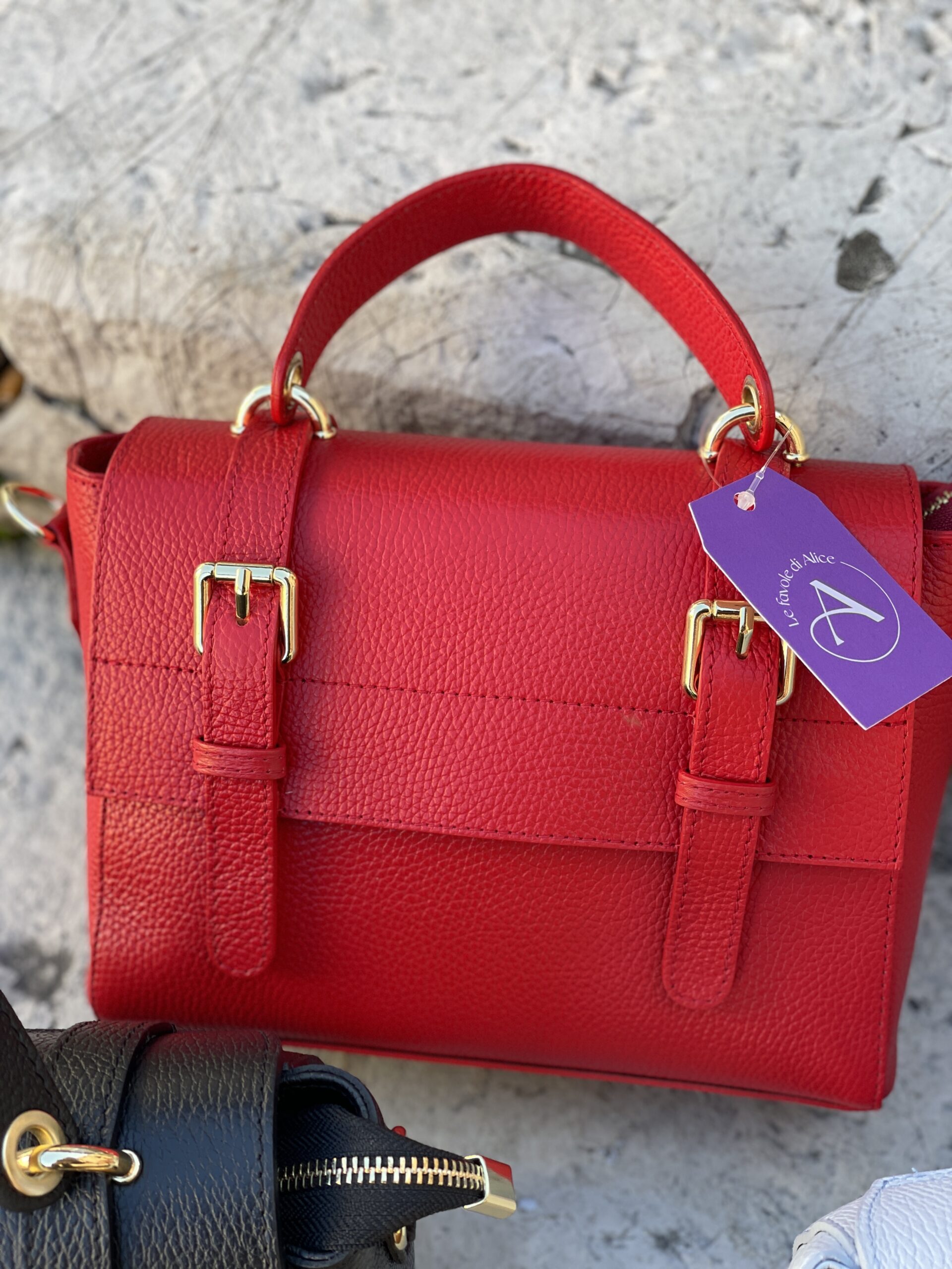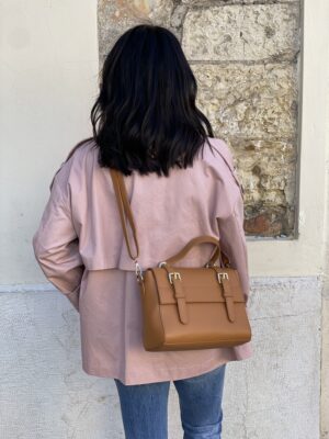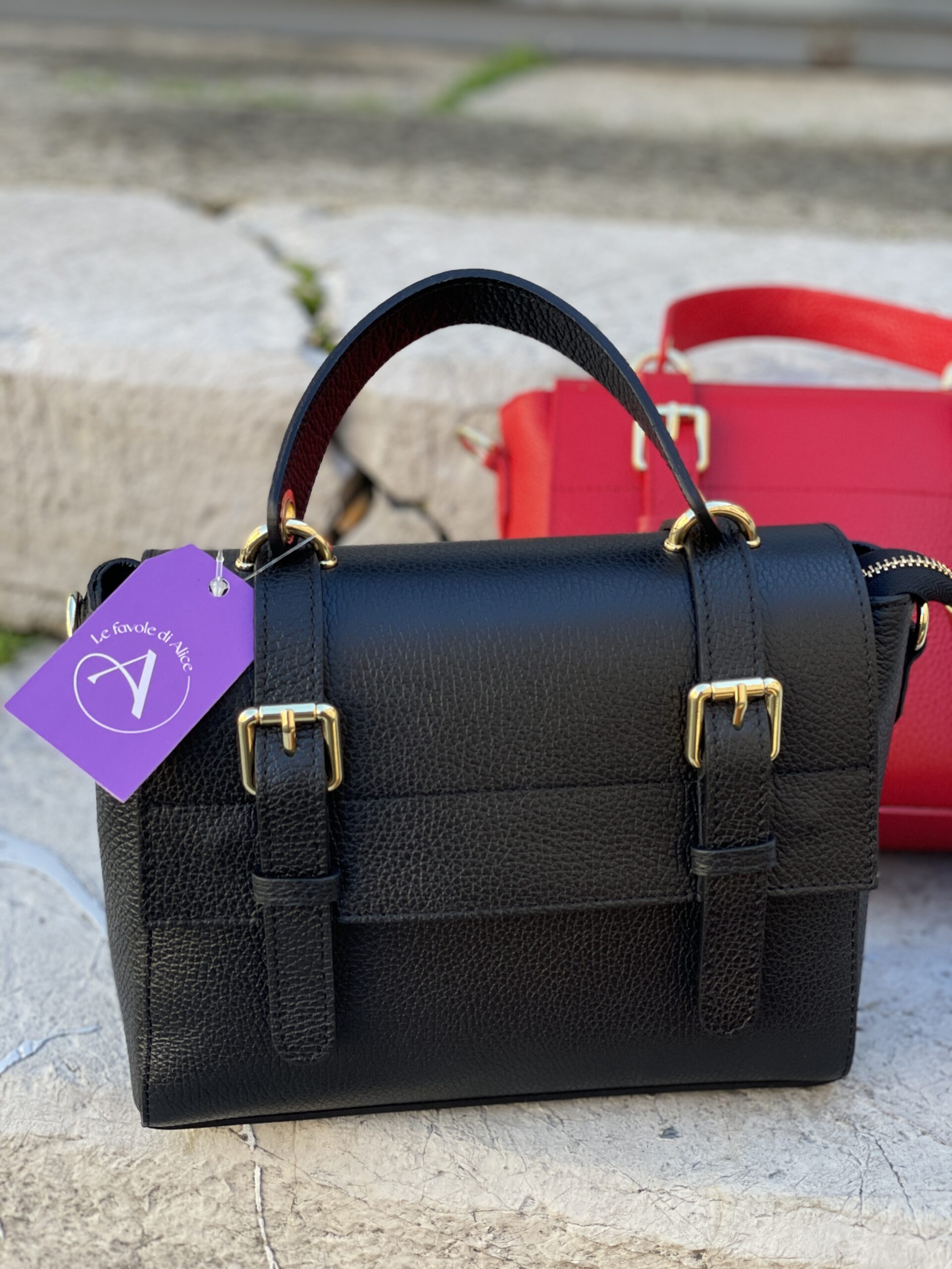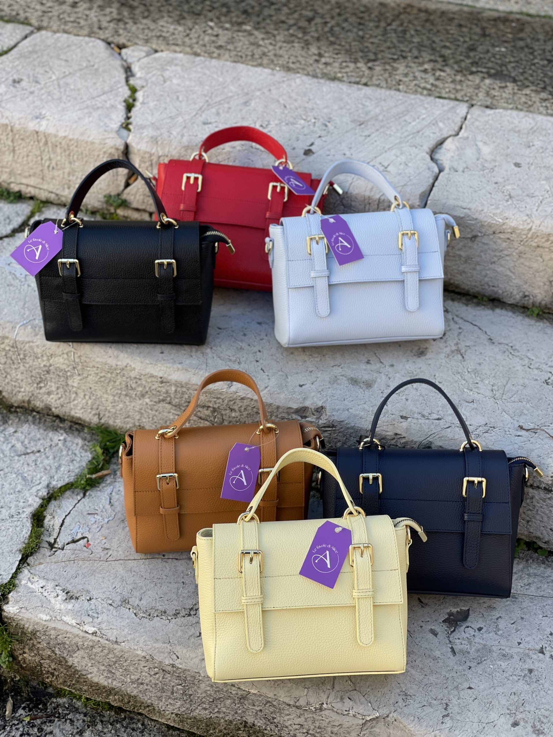 Realizzata in vera pelle, è dotata di zip sotto patella e di tracolla regolabile.