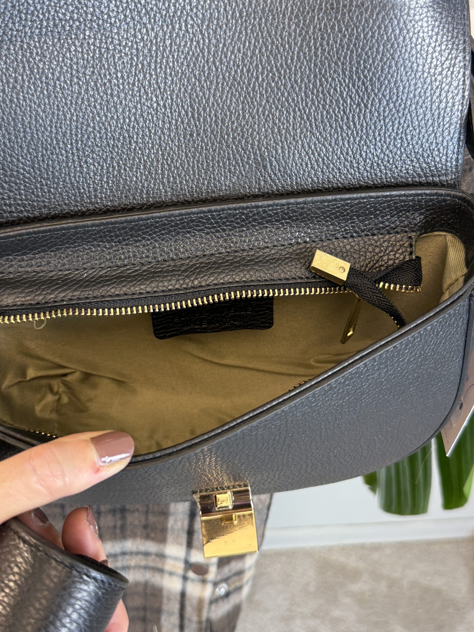 Bora mezza luna in pelle con tracolla, interno foderato, chiusura con zip, dettagli dorati.