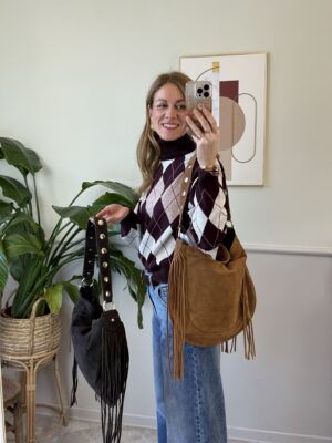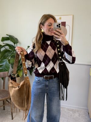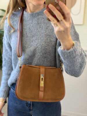 Borsa in pelle scamosciata con patella decorata da borchiette piatte dorate.
