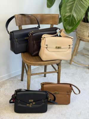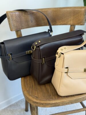 Interno foderato, chiusura con zip e patella, tasca con zip posteriore, tracolla in pelle.