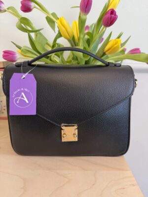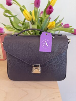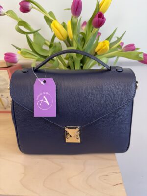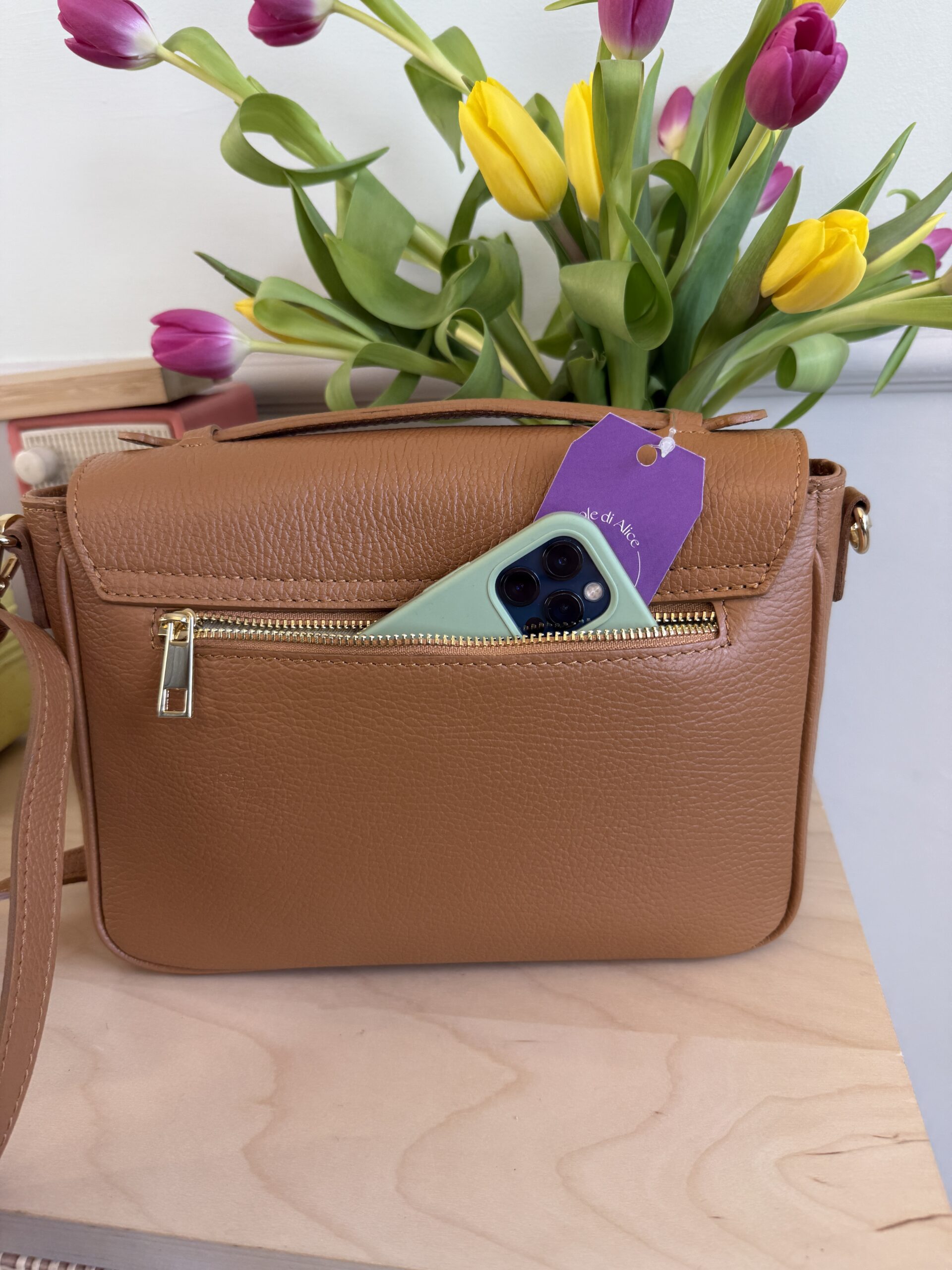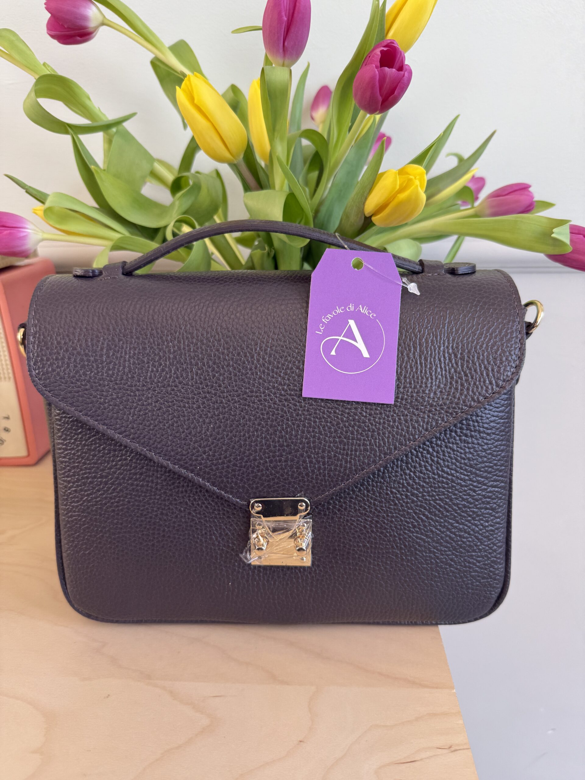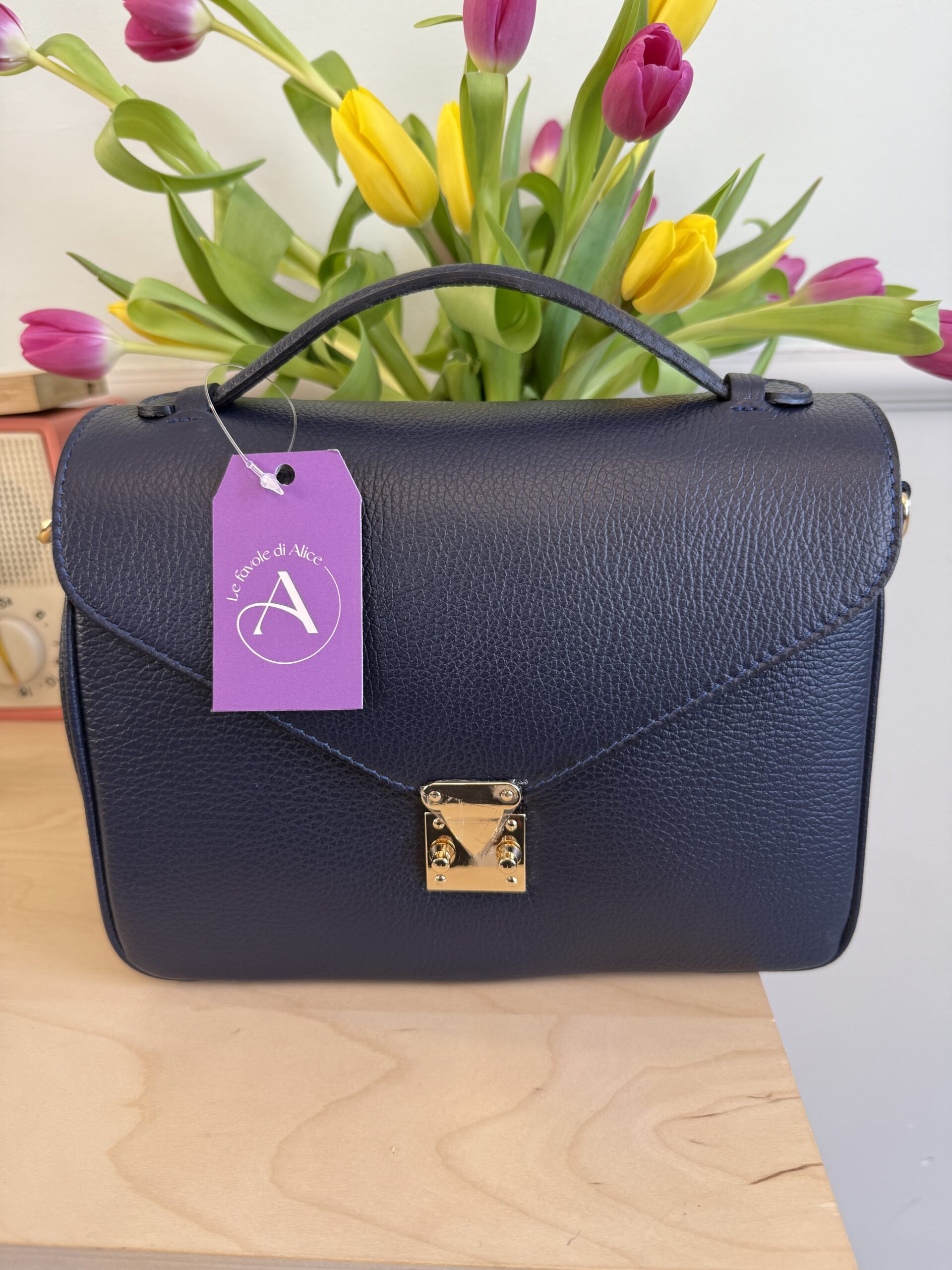Borsa in pelle con patella e chiusura dorata con pulsante scorrevole. Interno foderato con doppio scomparto.