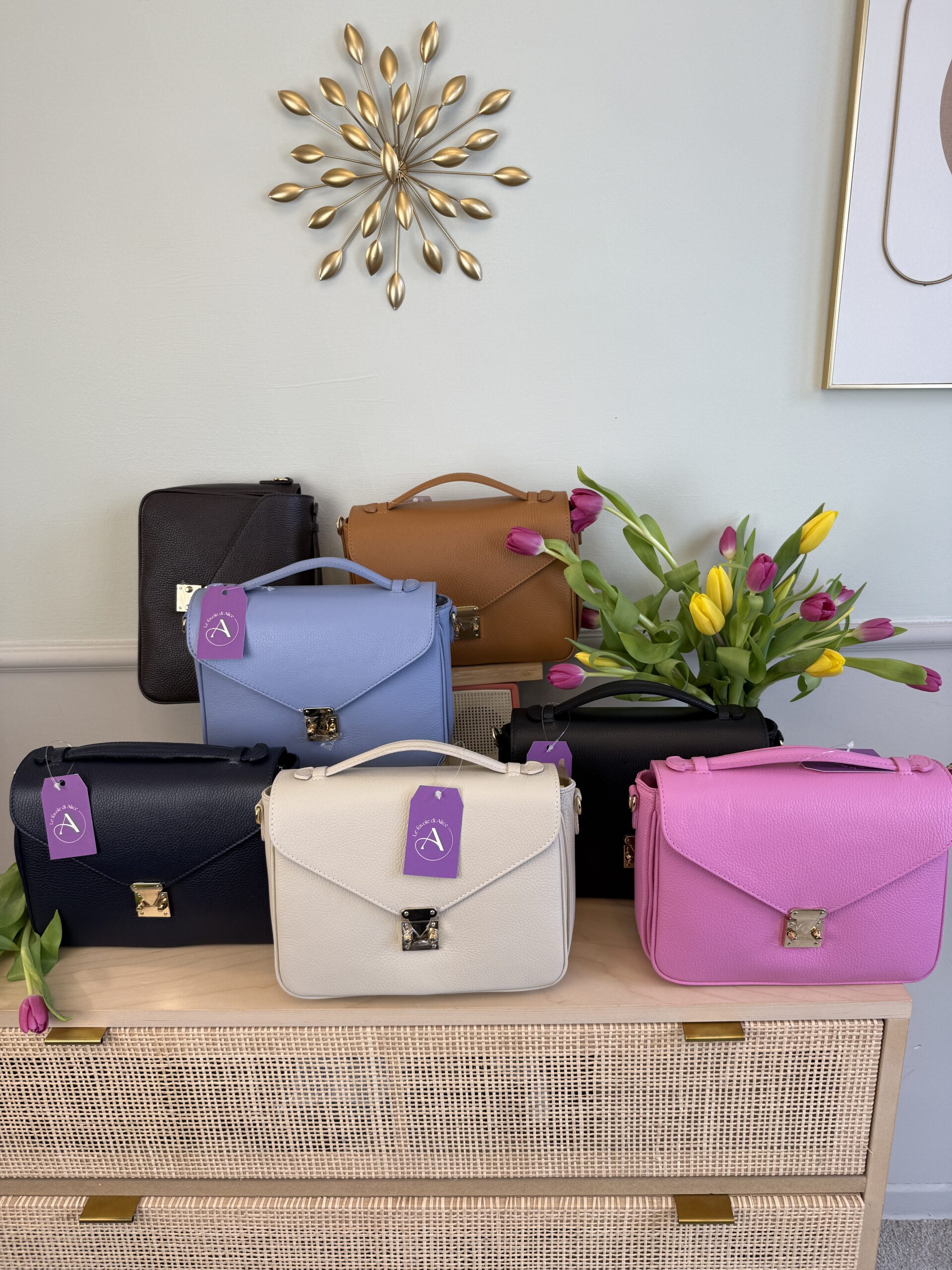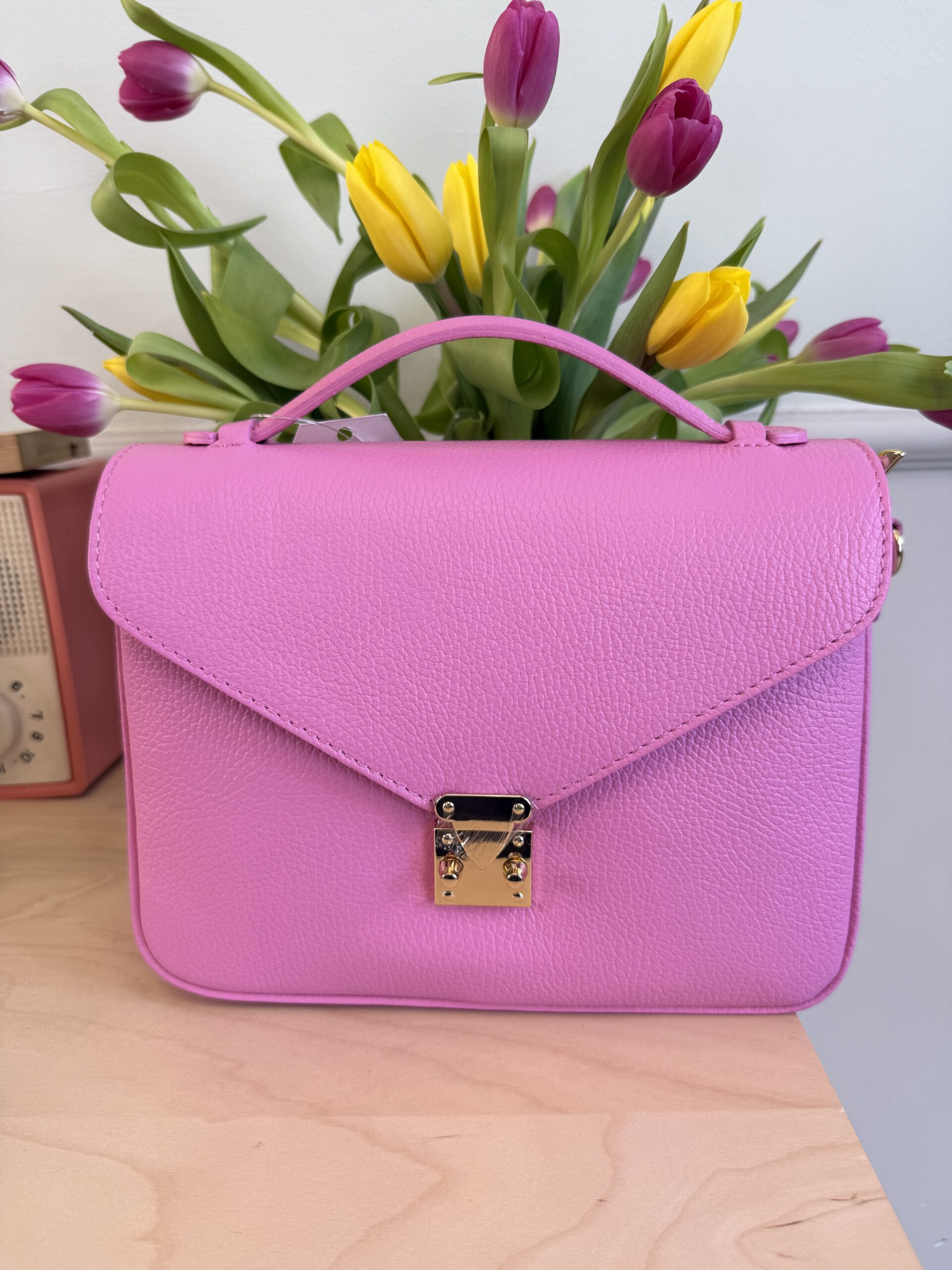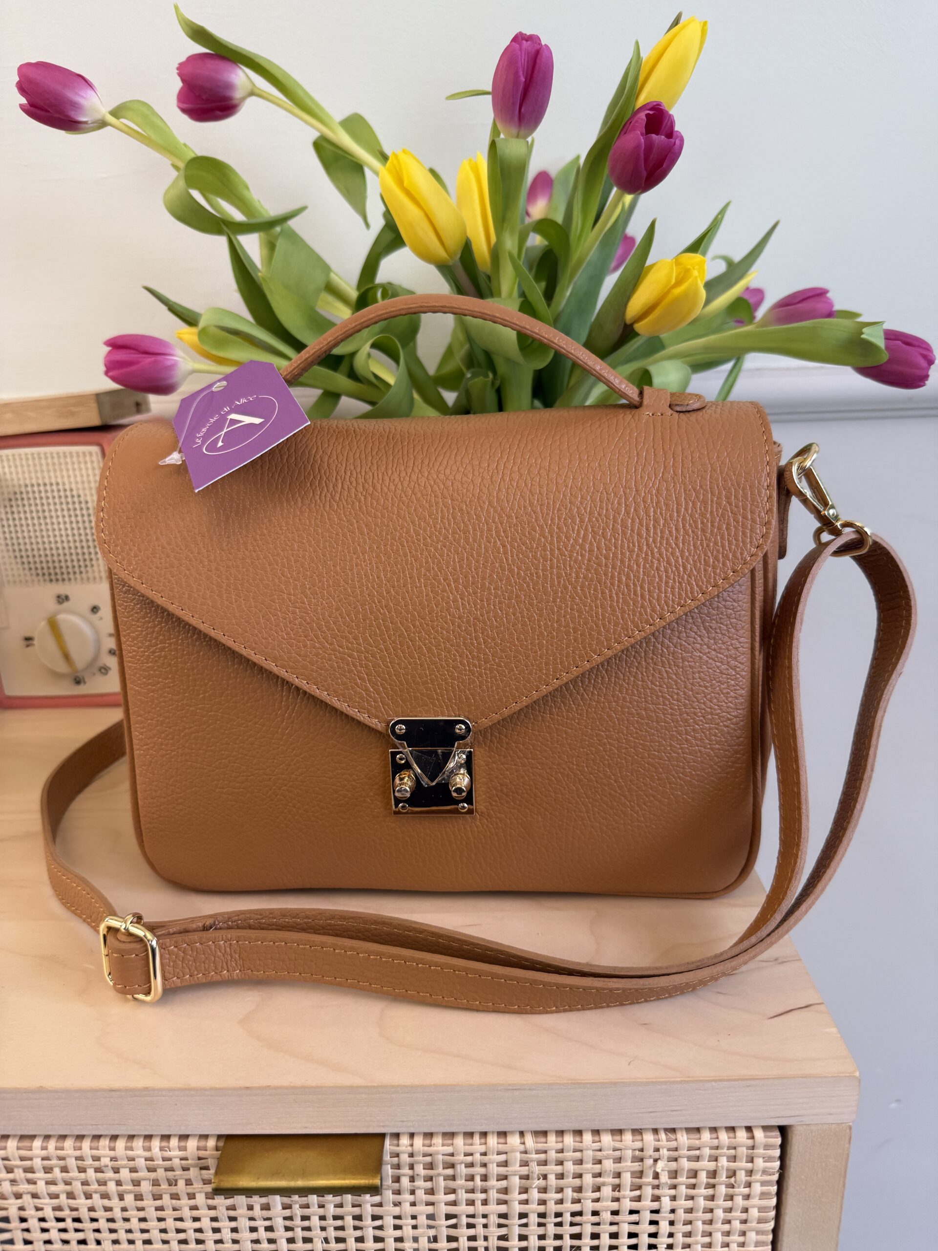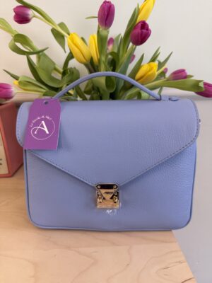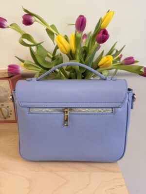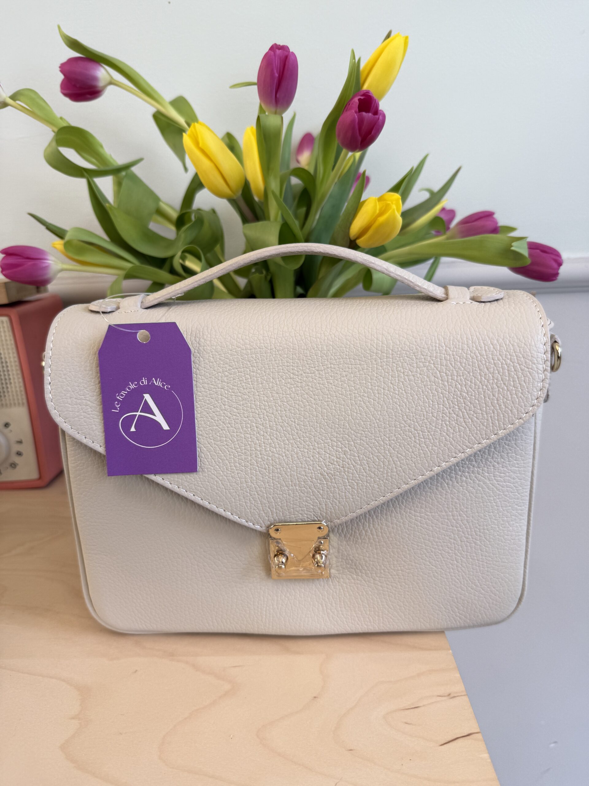 Borsa in pelle con patella e chiusura dorata con pulsante scorrevole. Interno foderato con doppio scomparto.