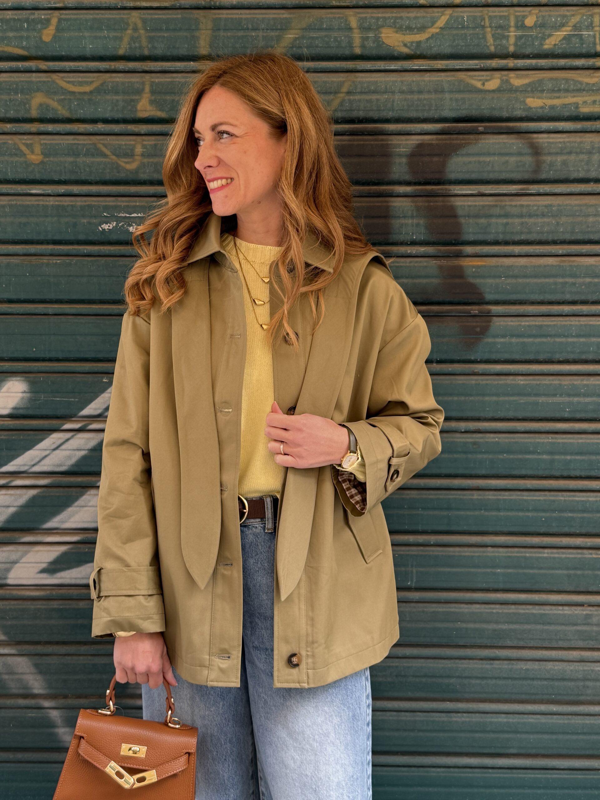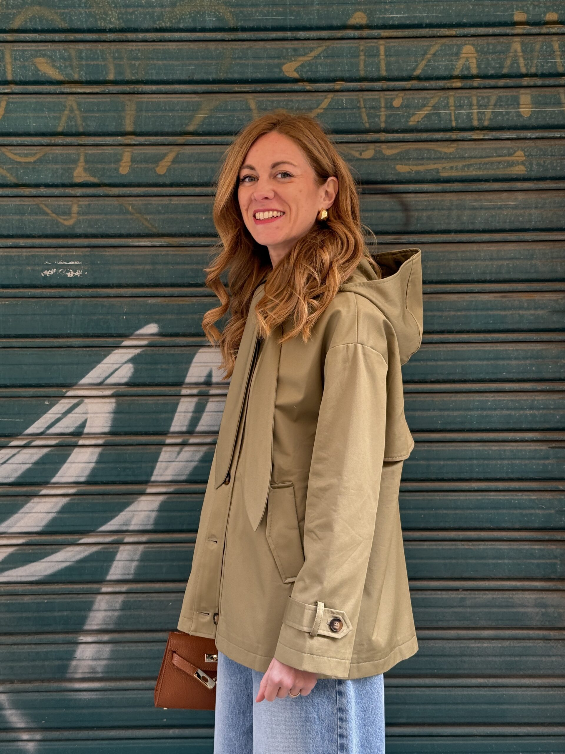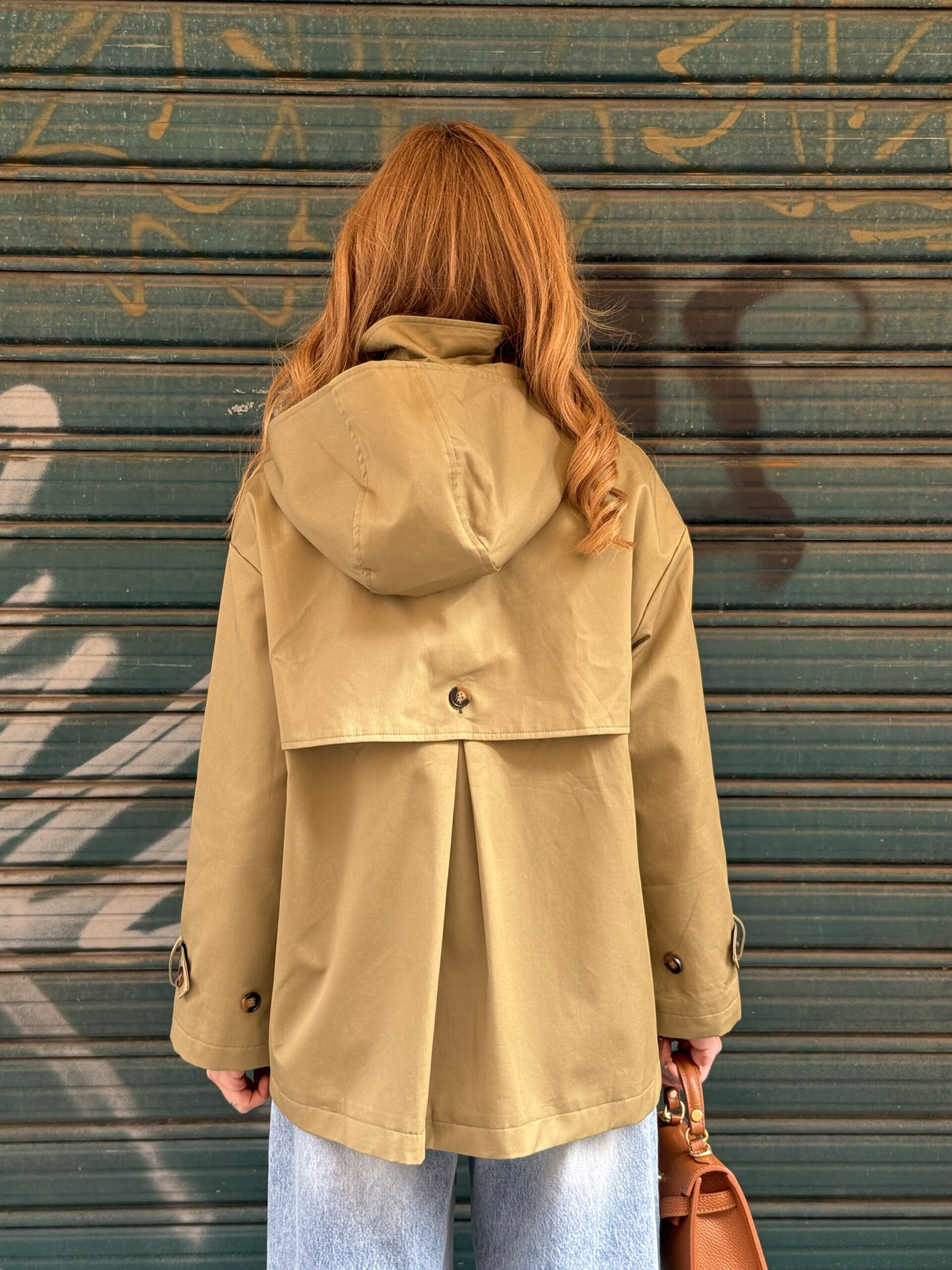 Caban verde con cappuccio e sciarpetta removibili. Colletto camicia, mantellina posteriore, foderato, tasche sul davanti e spalla leggermente scesa.