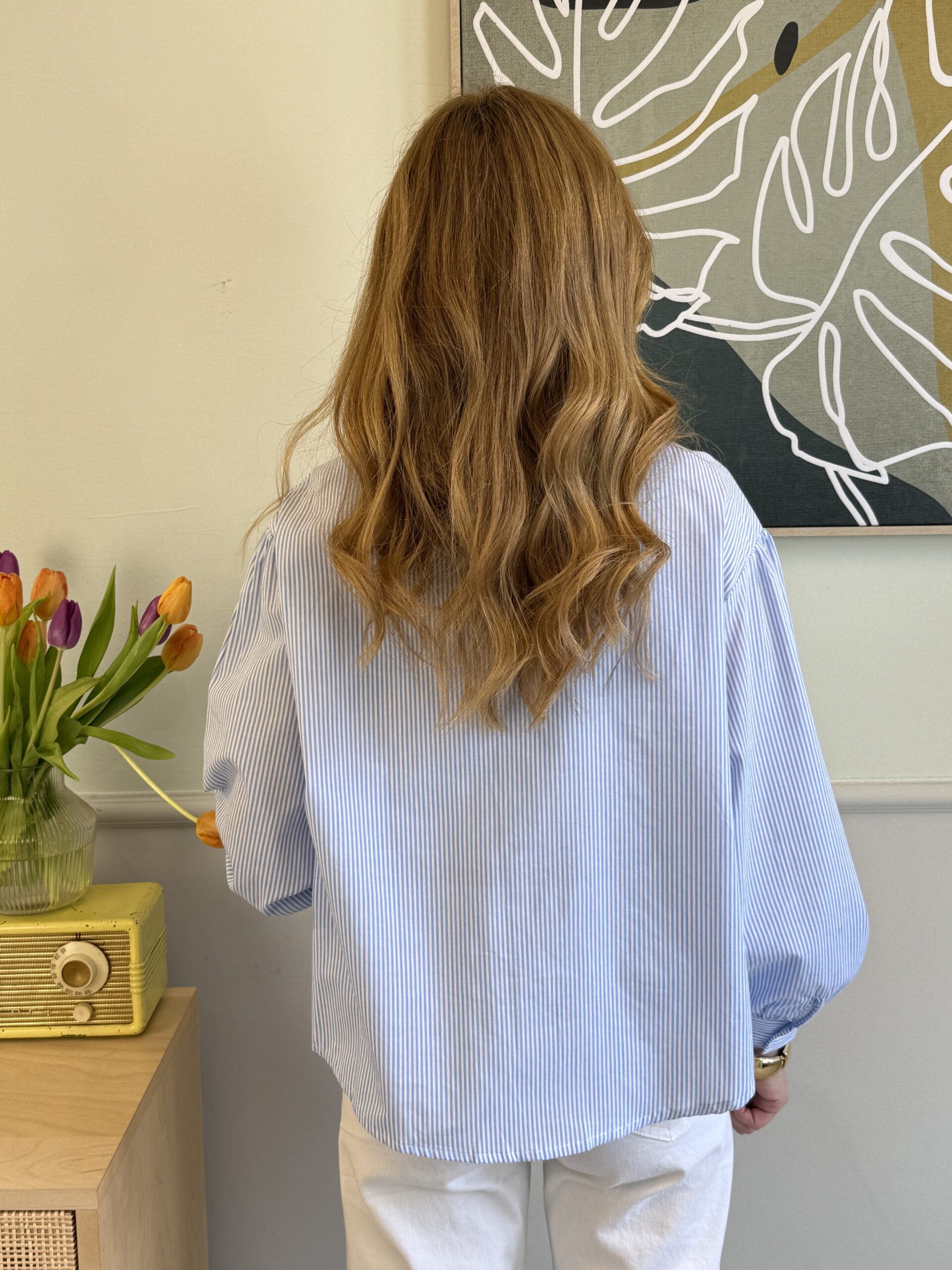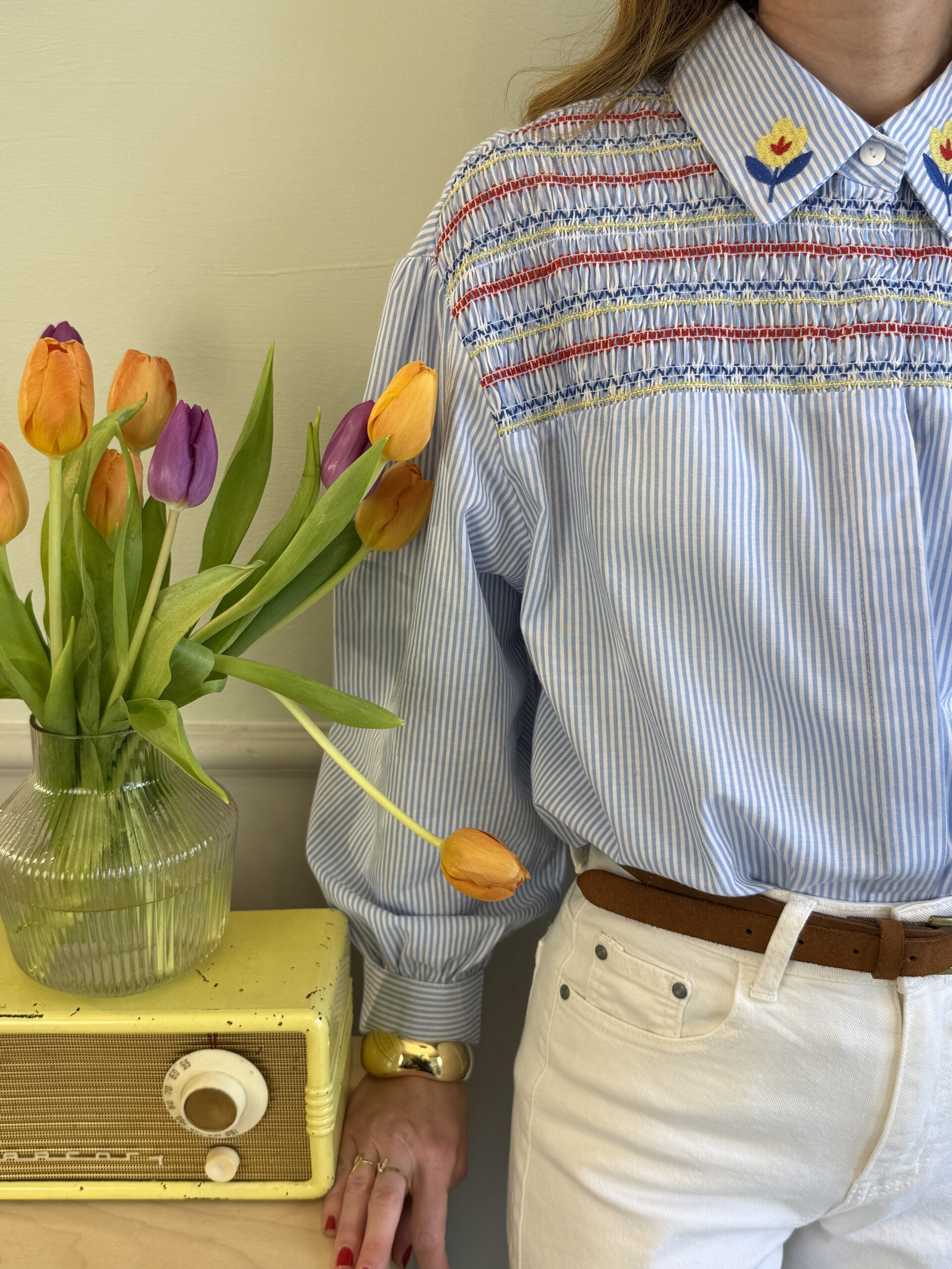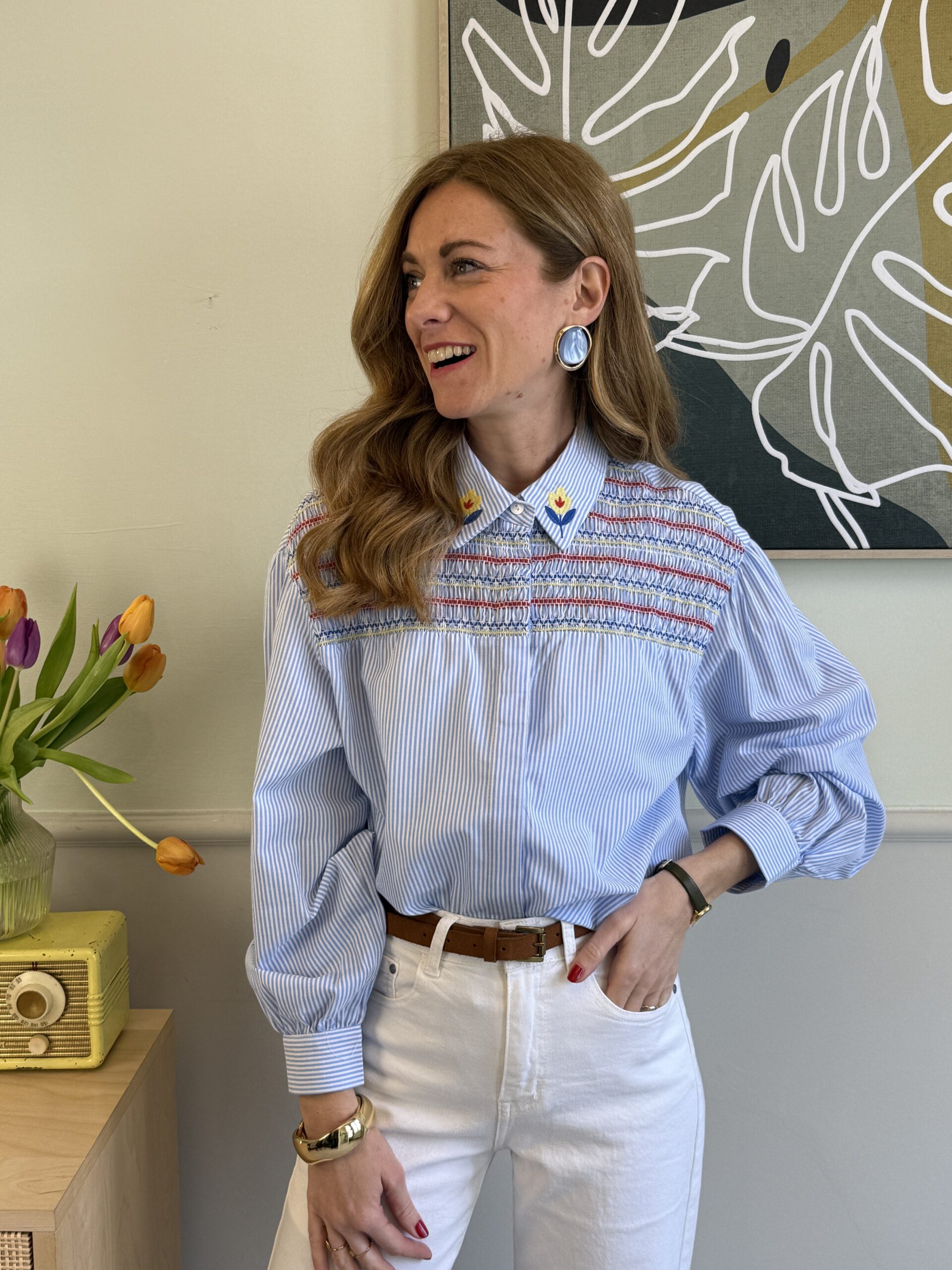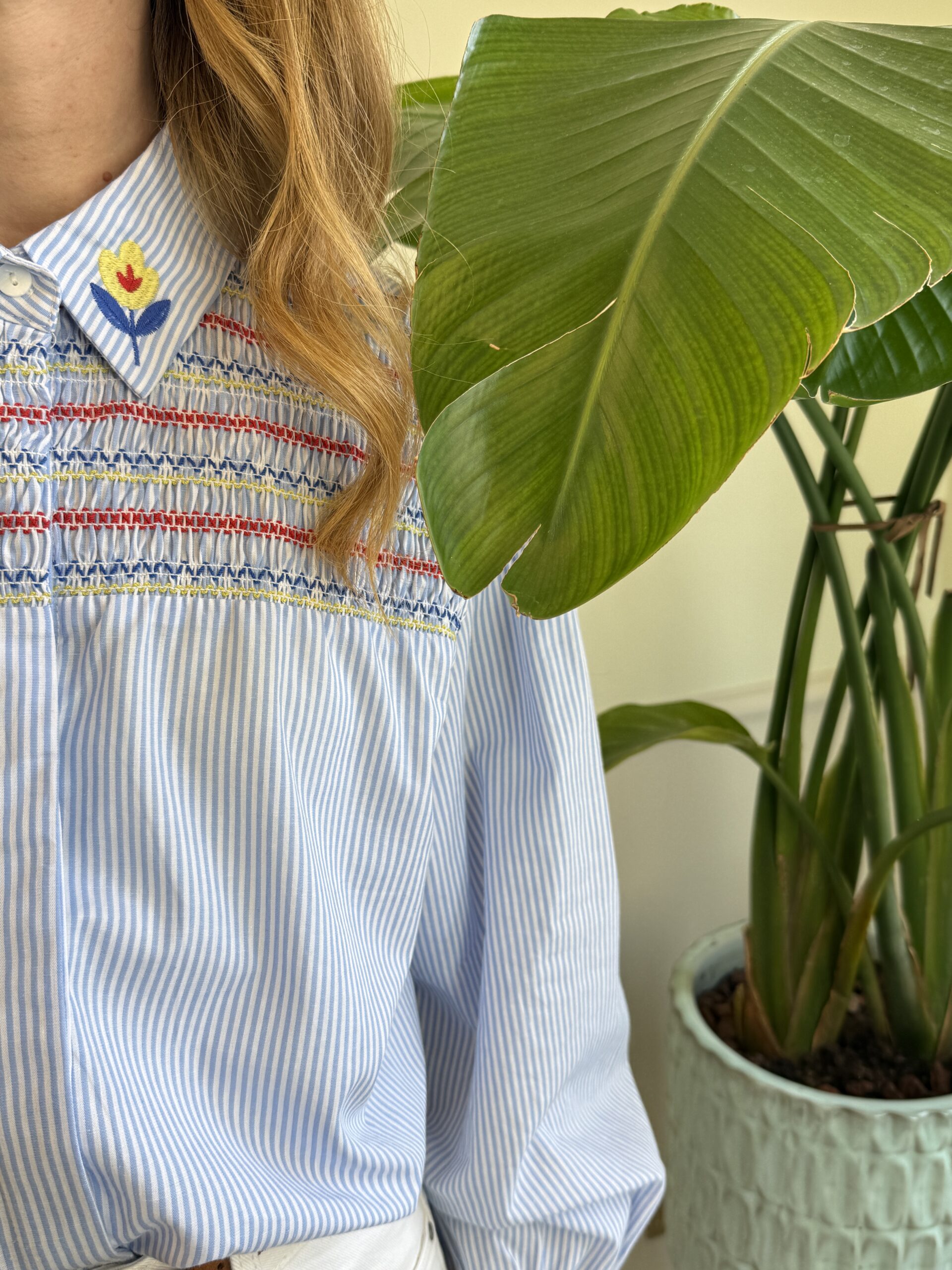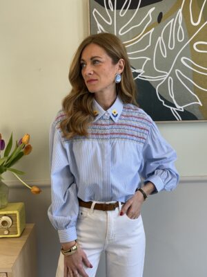 Stanca della solita camicia? allora scegli questa camicia in cotone millerighe con il carrè ricamato a motivi chevron, il colletto con fiore stilizzato e la manica ampia.