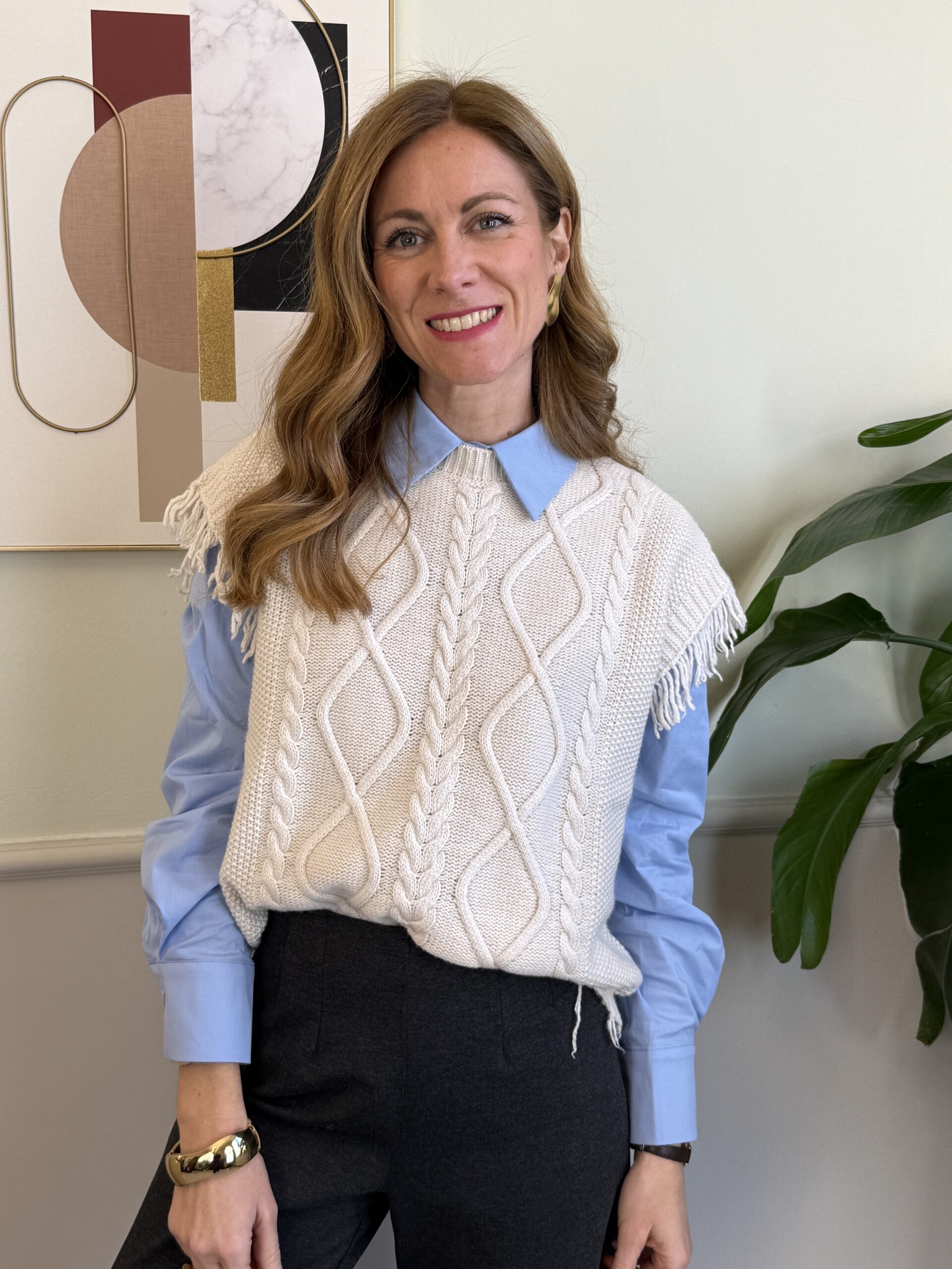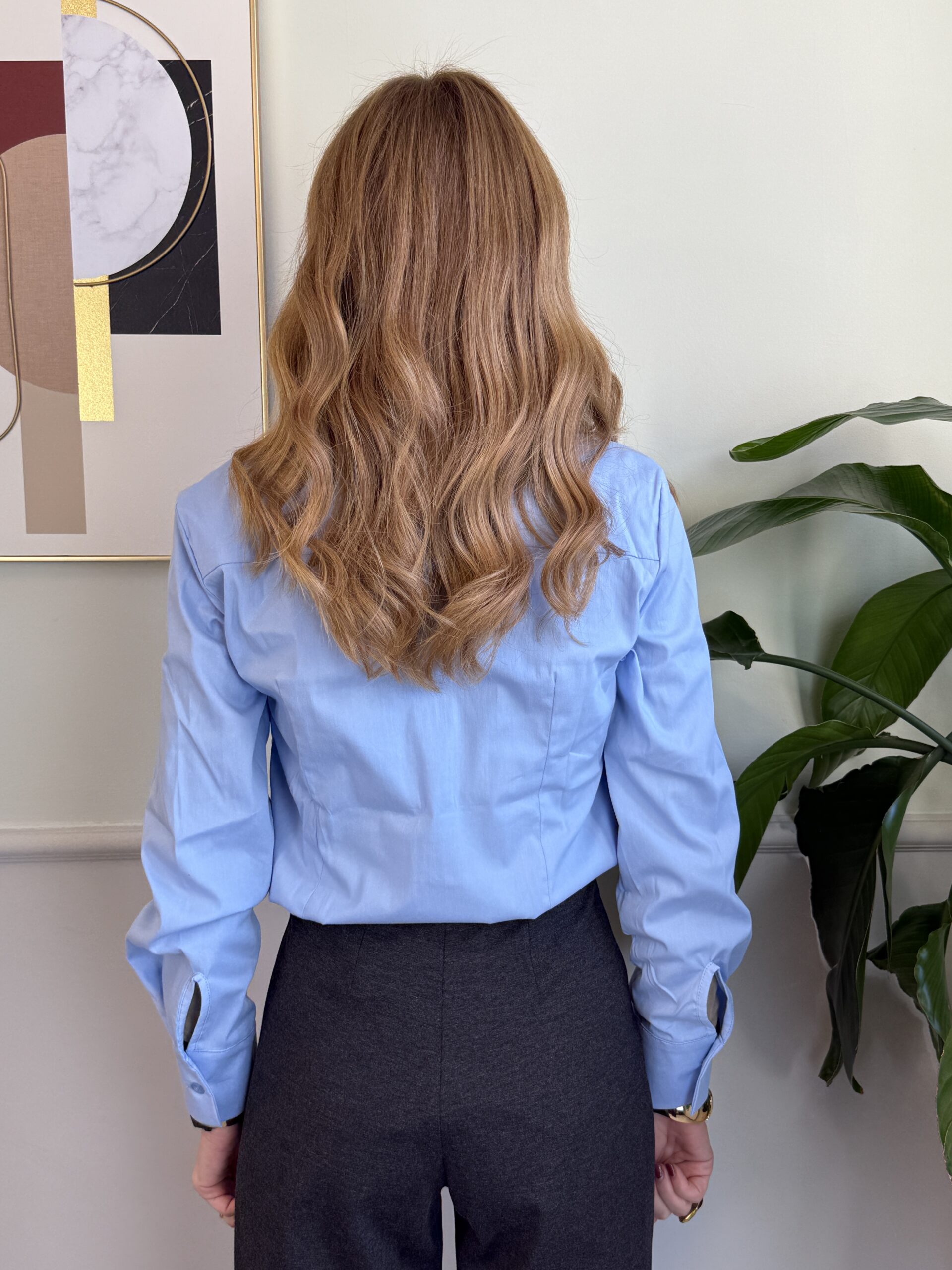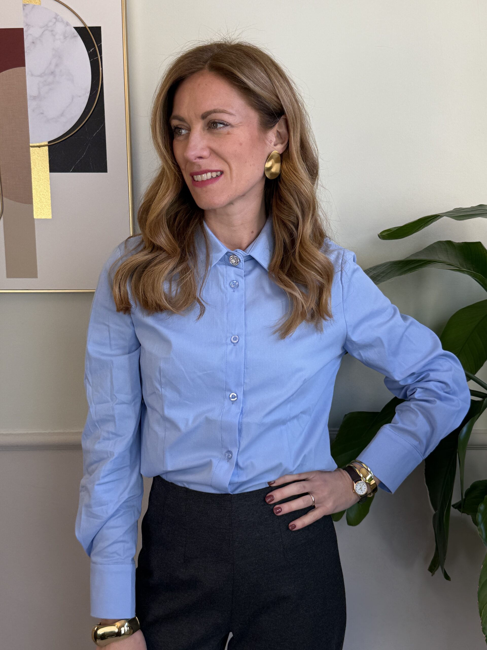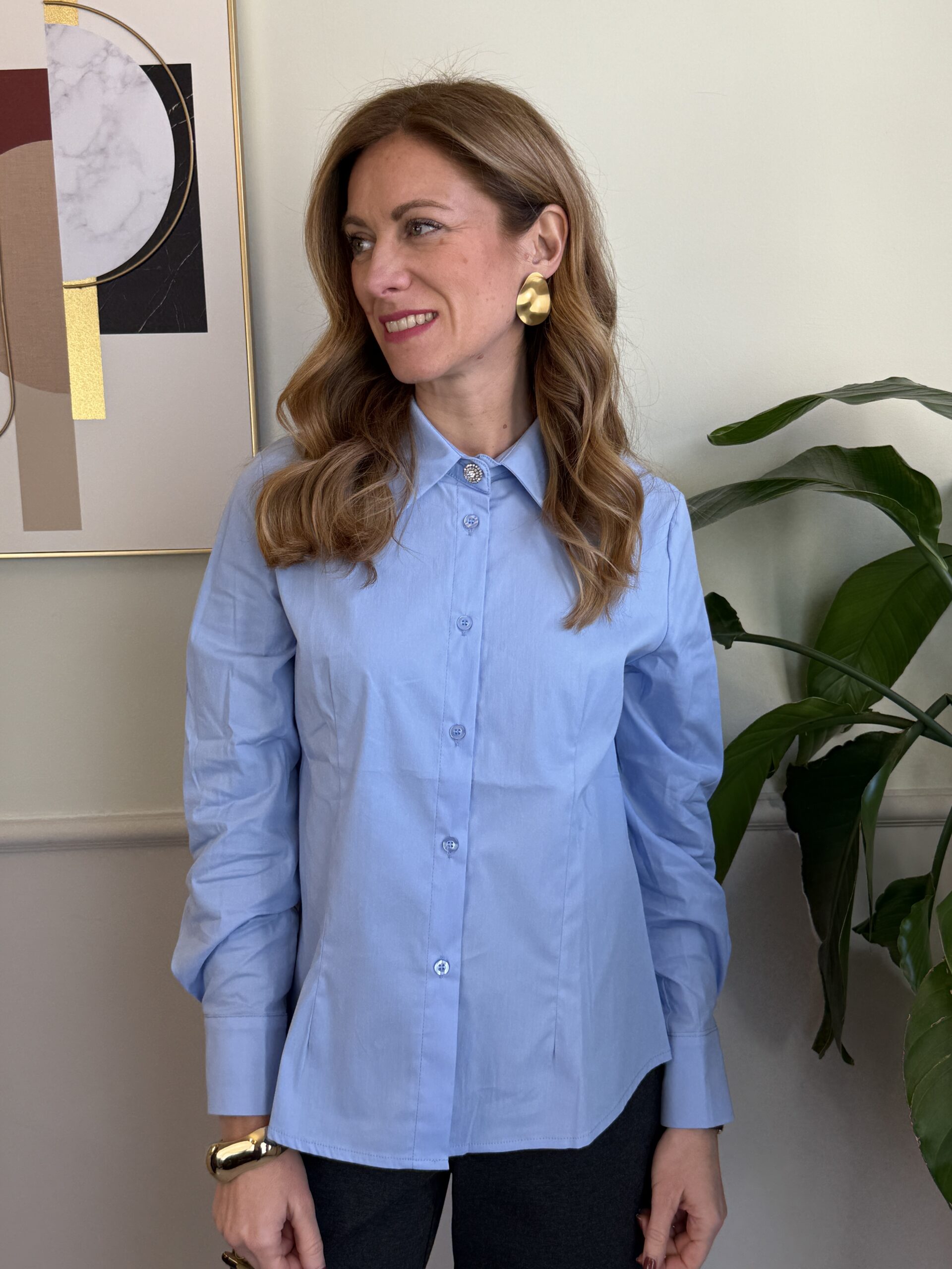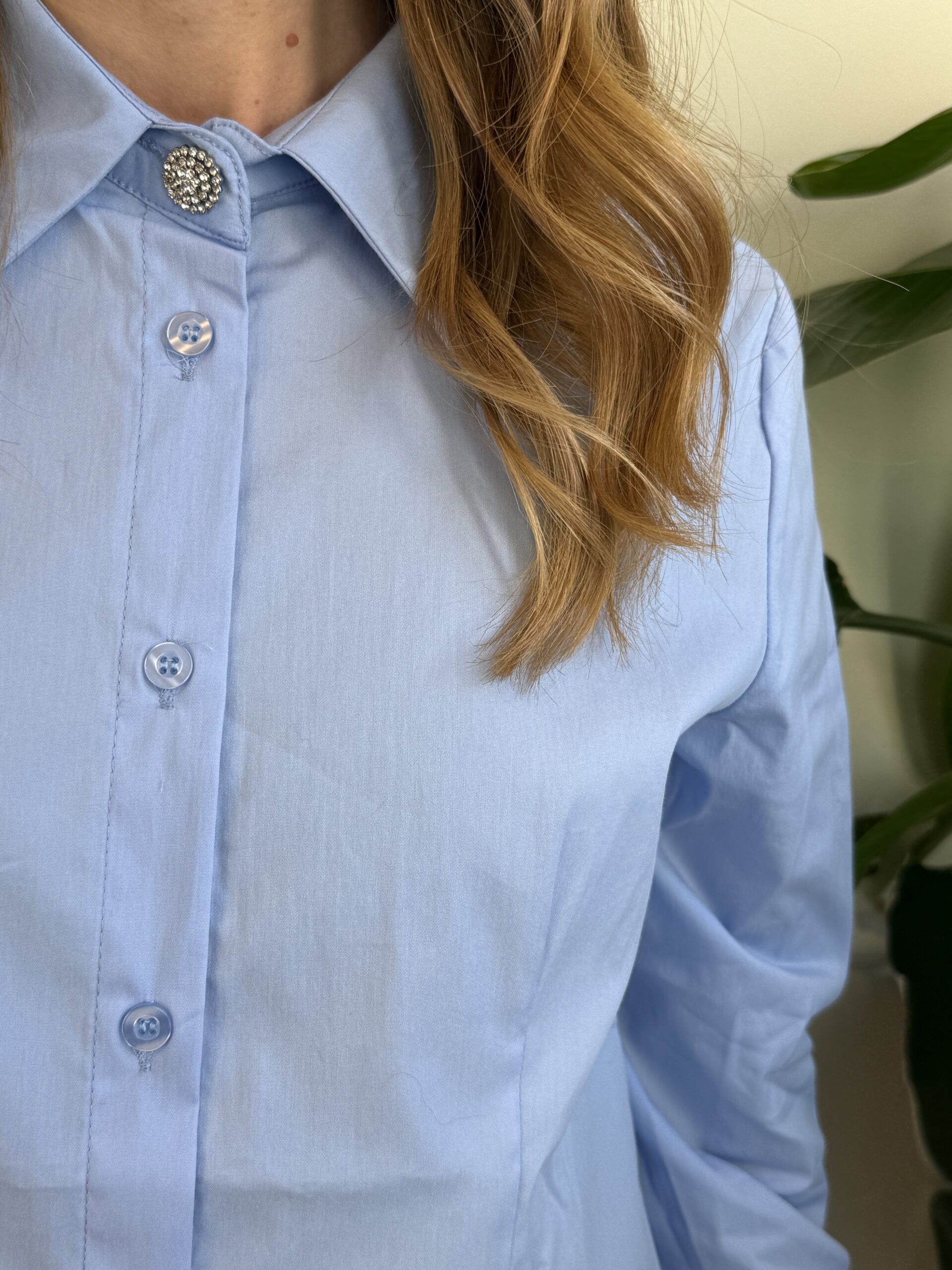 Camicia celeste a manica lunga con bottone gioiello.