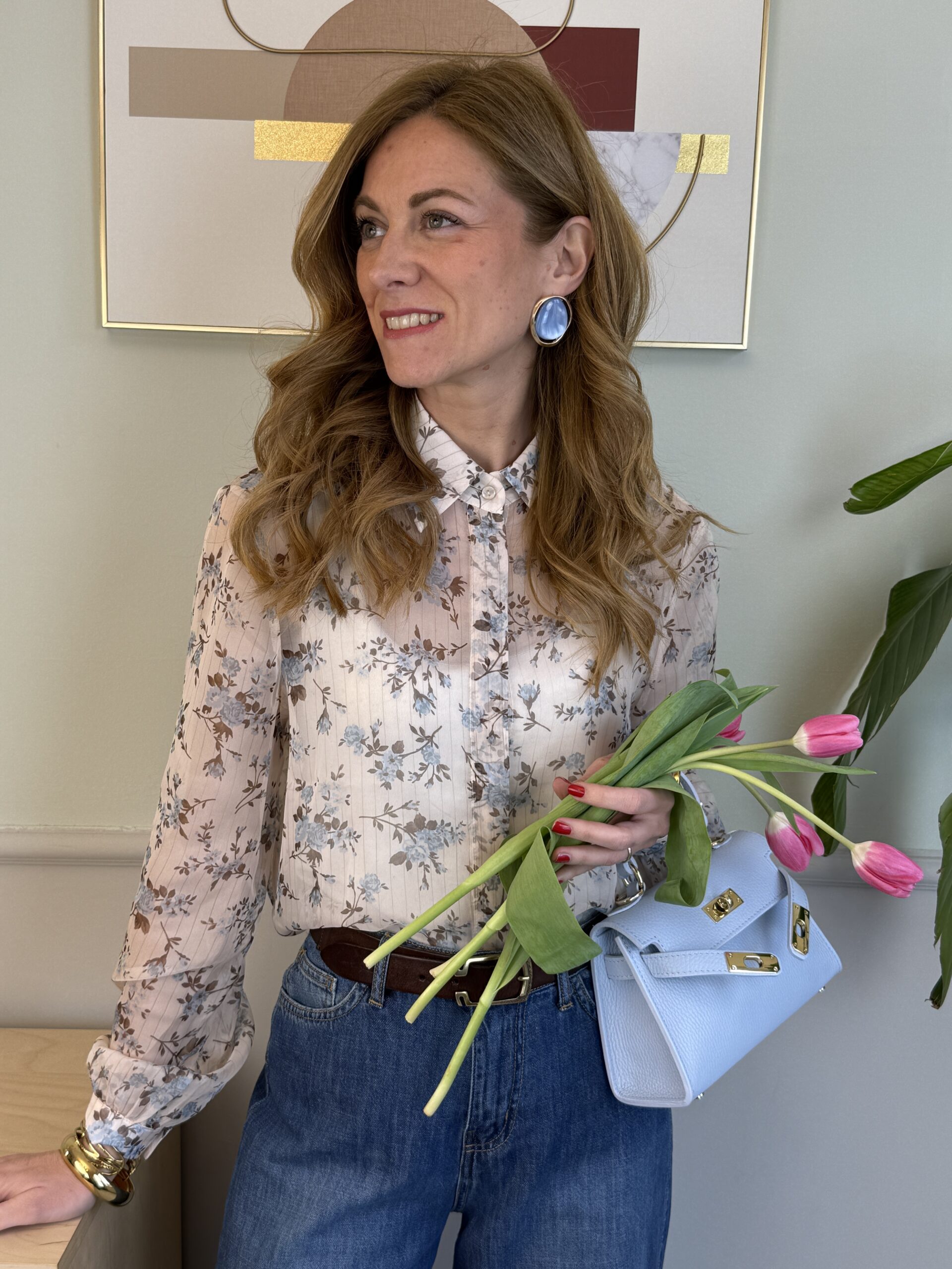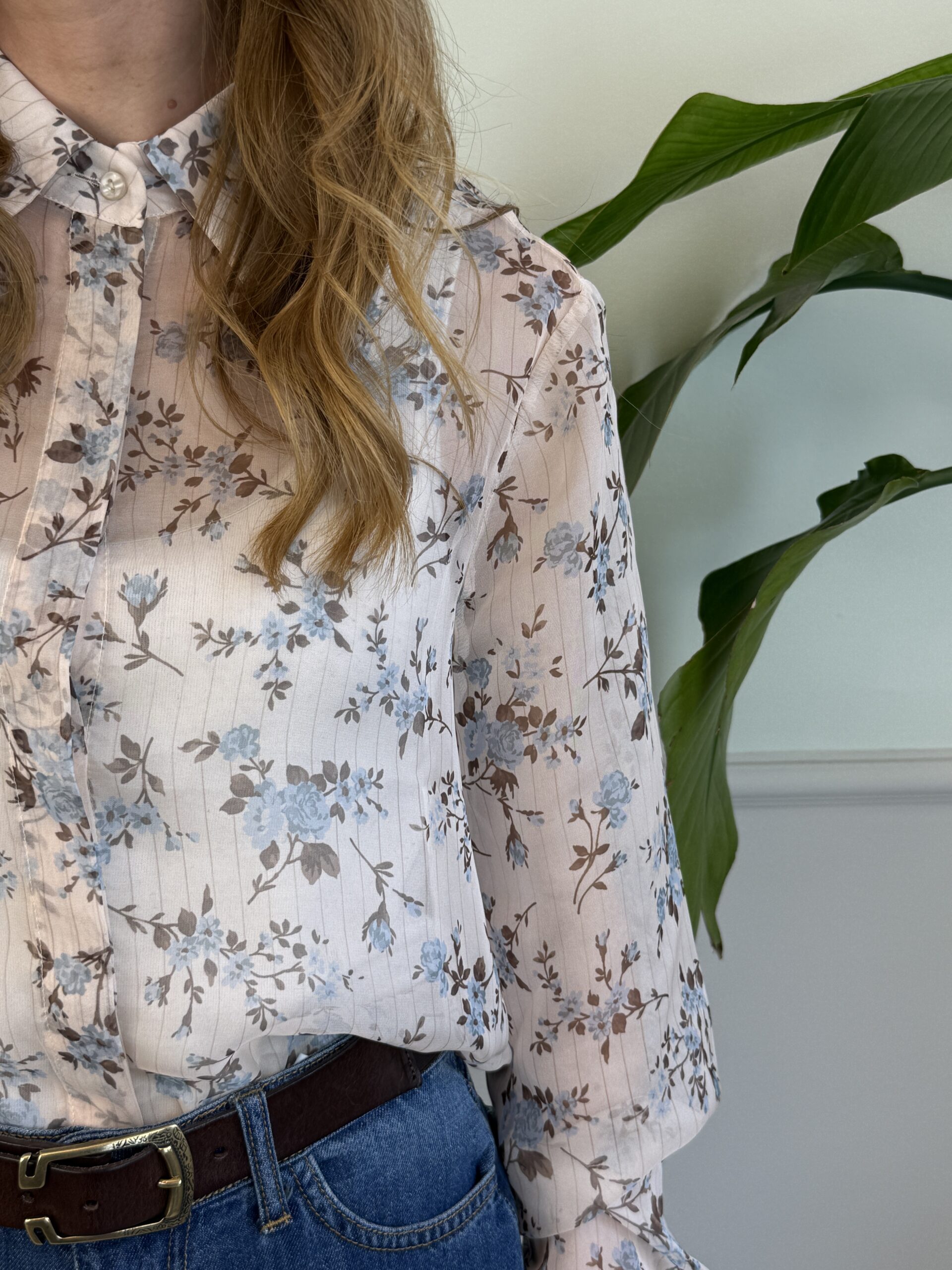 Camicia in chiffon gessata leggermente trasparente in fantasia floreale.