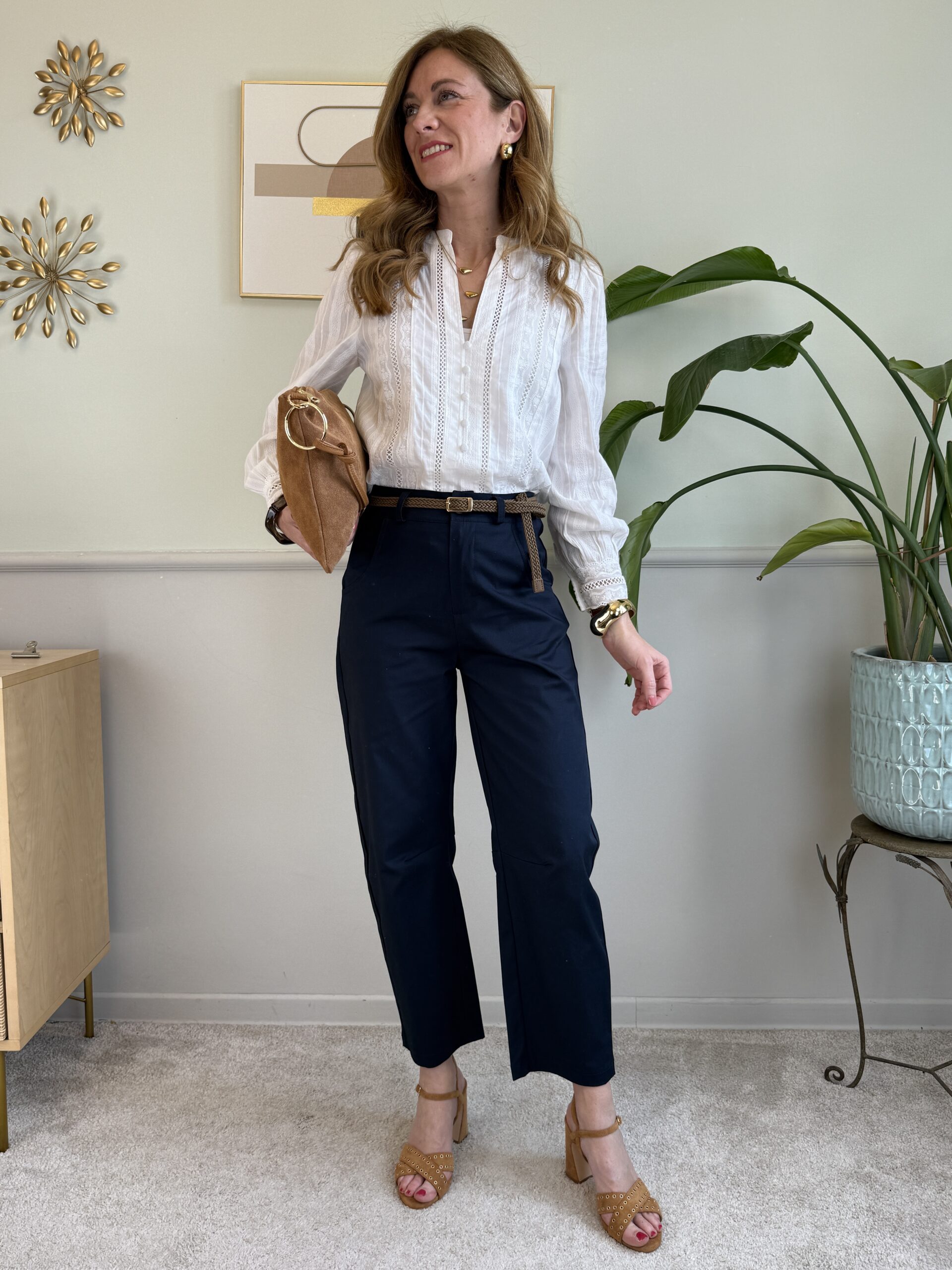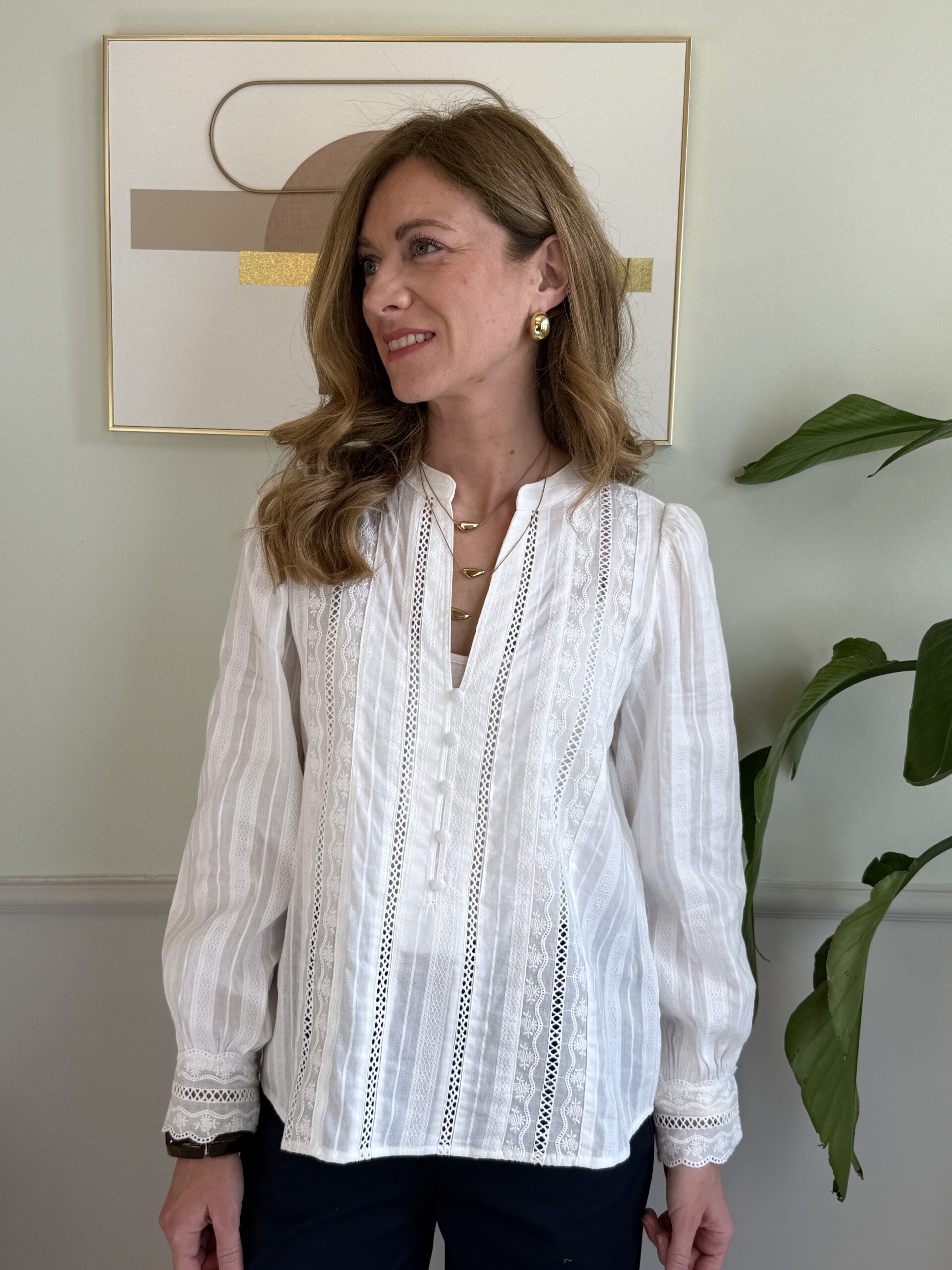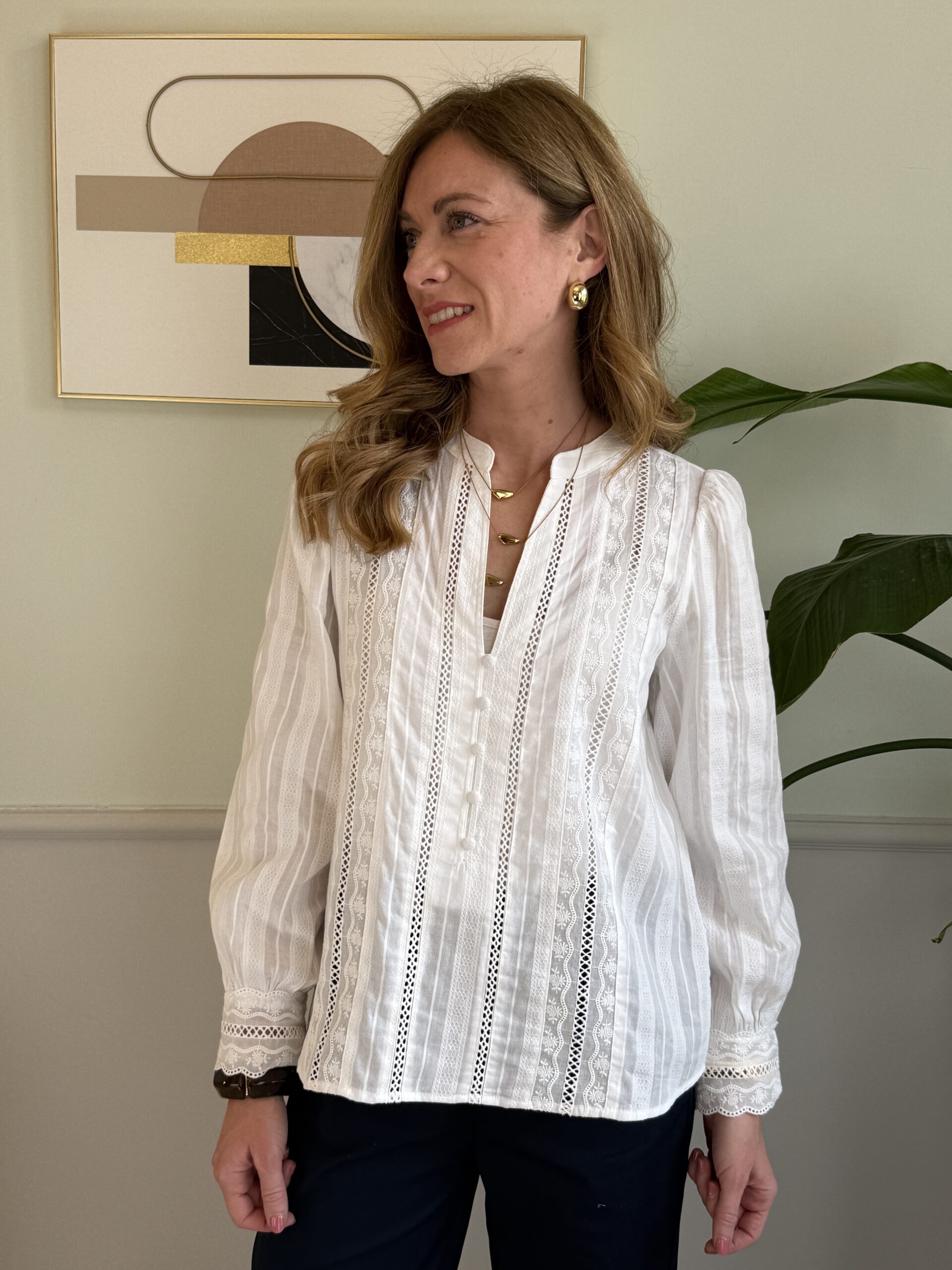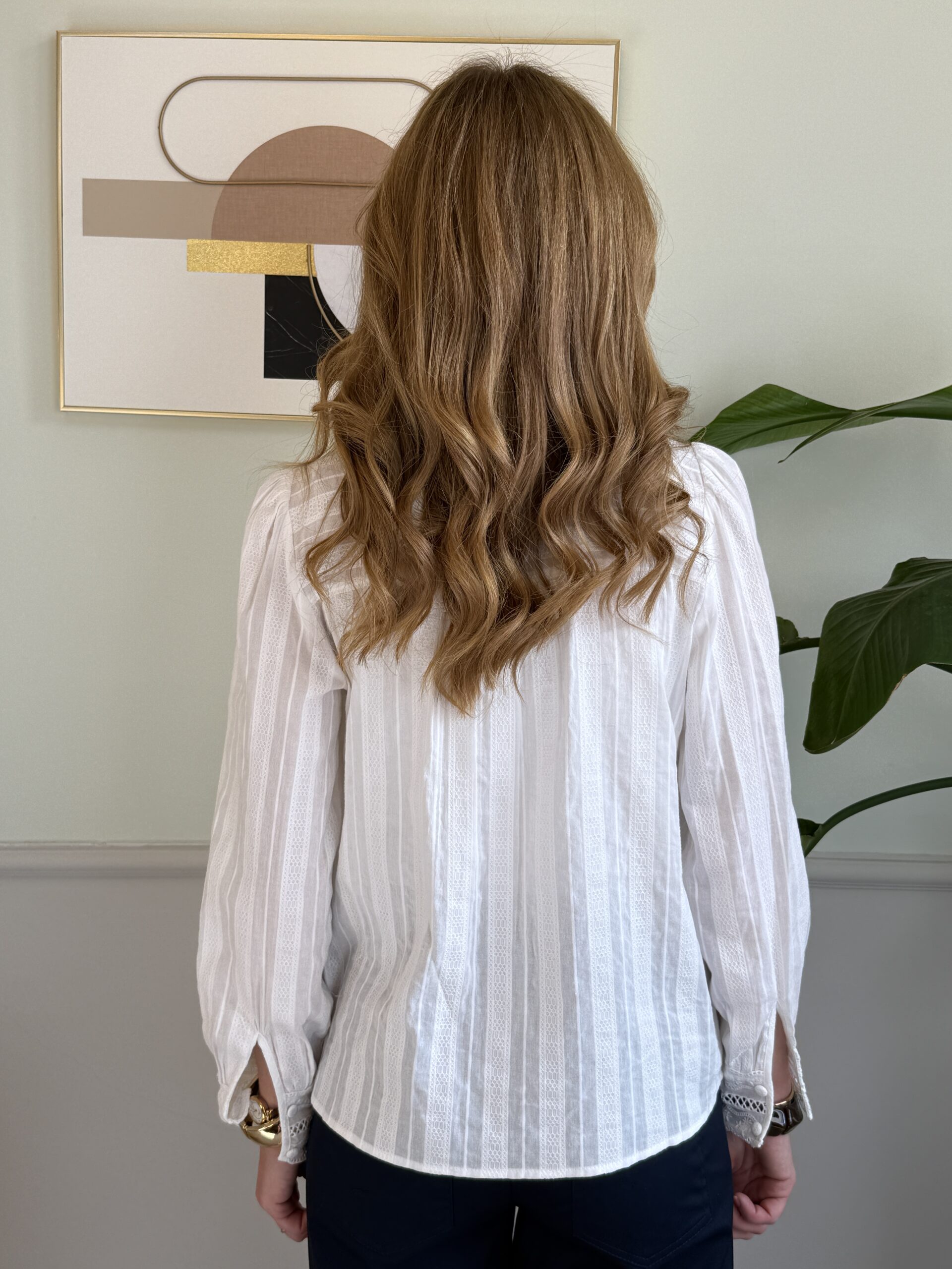 Camicia bianca con collo alla coreana e inserti a joure anche sul polso.