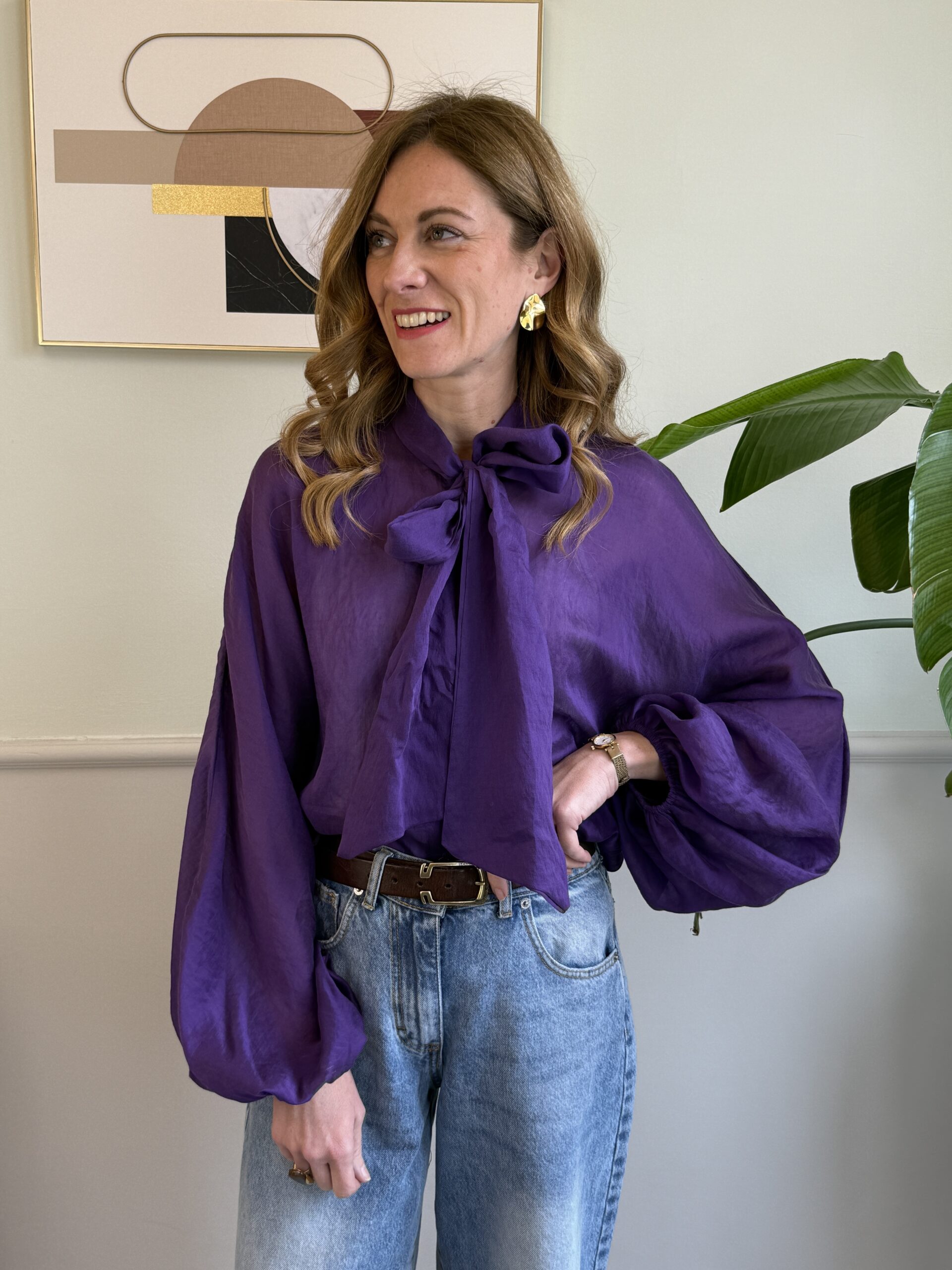Camicia in tessuto fresco leggermente trasparente con fiocco al collo e manica a kimono con polso palloncino.