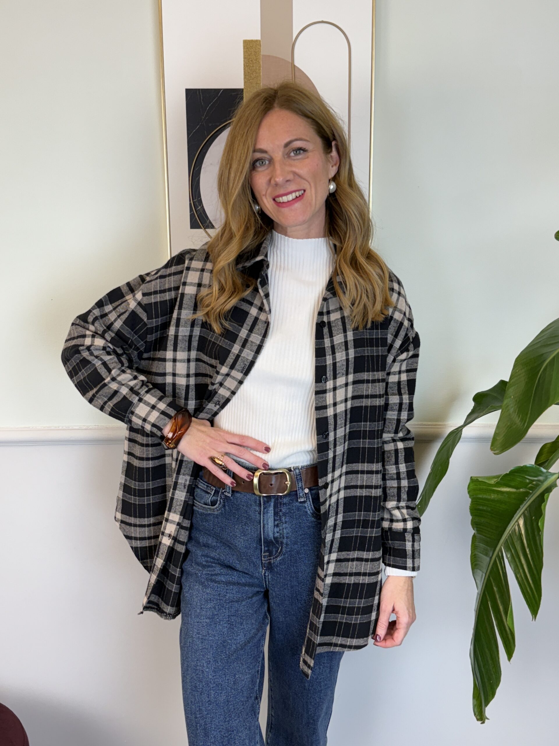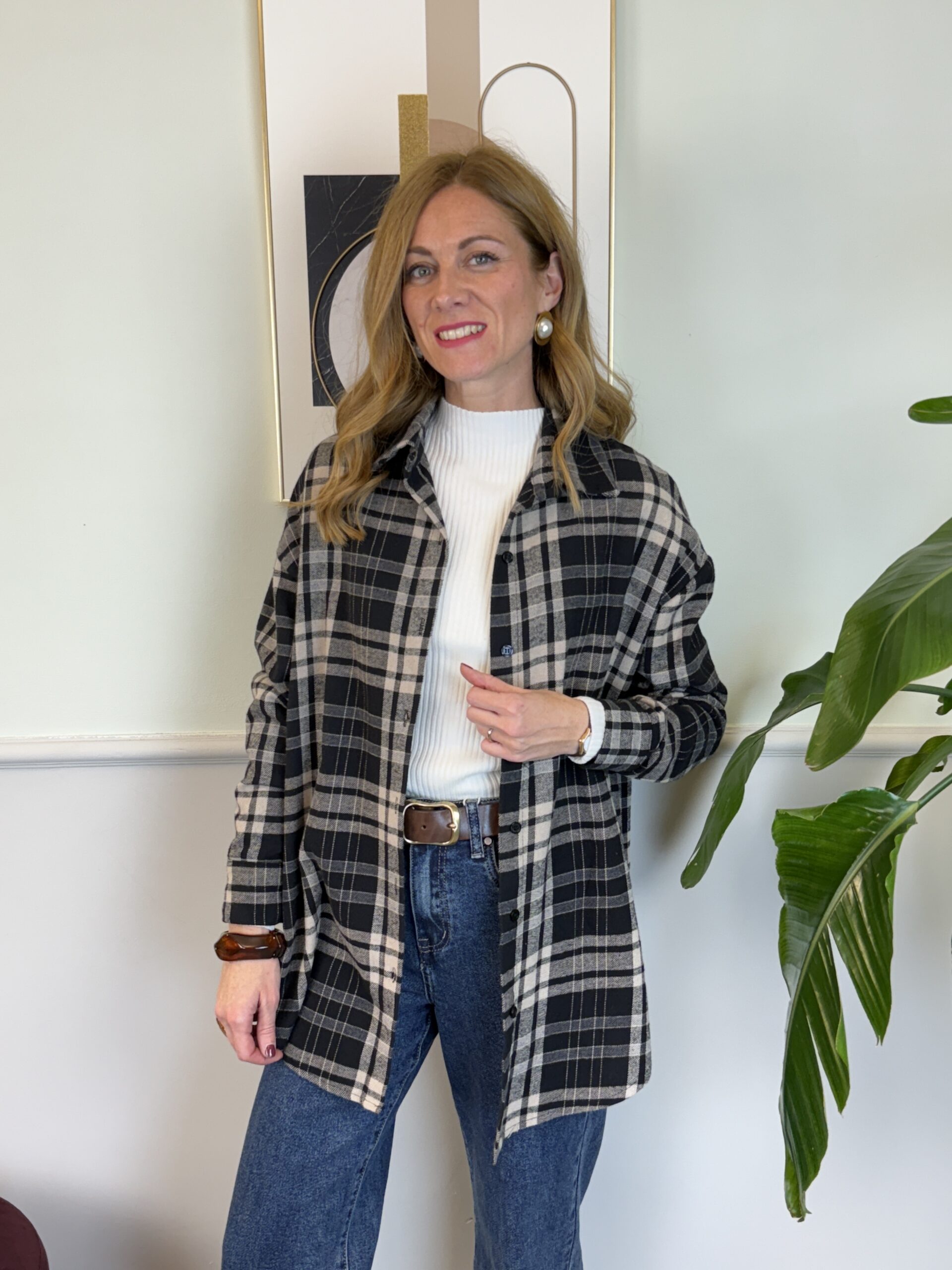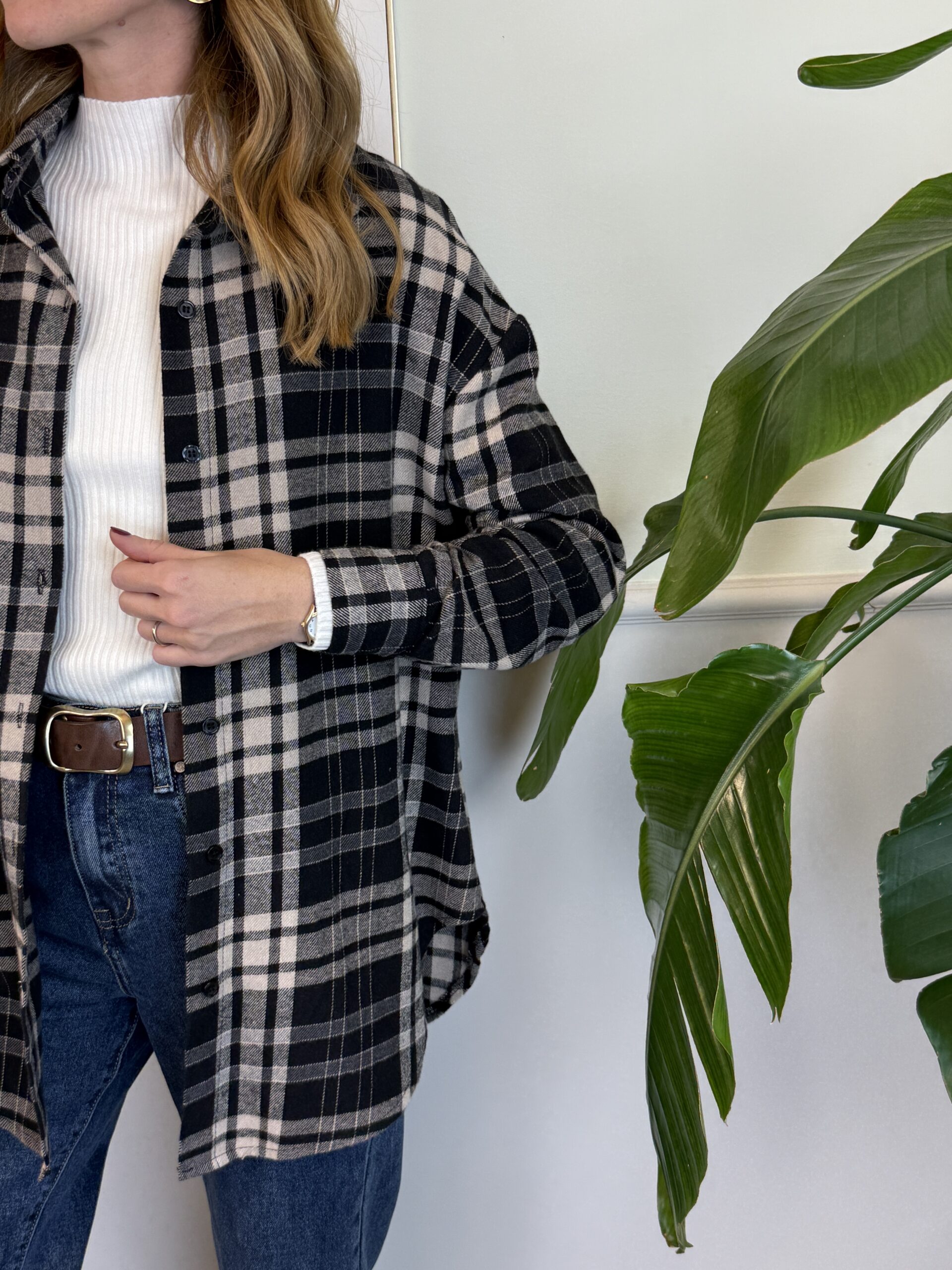 Camicia in flanella di cotone con fantasia a quadri, spalla scesa, orlo arrotondato.