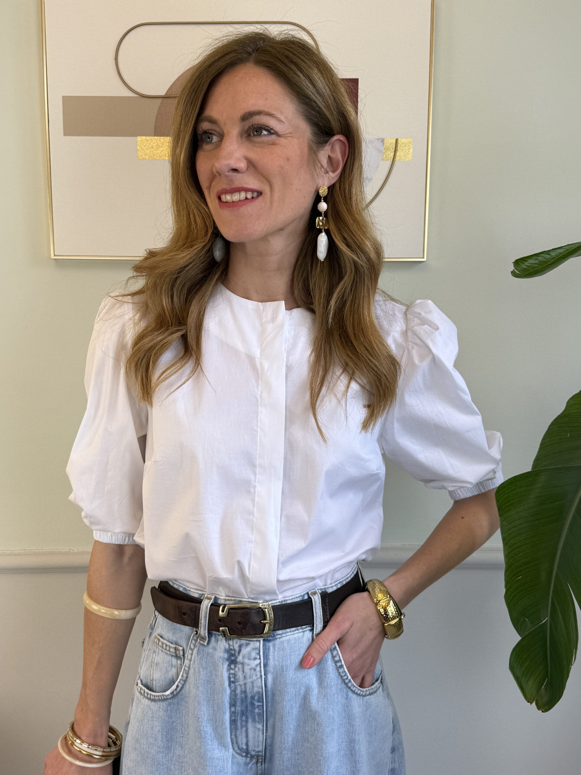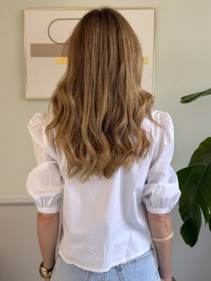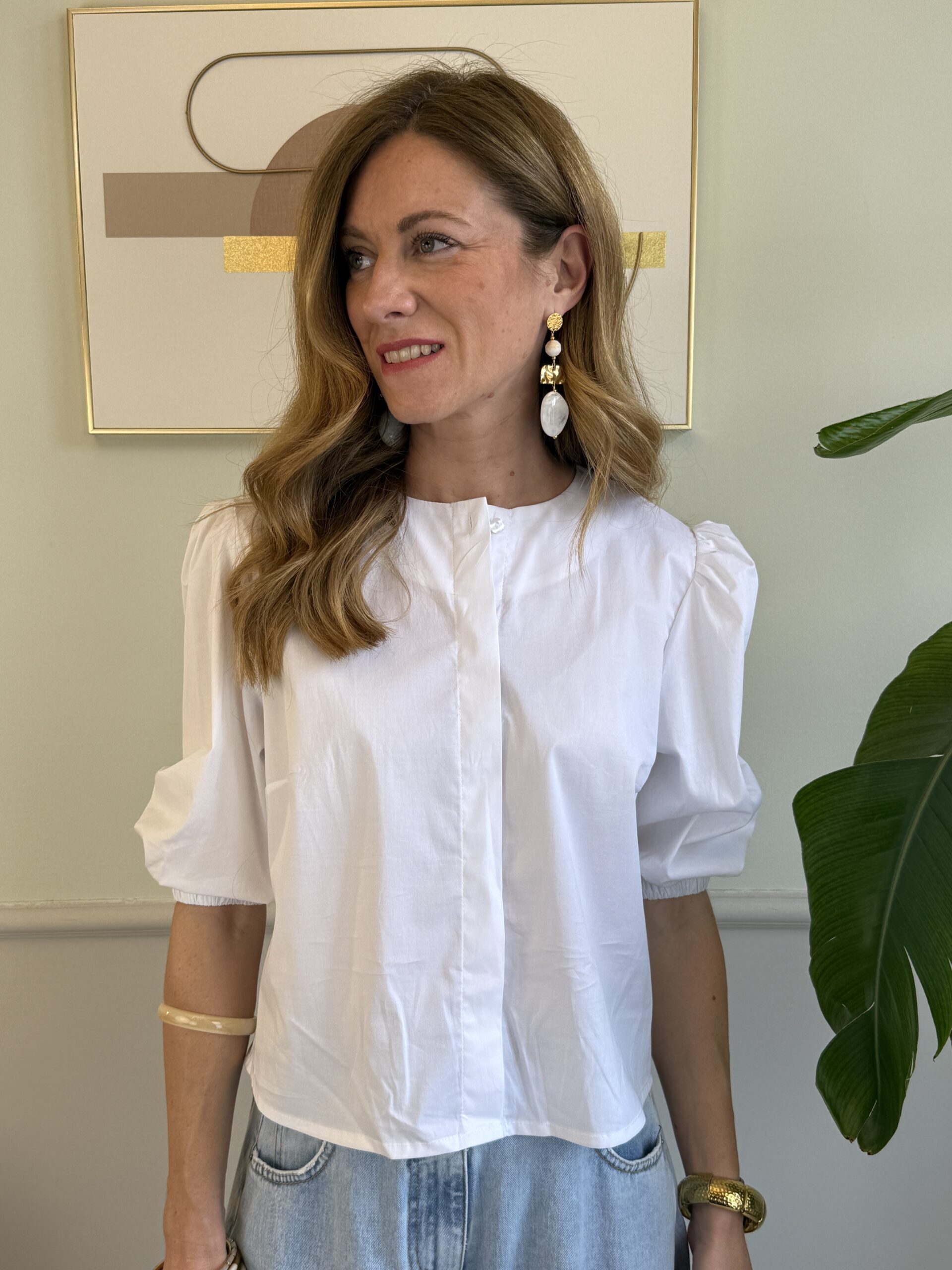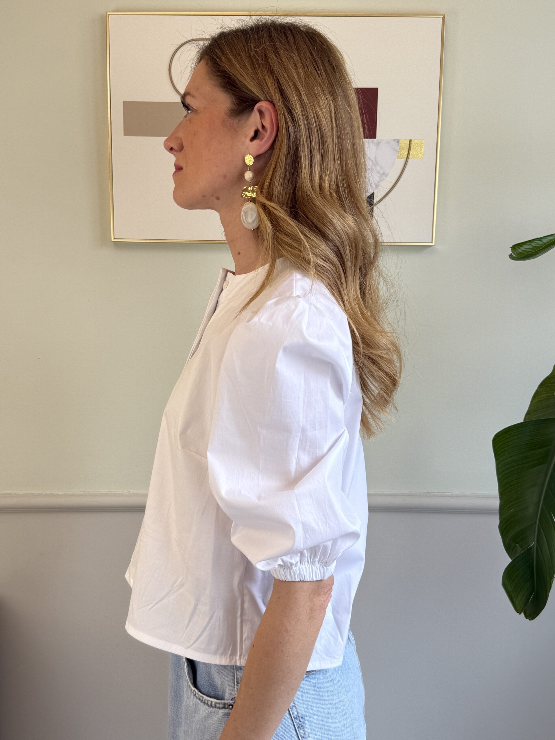 Camicia bianca crop girocollo con manica a 3/4 palloncino.