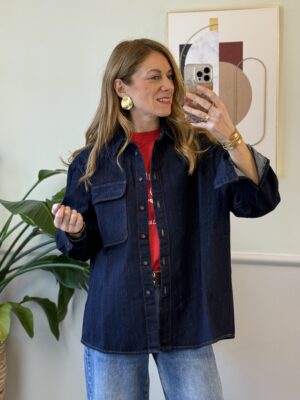 Camicia a quadri moro e caramello con spalla scesa e tasca applicata davanti.