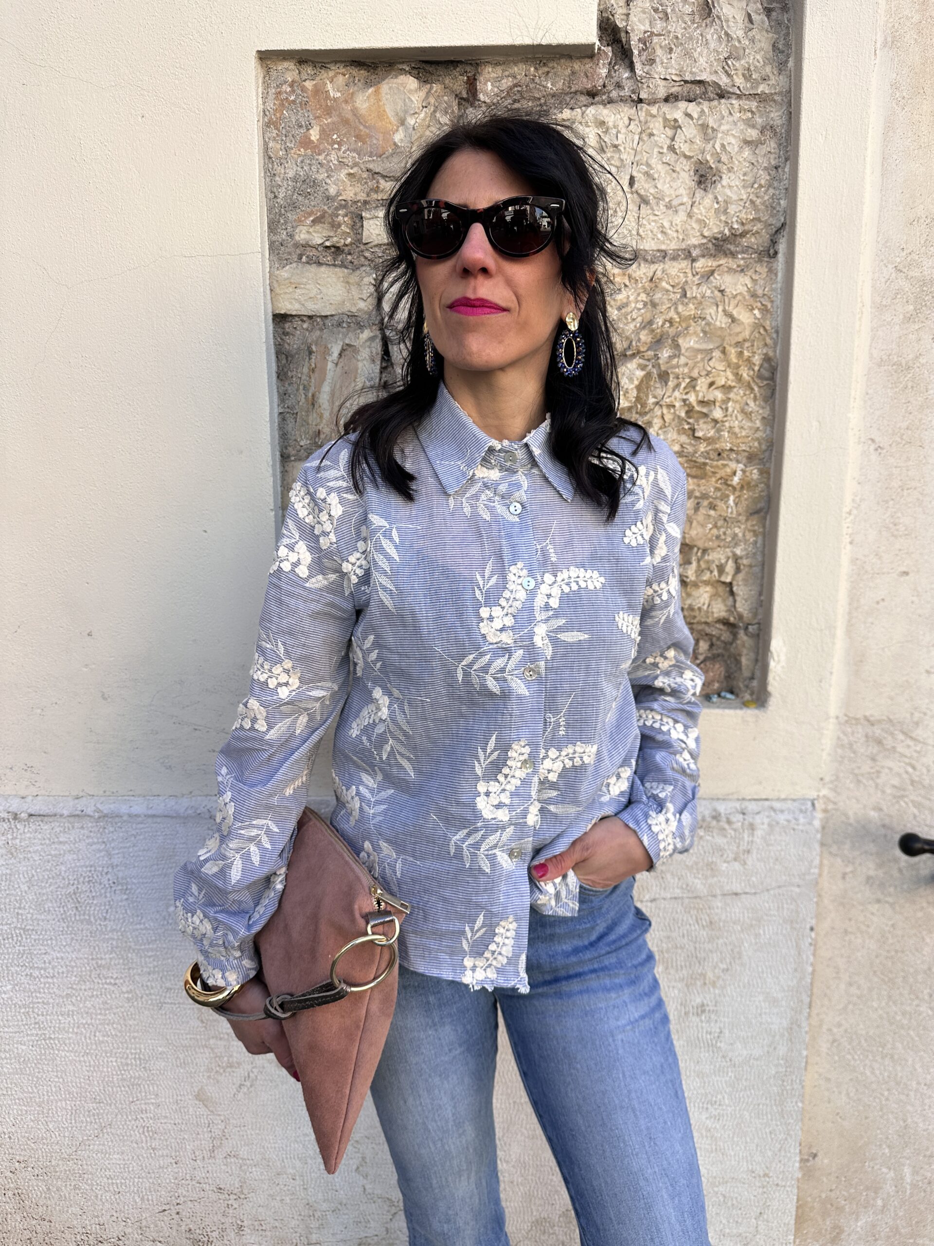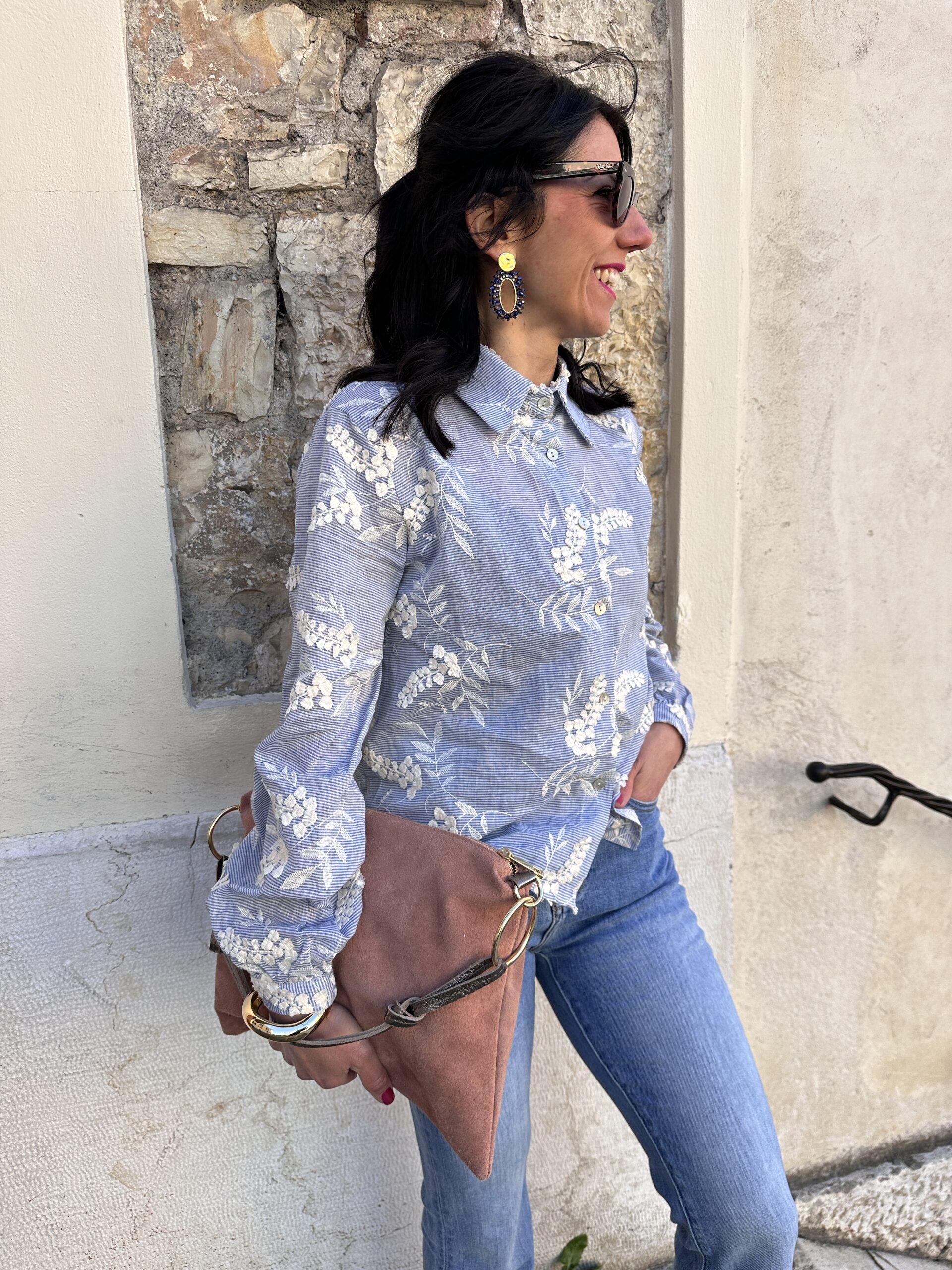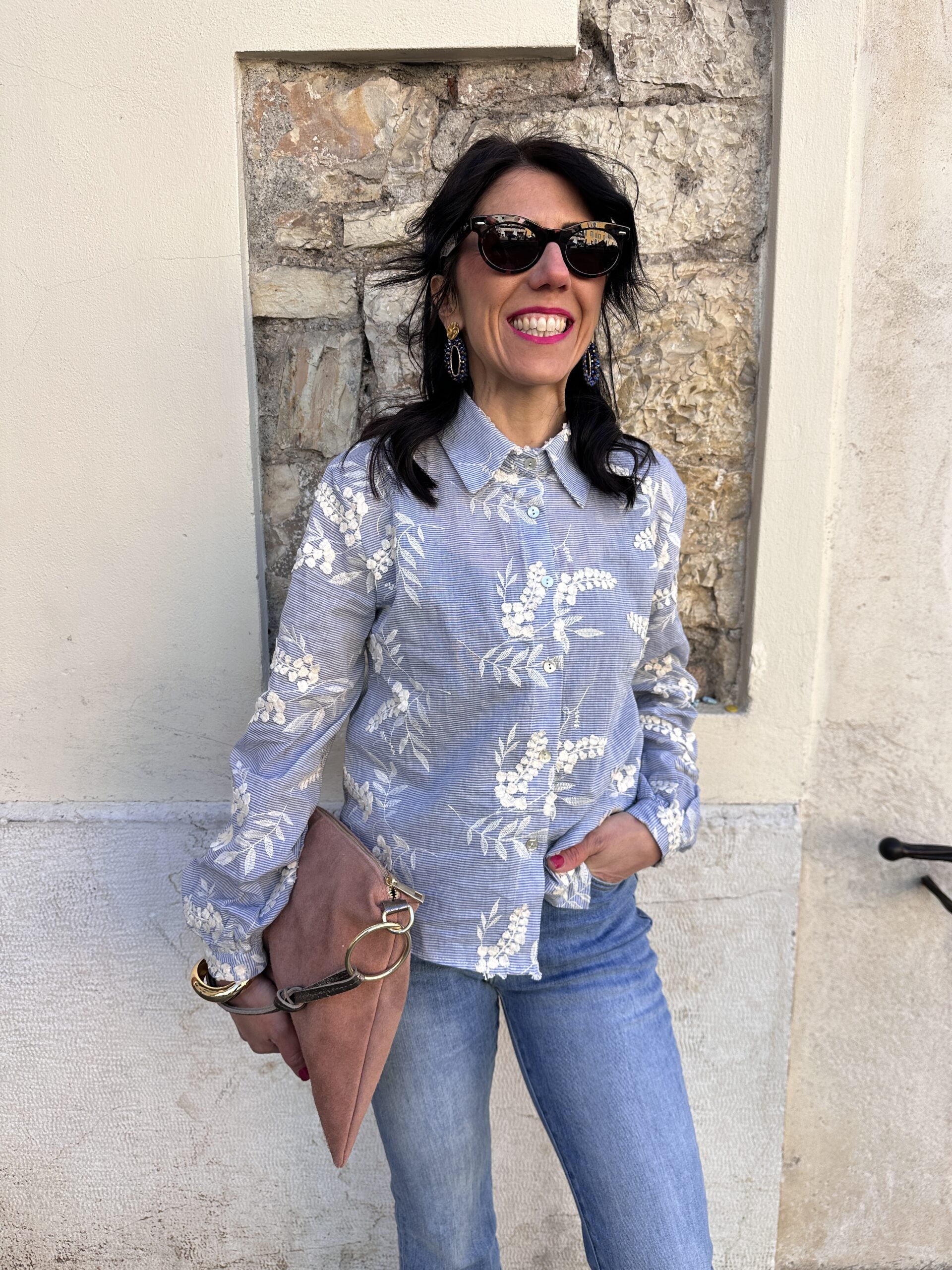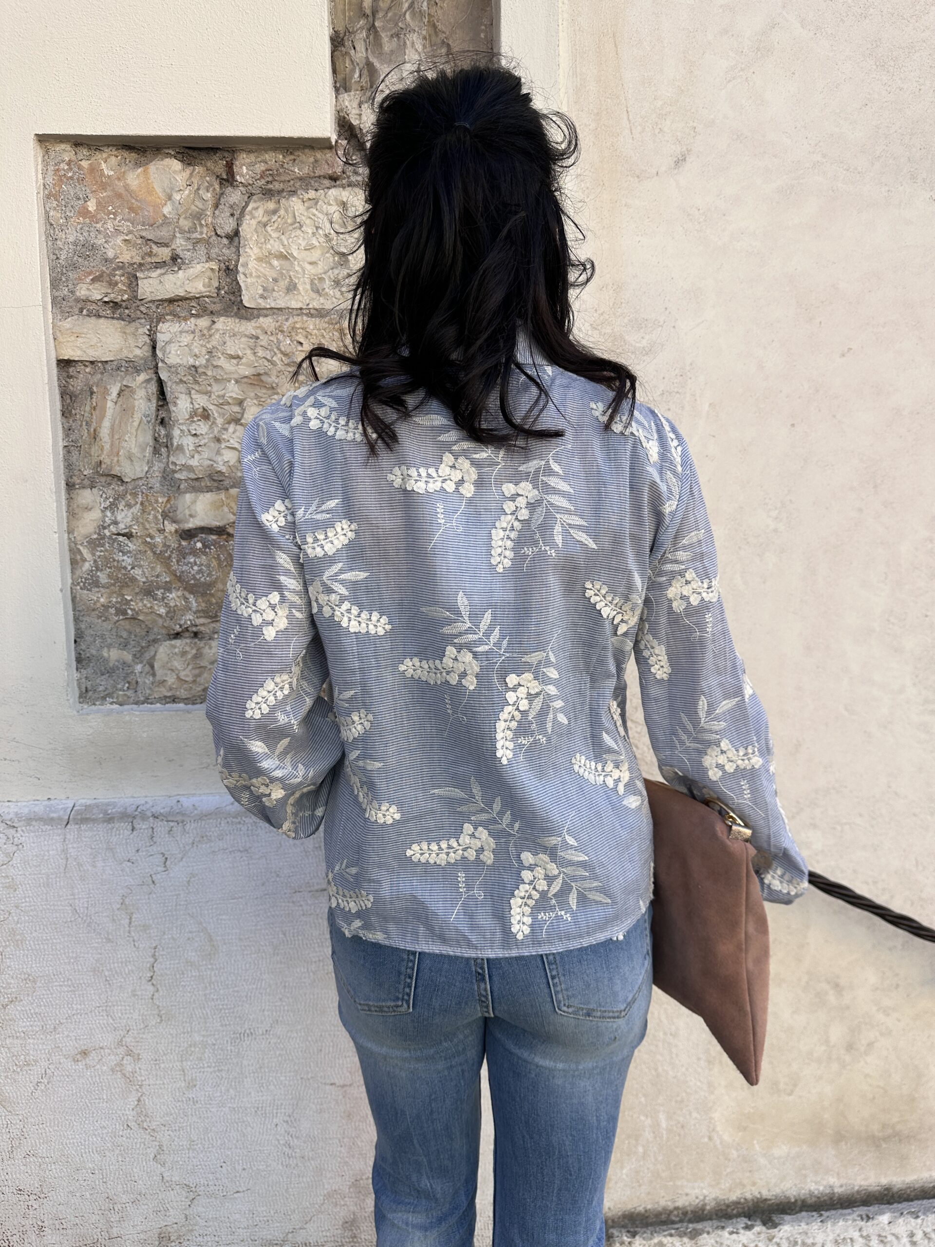 Camicia con riga sottile azzurra e fiori ricamati panna.
