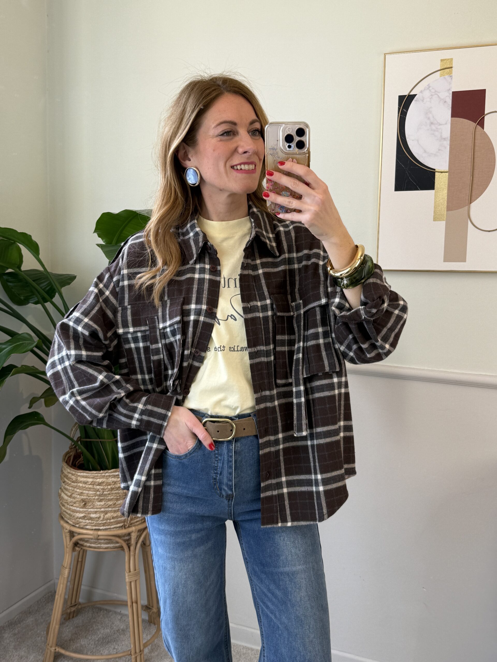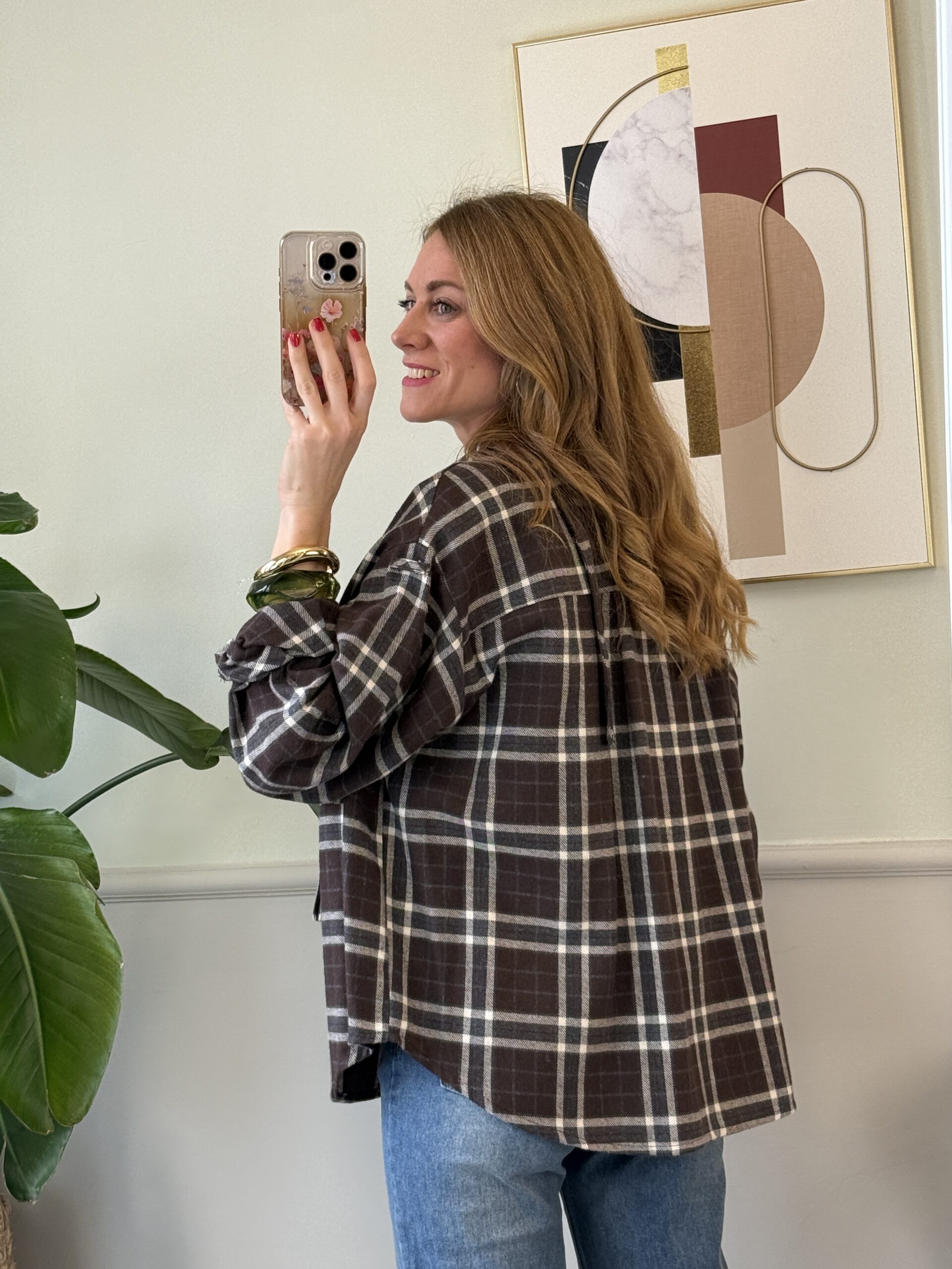 Camicia in flanella in fantasia tartan con tasche applicate sul davanti, spalla scesa e orlo arrotondato più lungo dietro.