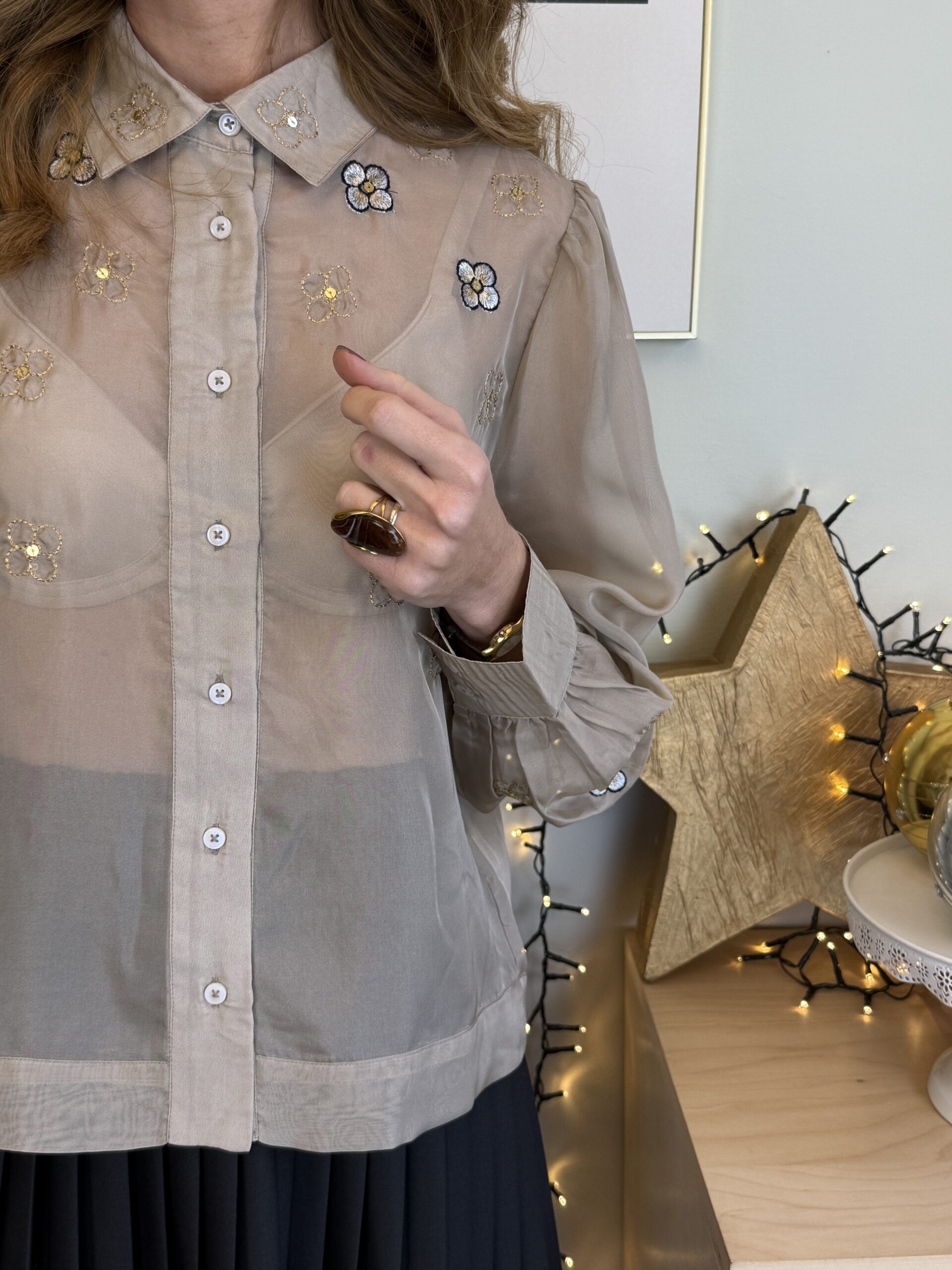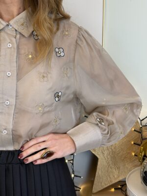 Camicia in voile trasparente con fiori ricamati e paillettes.