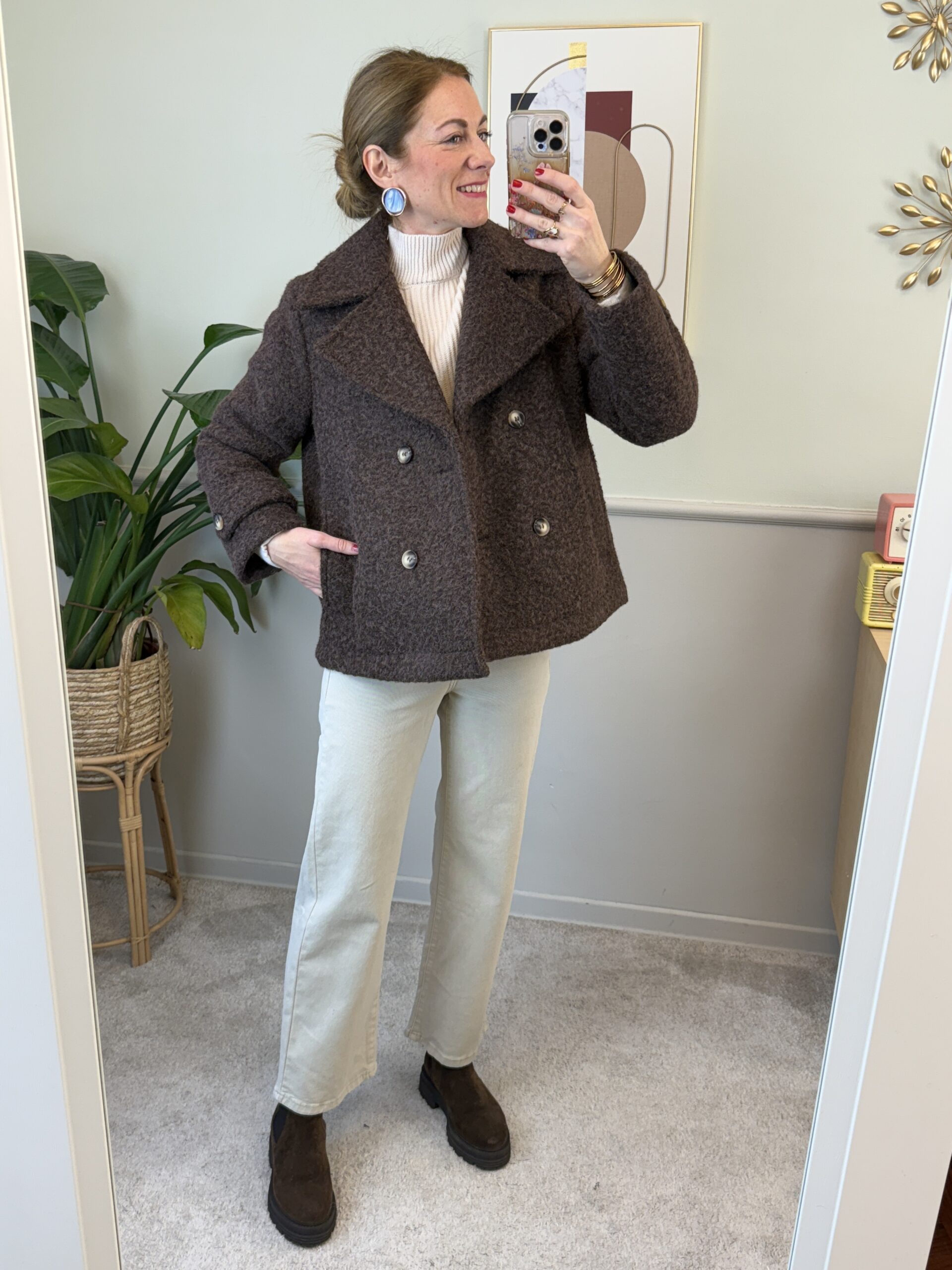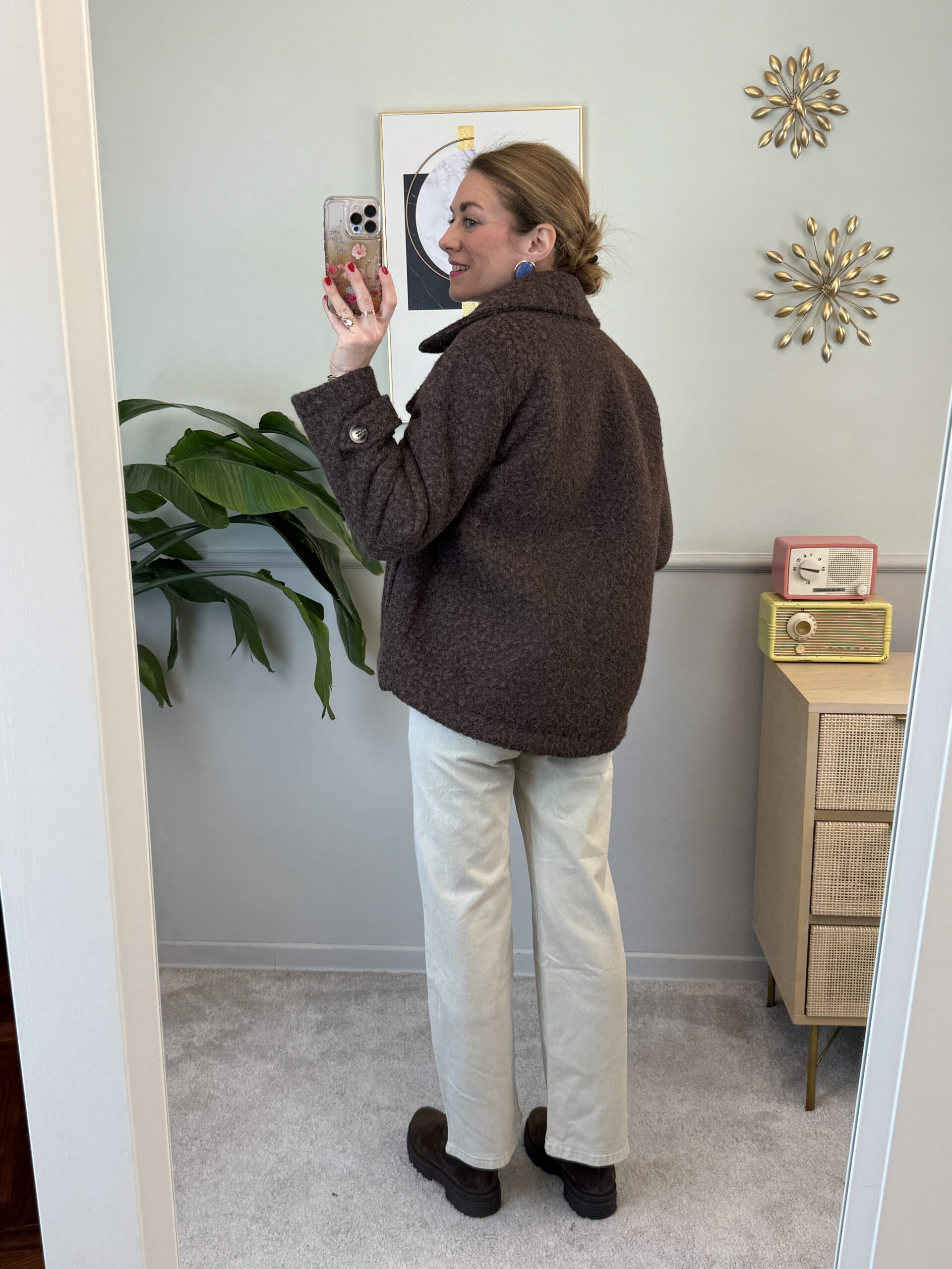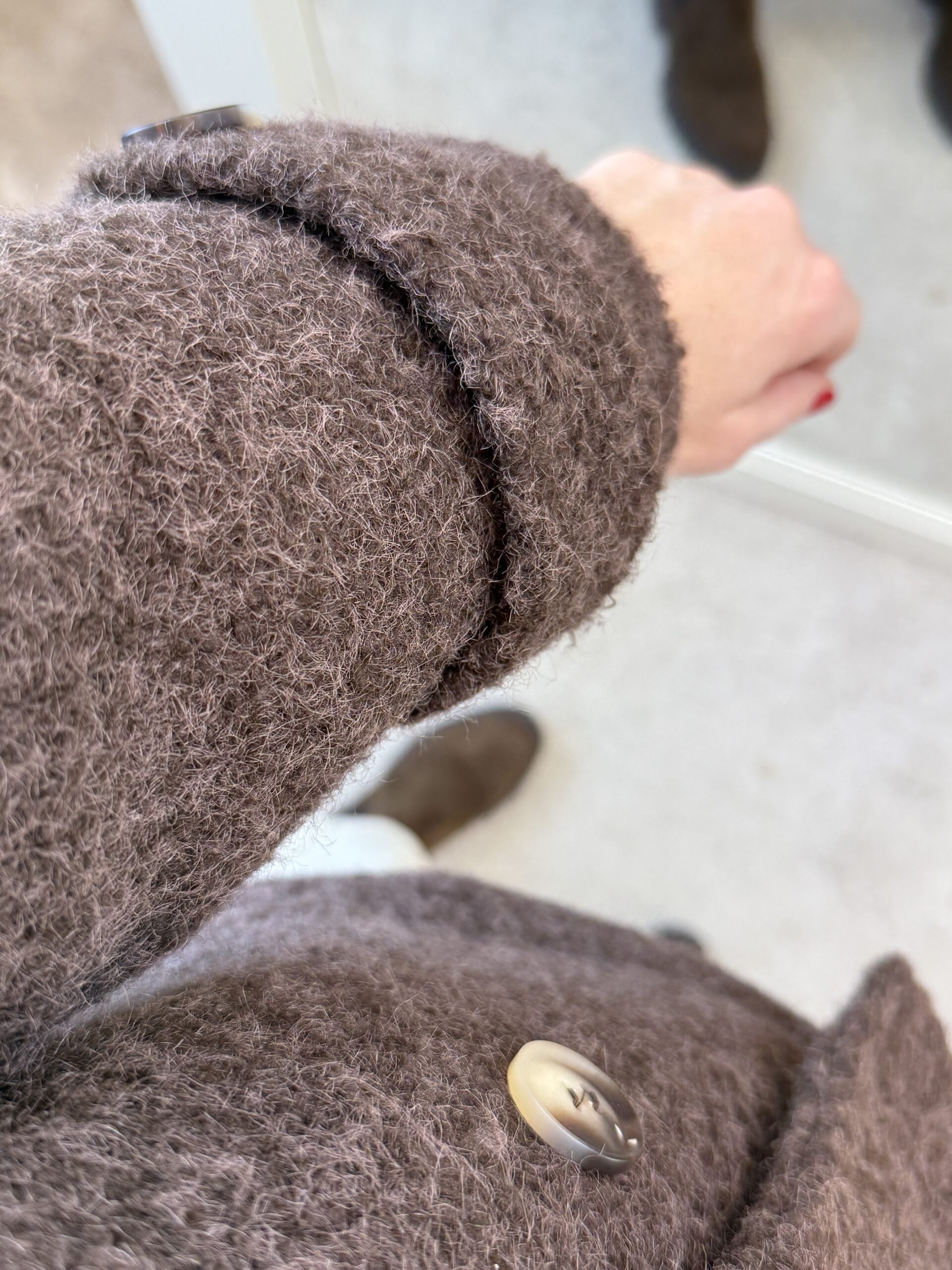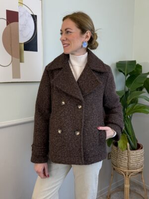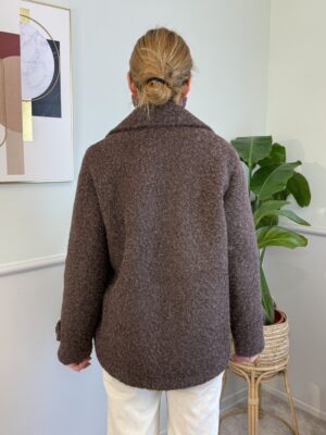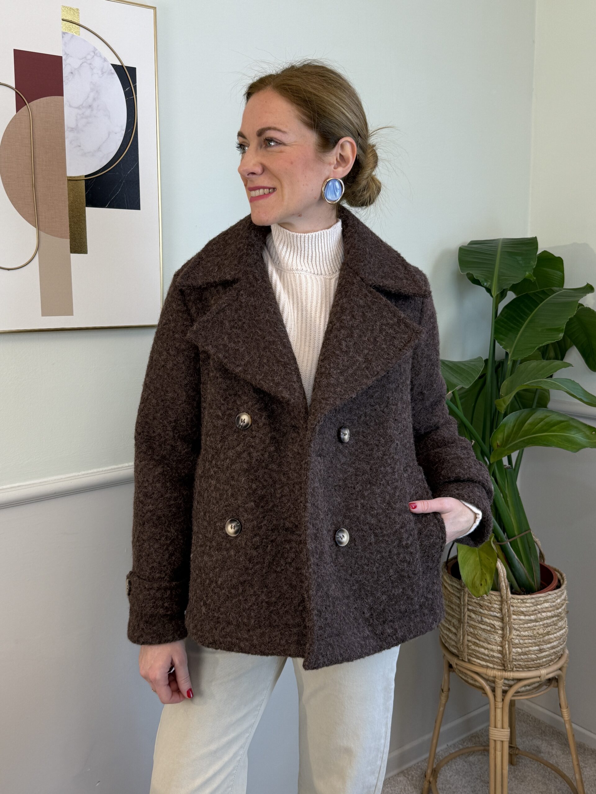 Cappotto in tessuto bouclé doppio petto con spalla regolare, tasche laterali e orlo arrotondato più lungo dietro.