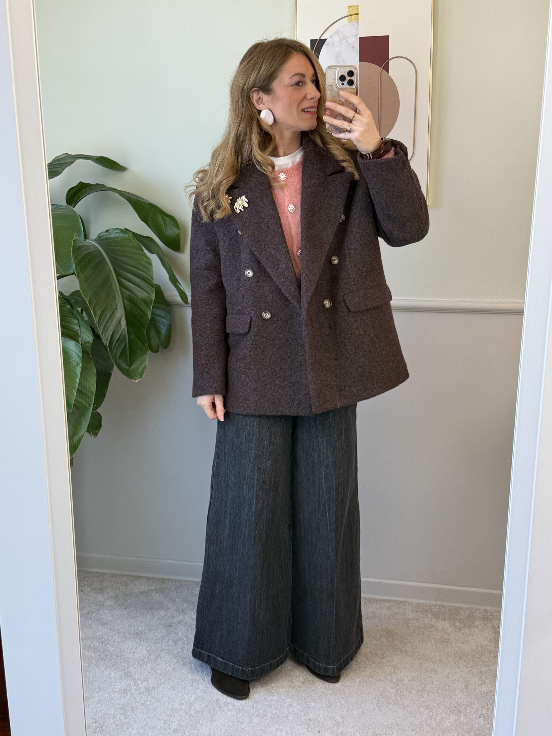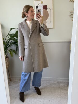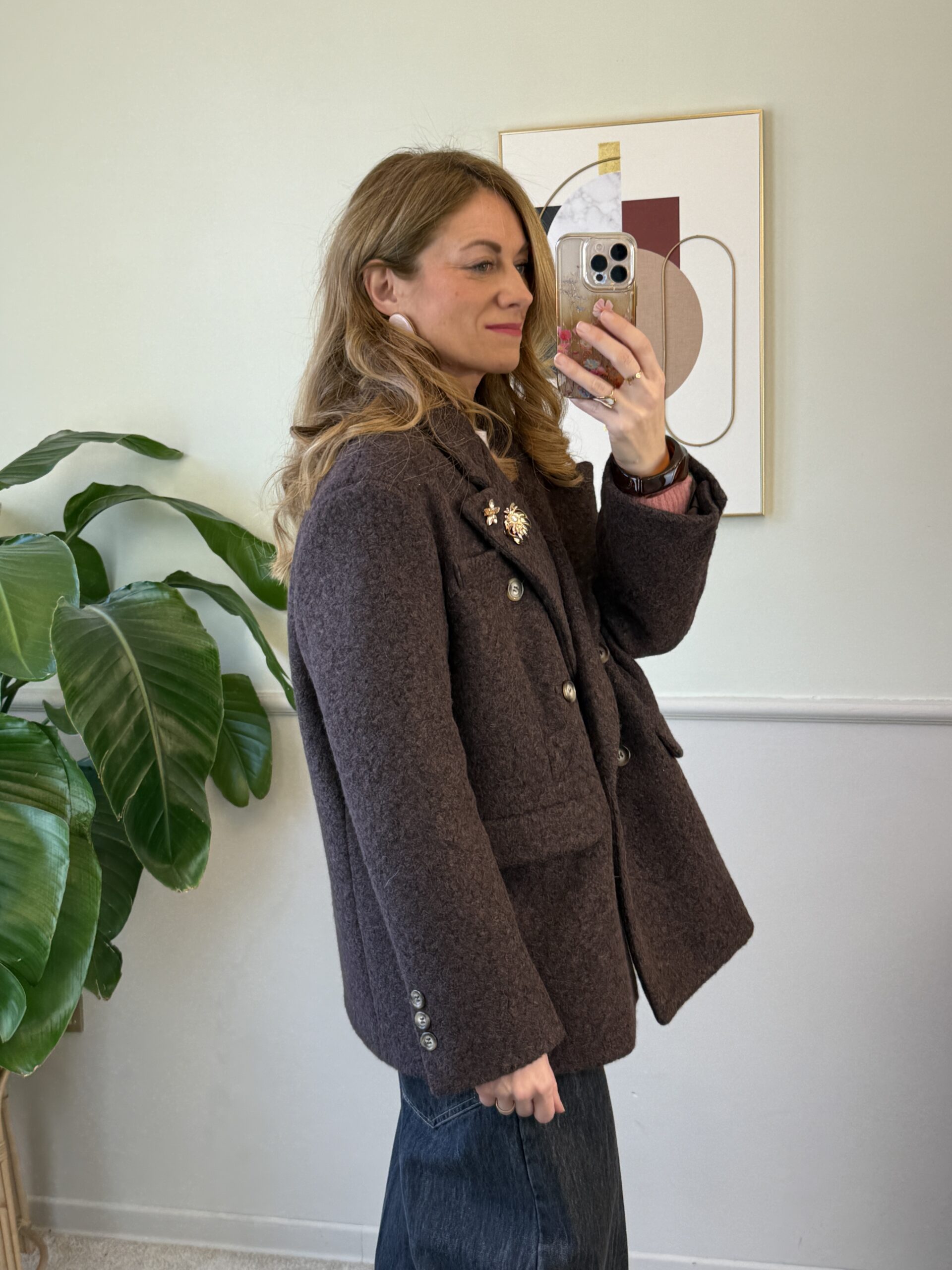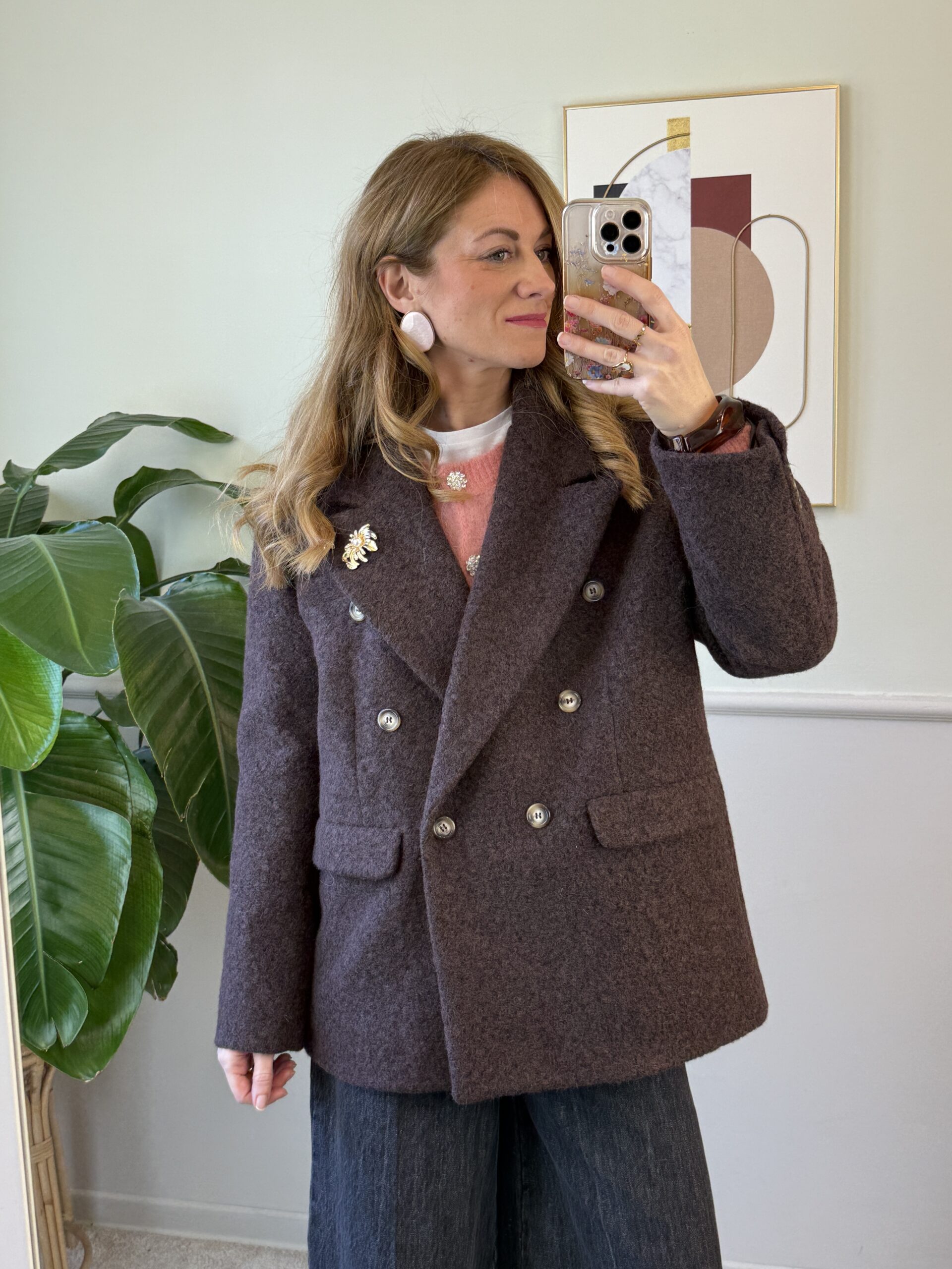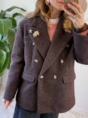 Cappotto corto doppio petto modello over con spalla scesa, foderato, revers a lancia con spille gioiello (le spille gioiello possono cambiare).