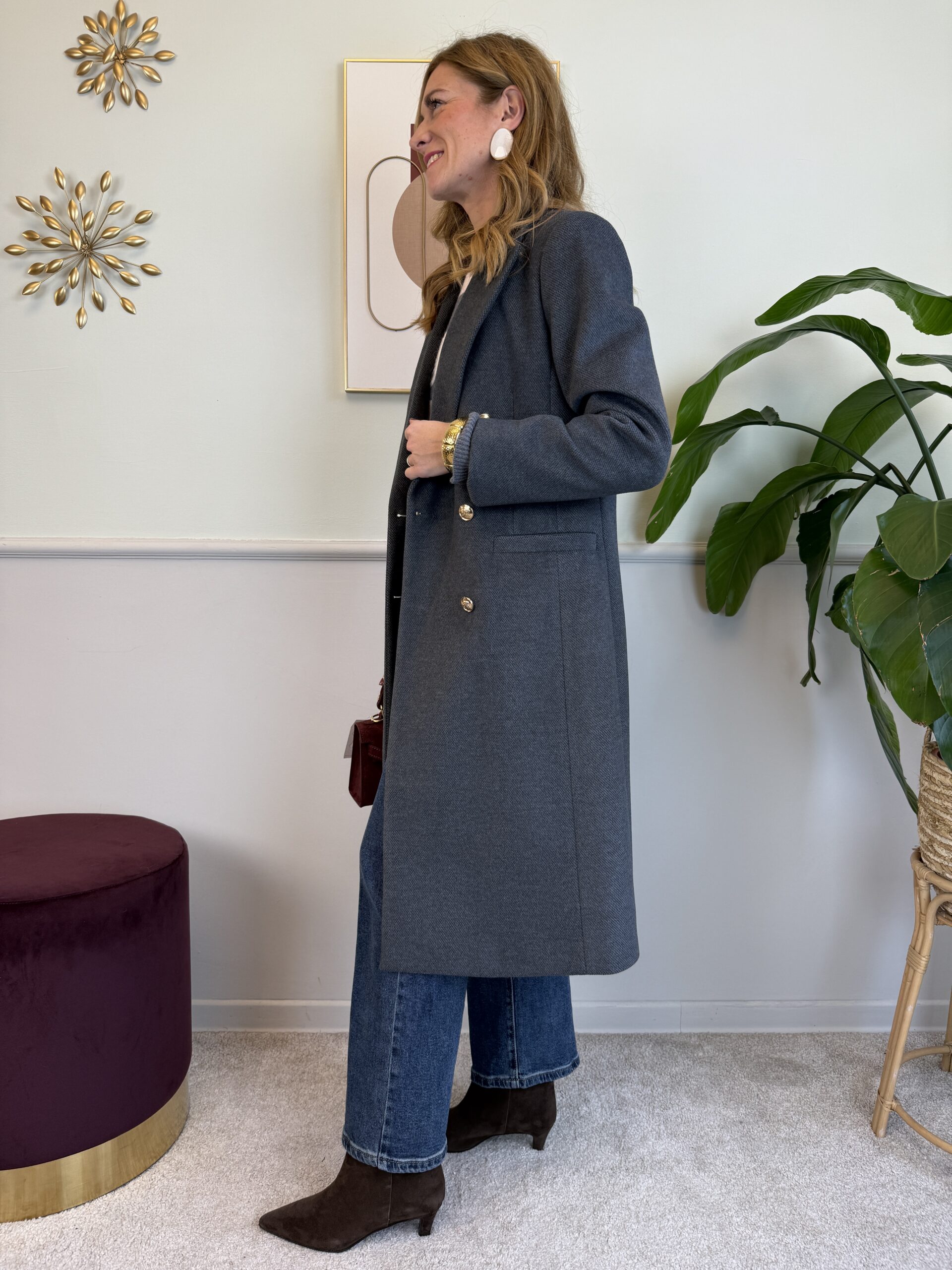 Cappotto sfiancato con doppio petto e bottoni dorati. Foderato con spalline imbottite, scollo revers, tasche a filo da scucire sul davanti.
