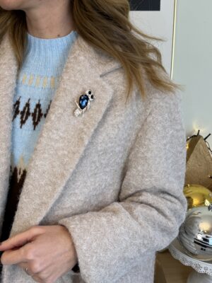 Presente chiusura a due bottoni, due tasche e una spilletta a forma di gufo.