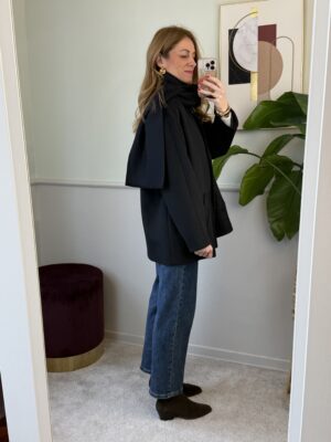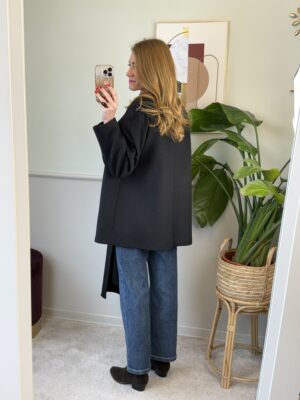 Cappotto nero modello trapezio con sciarpa al collo, foderato, spalla scesa e tasche oblique sul davanti da scucire.