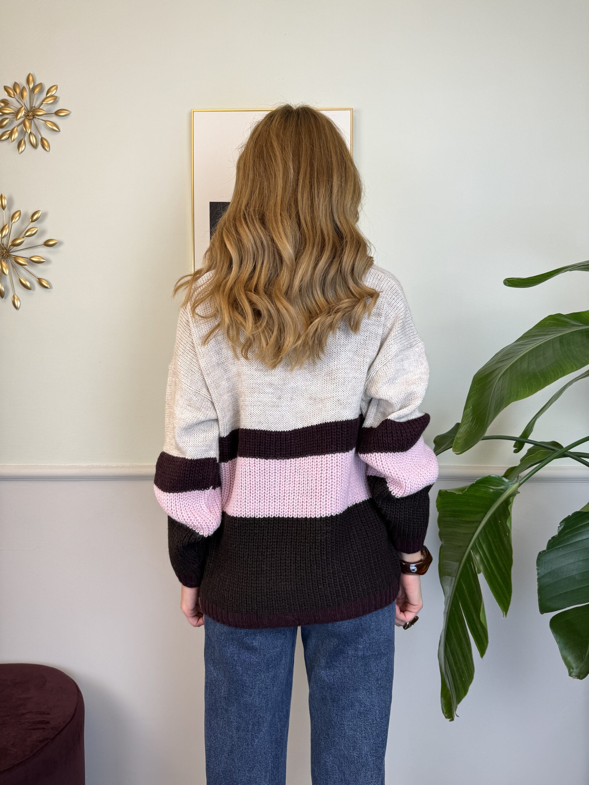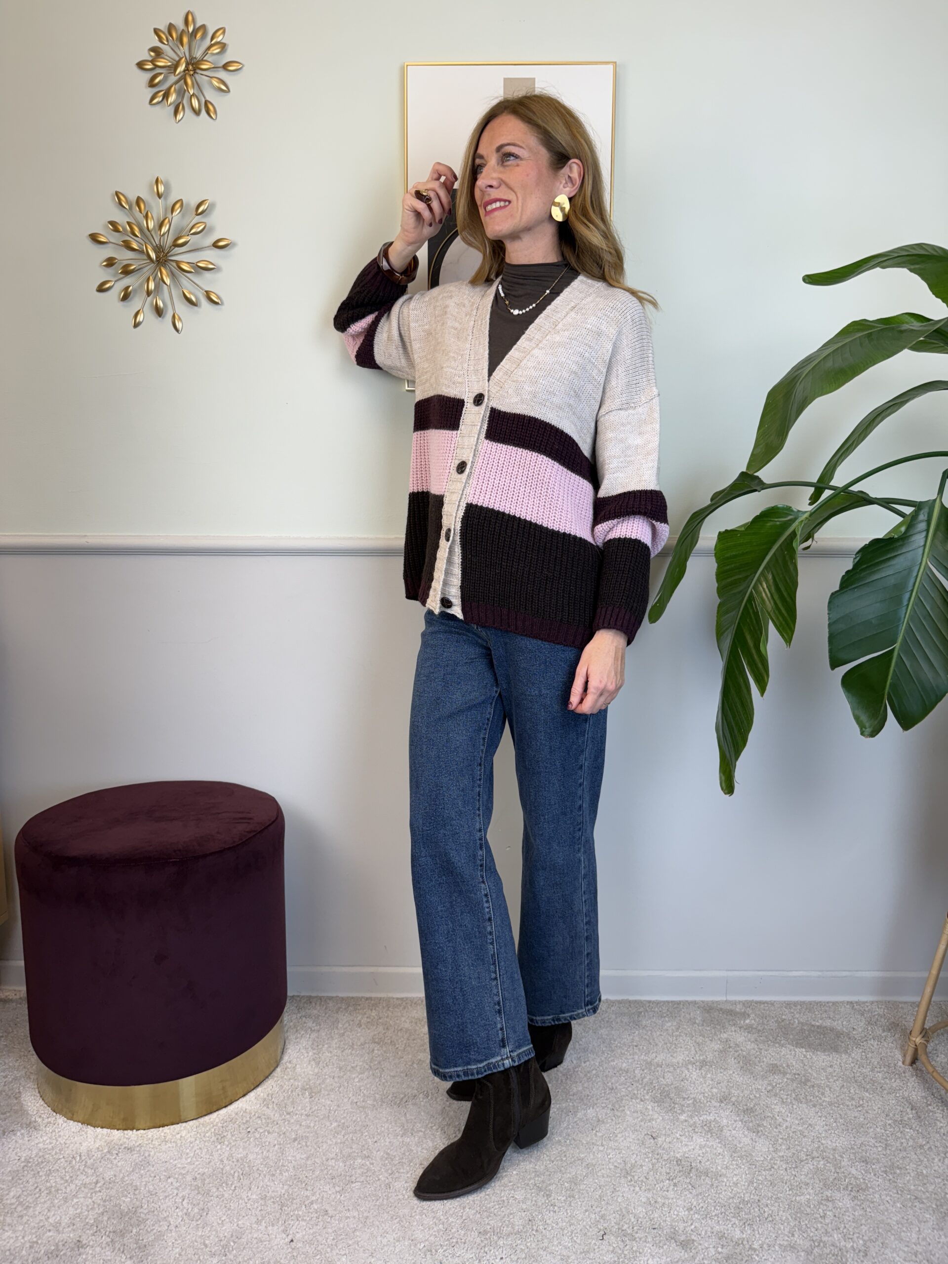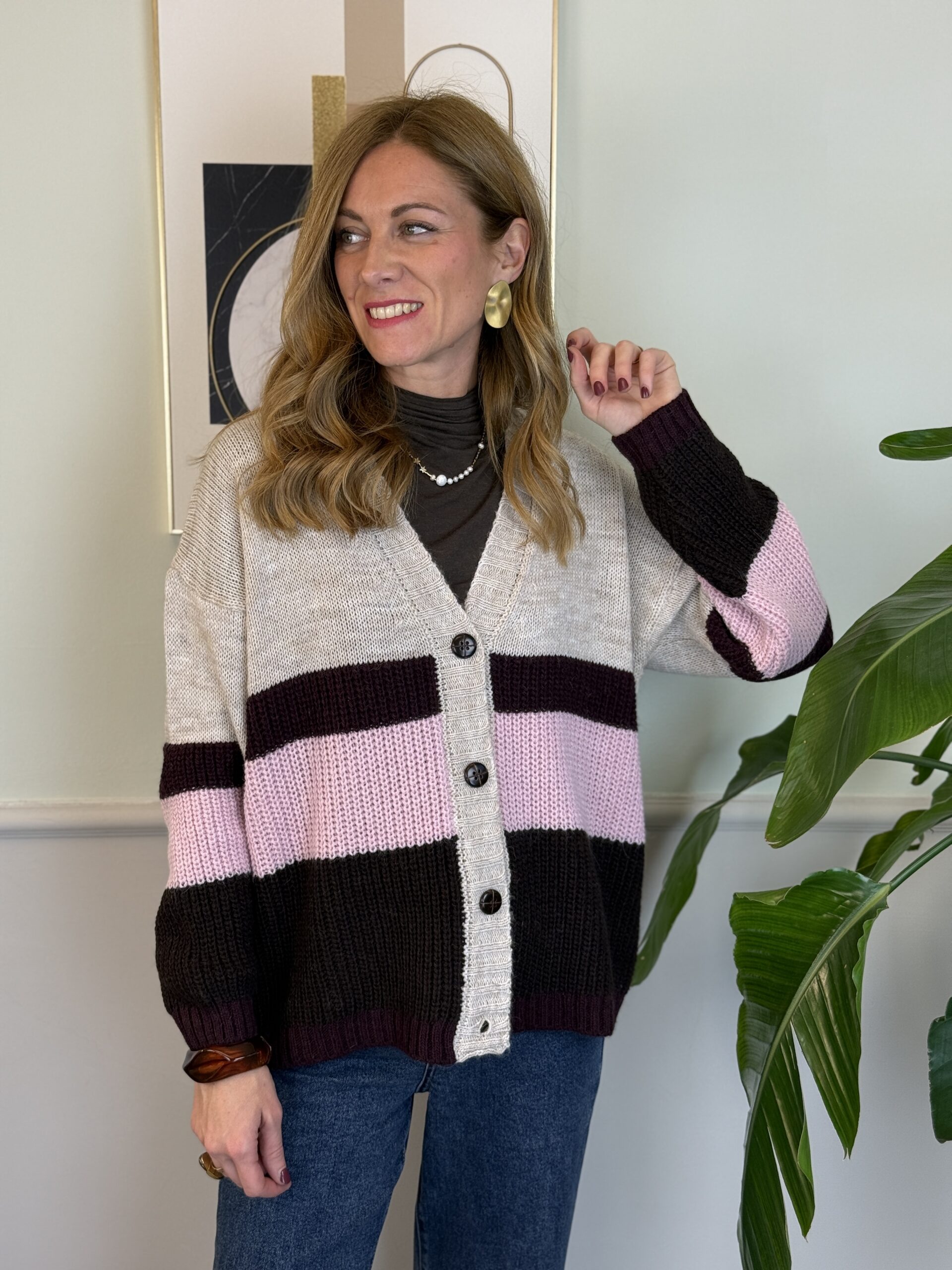 Maxi cardigan in maglia misto lana e alpaca, scollo a V con righe colorate.