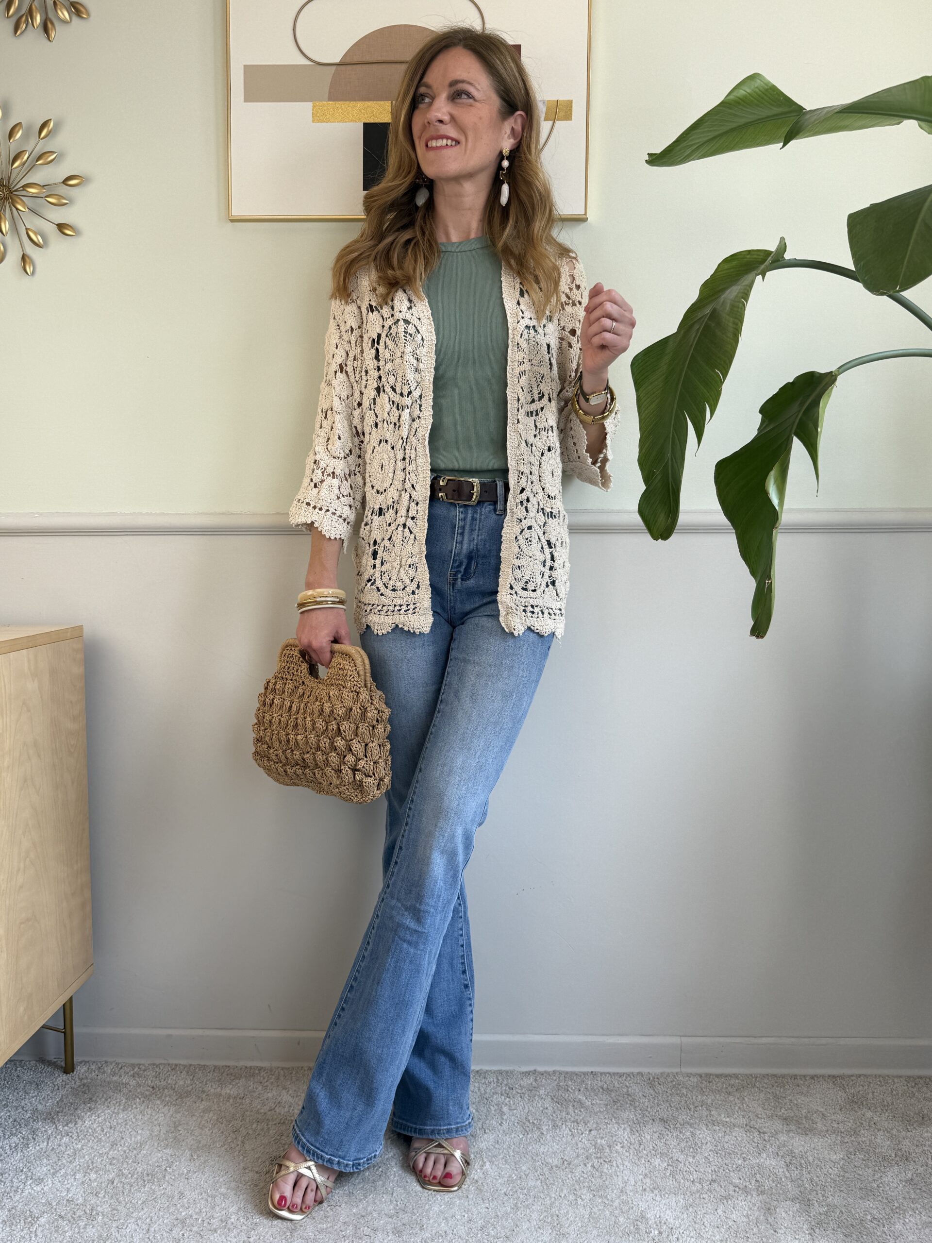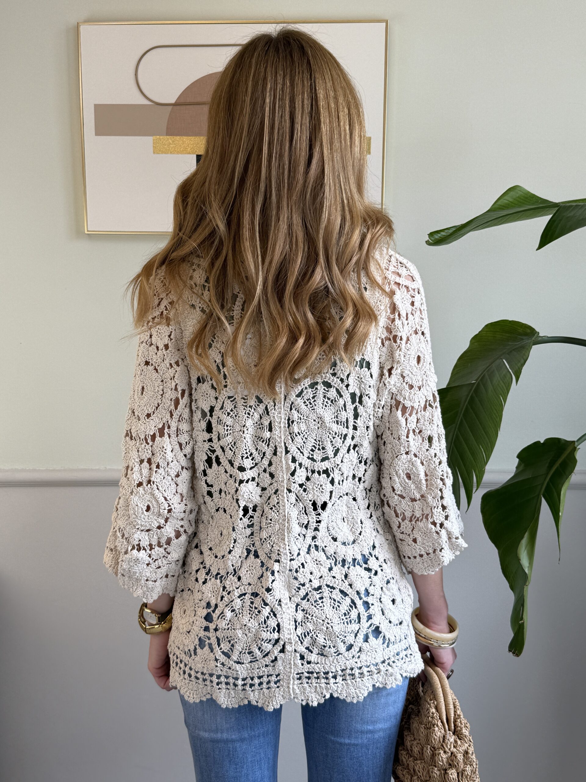 Cardigan in tessuto crochet con manica a7/8 e orli a cappe.