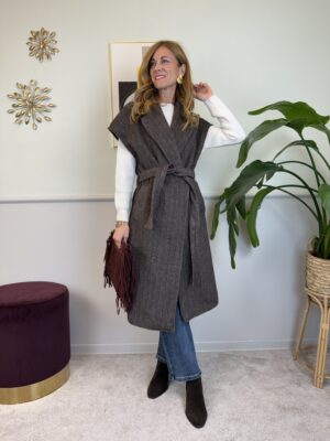 Cardigan corto a scatolina con fili a contrasto ricamati, bottini in legno, scollo a V.