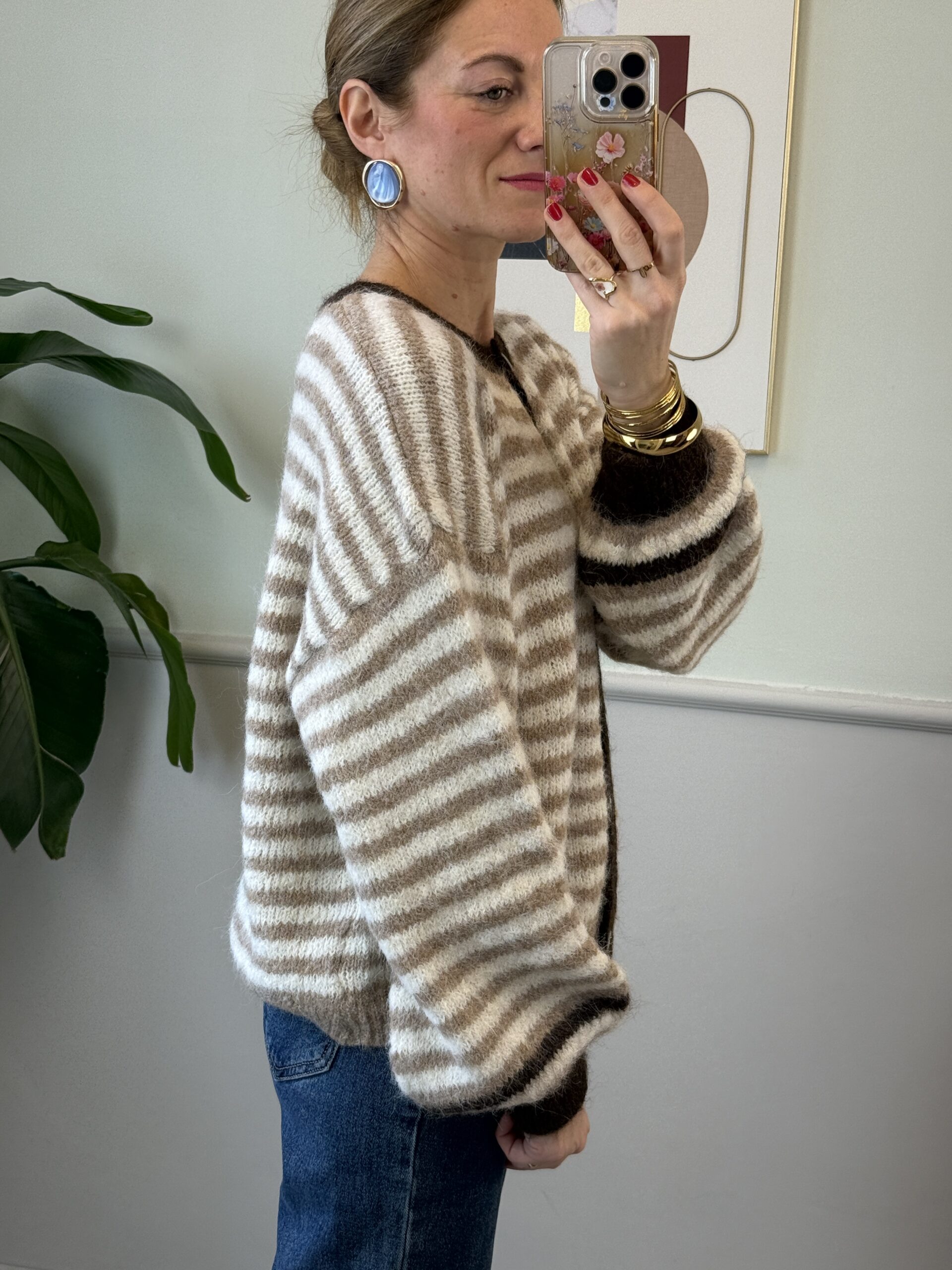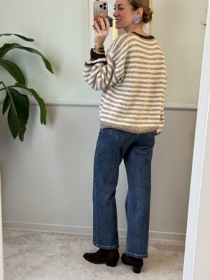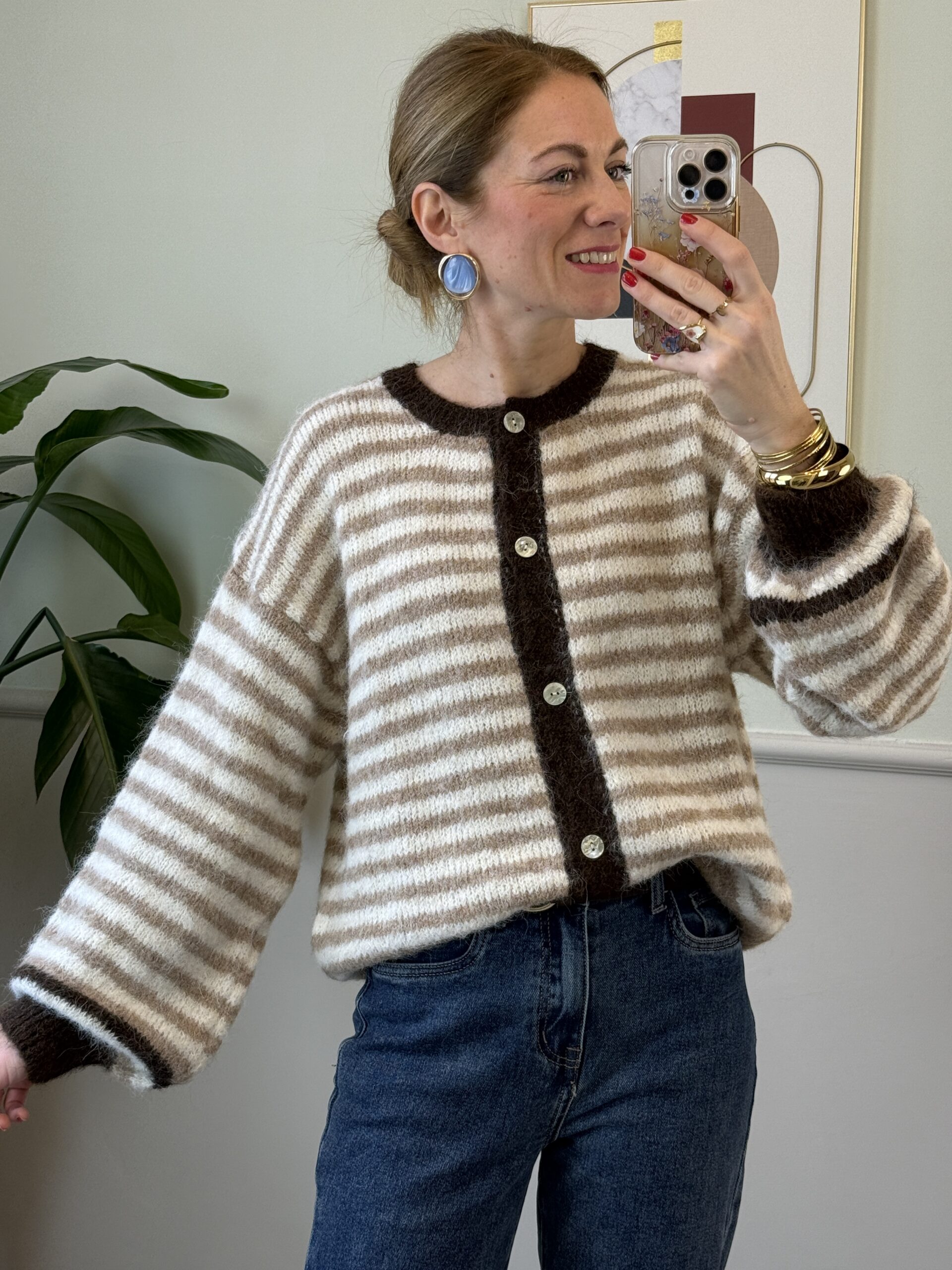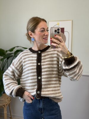 Cardigan con girocollo a fantasia rigata sui toni del nocciola, panna e moro.