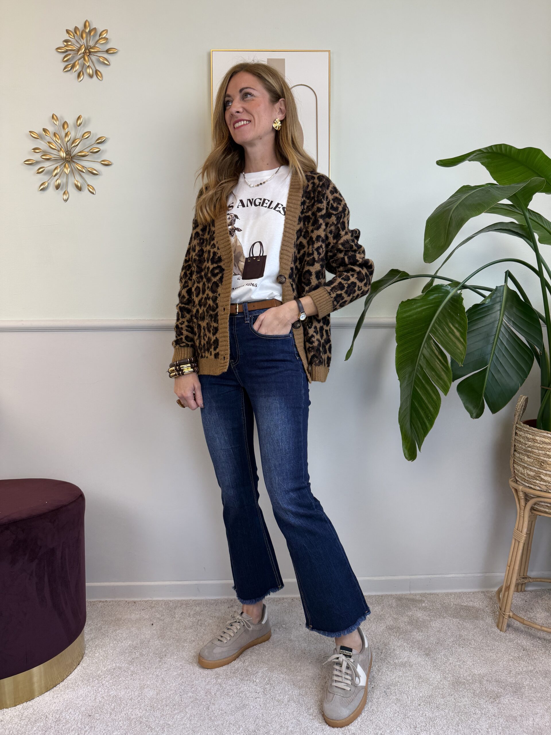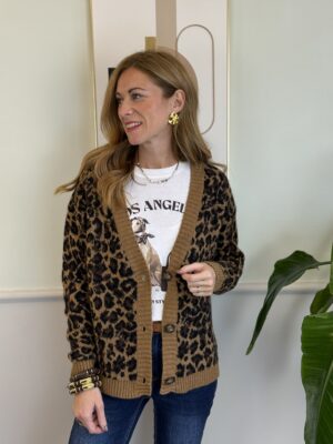 Cardigan a 3 bottoni con fantasia maculata sui toni del biscotto, nero e marrone. Polsini e bordatura tono su tono color biscotto.