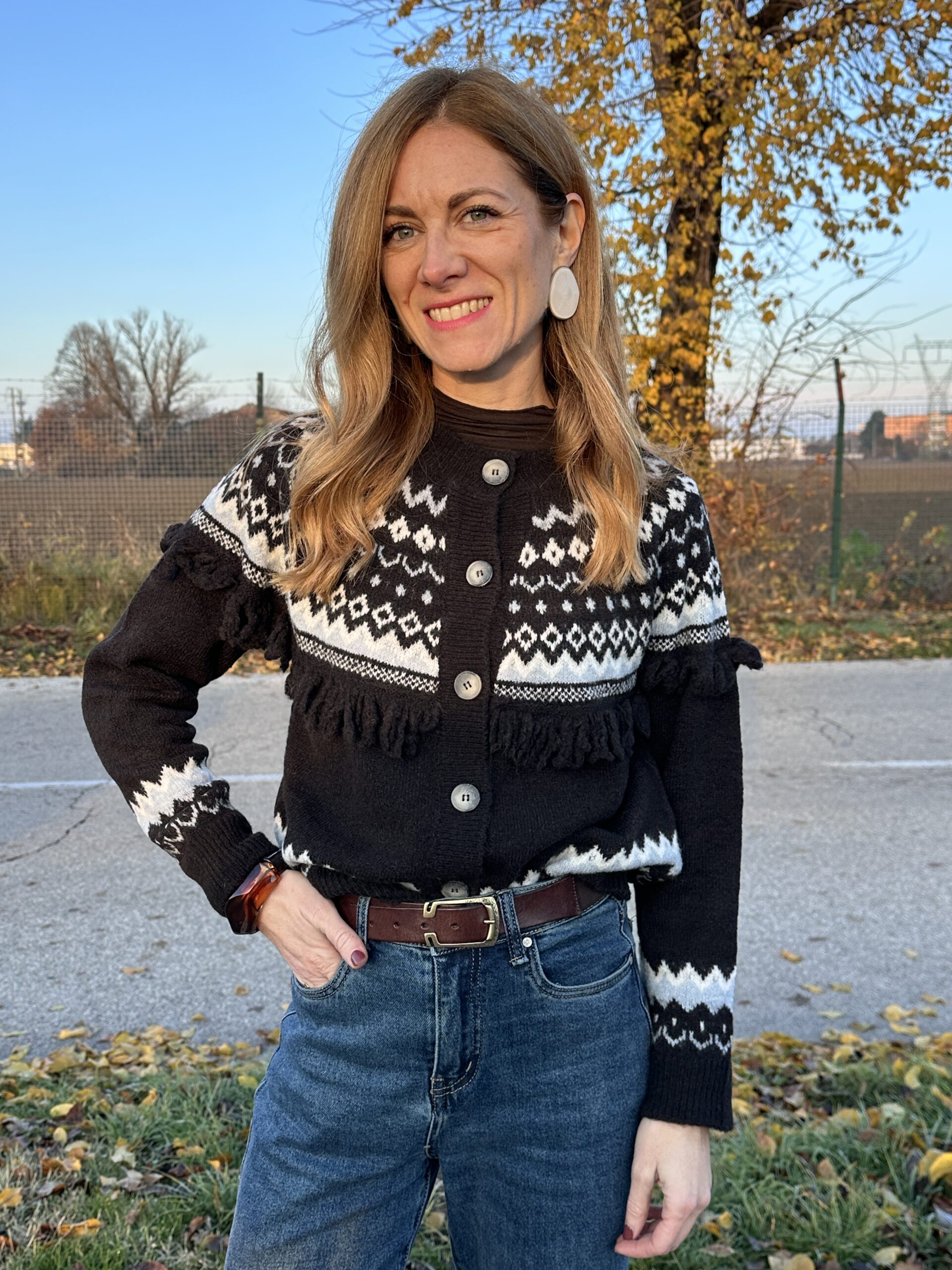 Cardigan base marrone con disegni jaquardes panna azzurri sul carrè e piccole frange