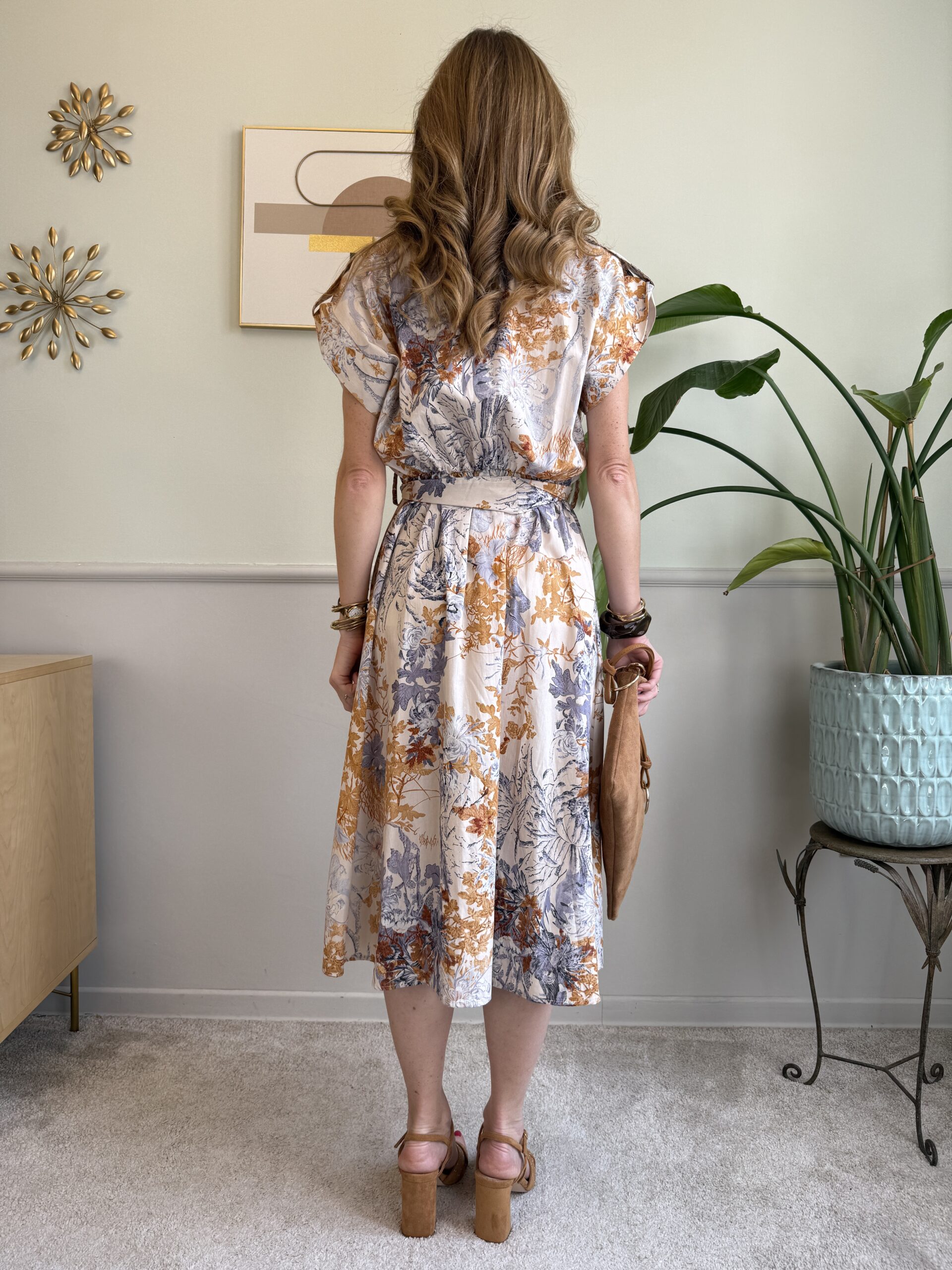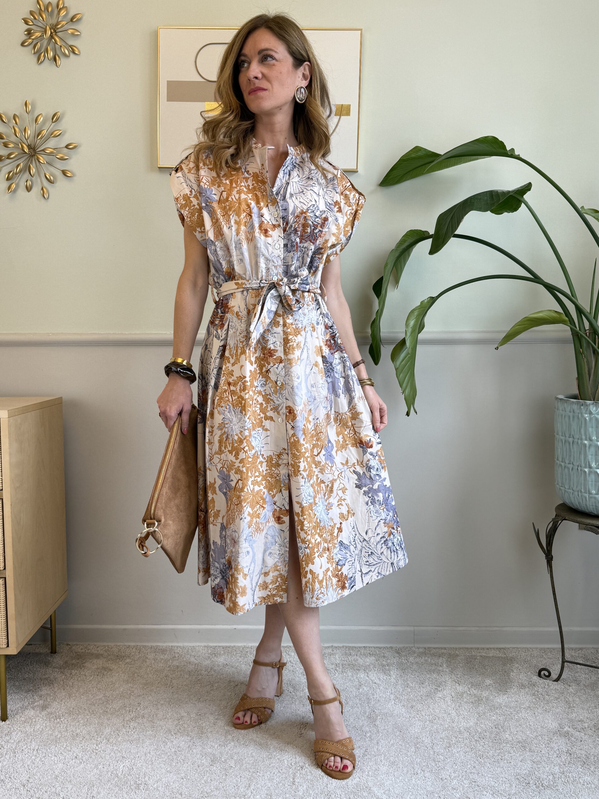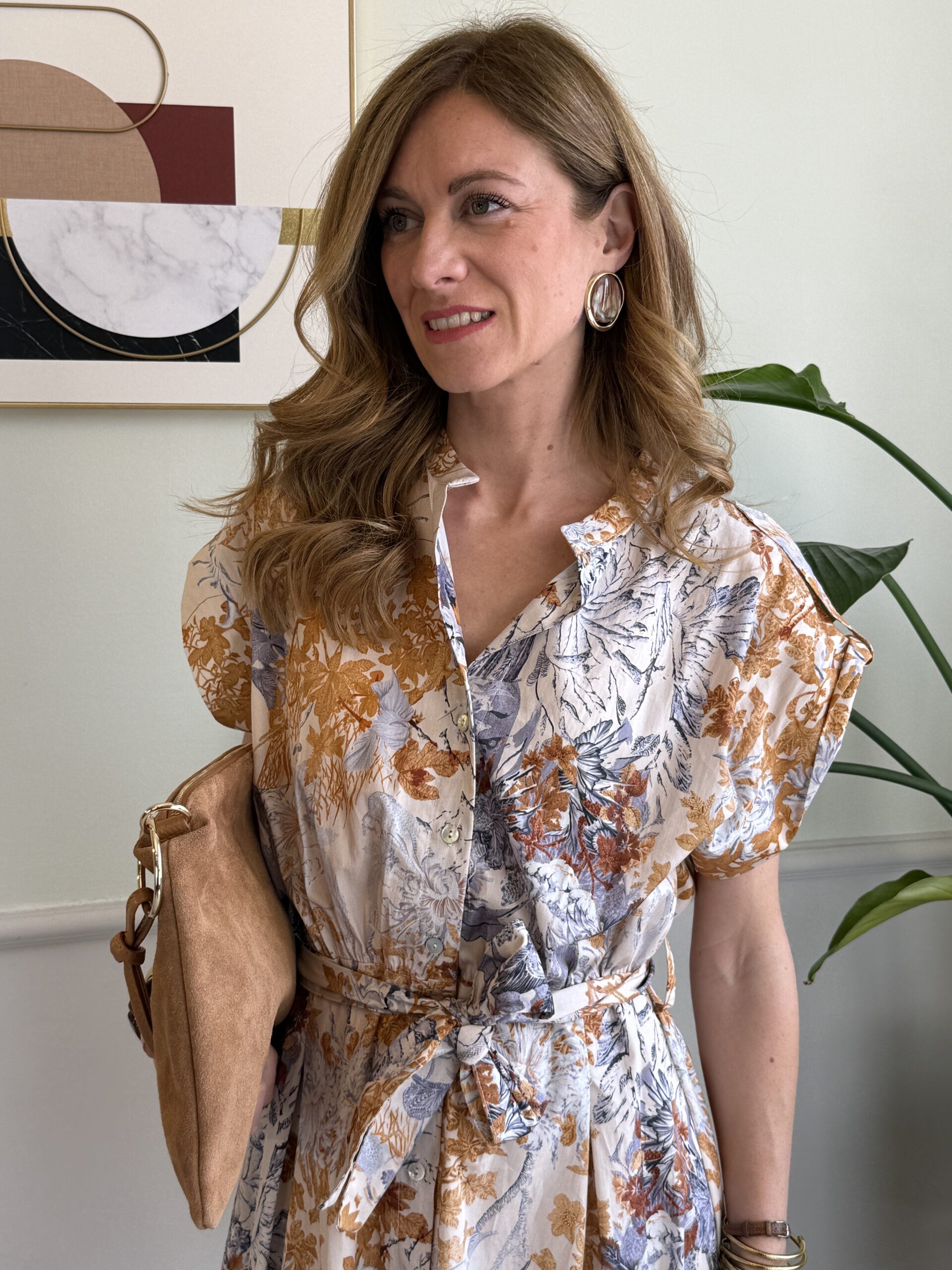 Chemisier midi in cotone fantasia rami e foglie.