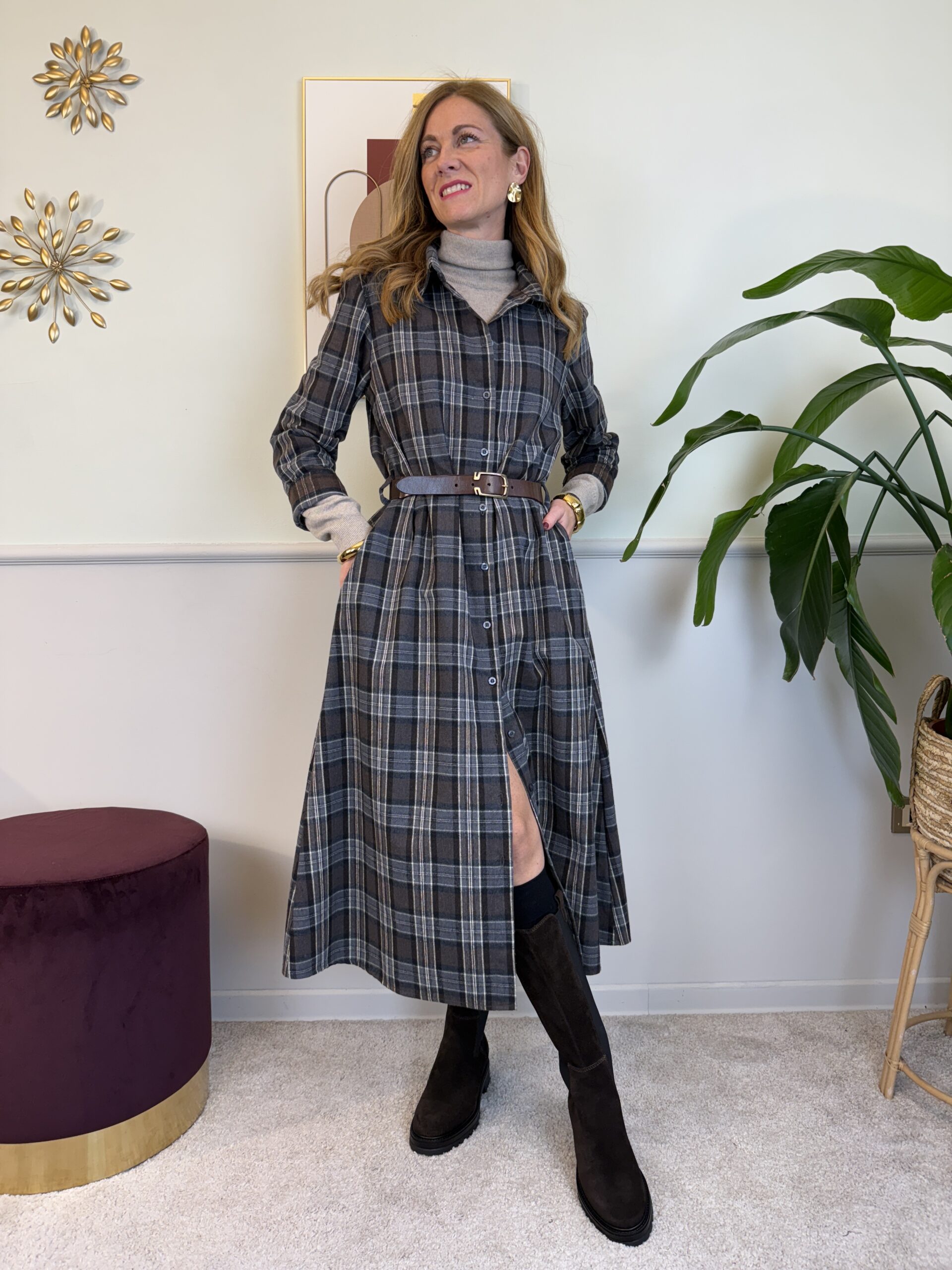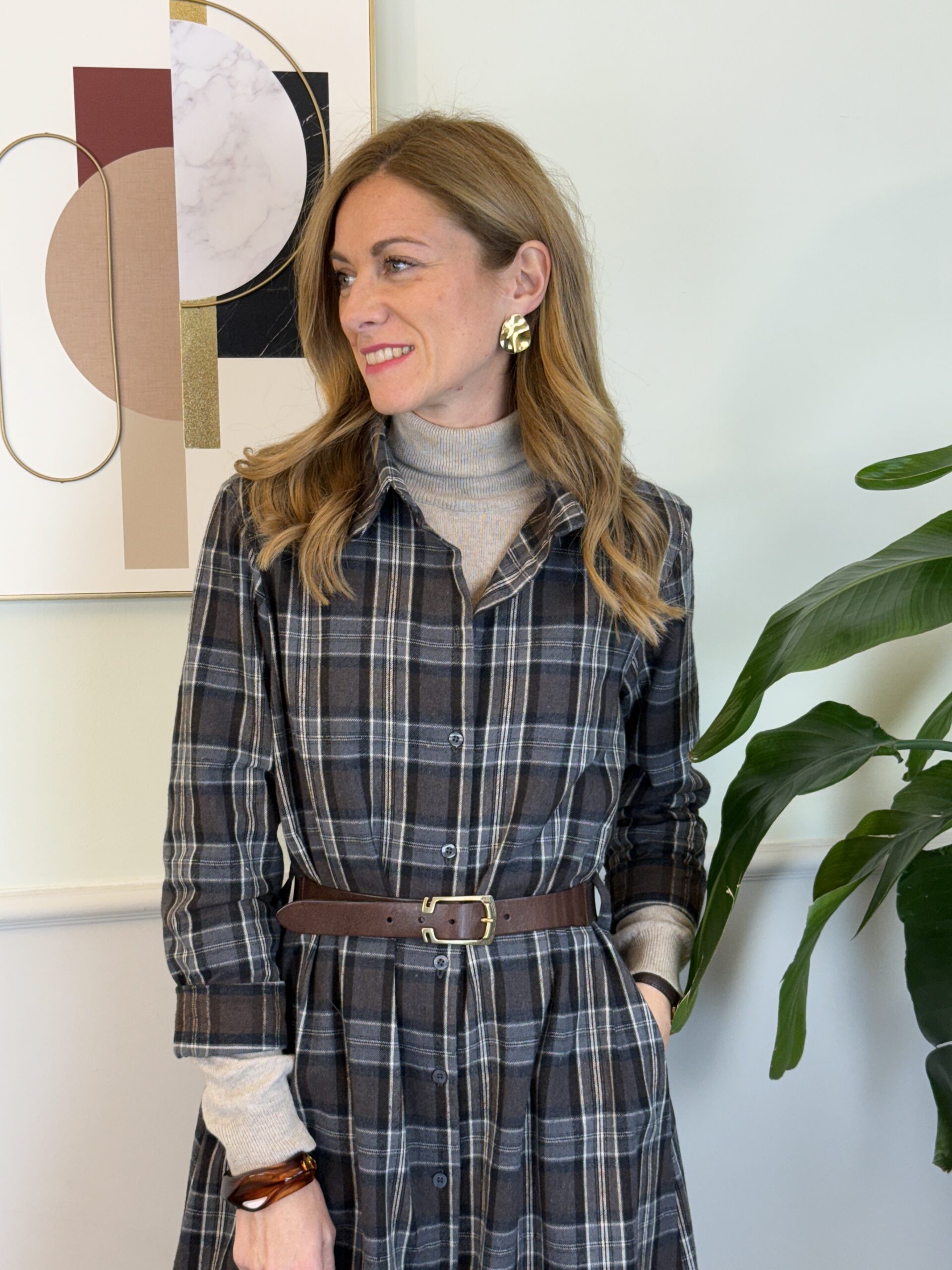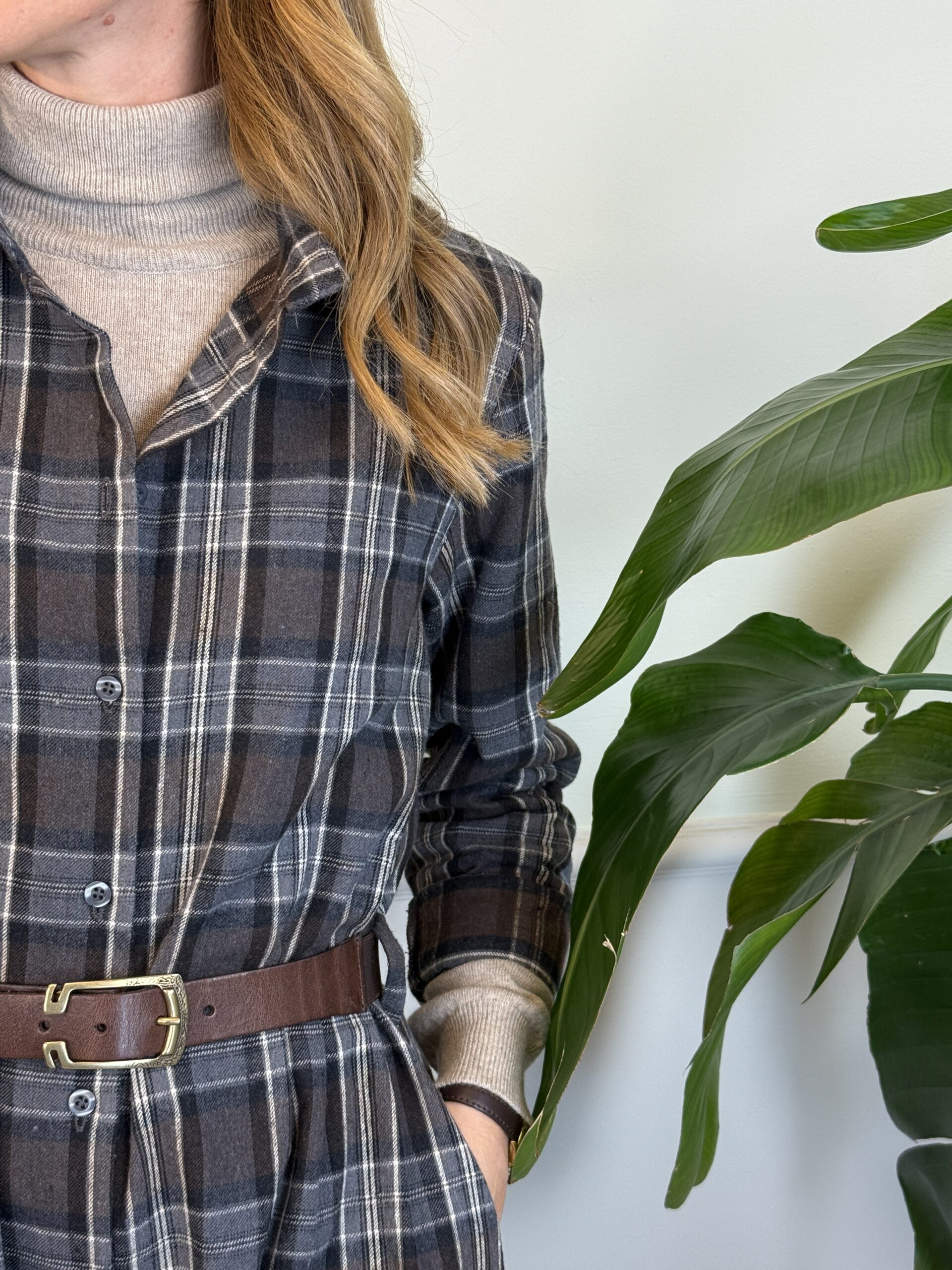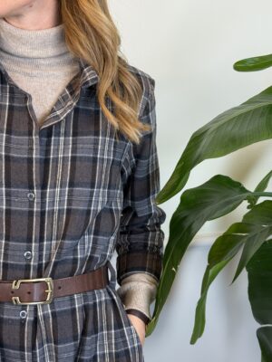 Chemisier lungo in flanella con colletto camicia, spalline imbottite, tasche laterali invisibili e cinturina sottile in vita (di serie) in ecopelle.