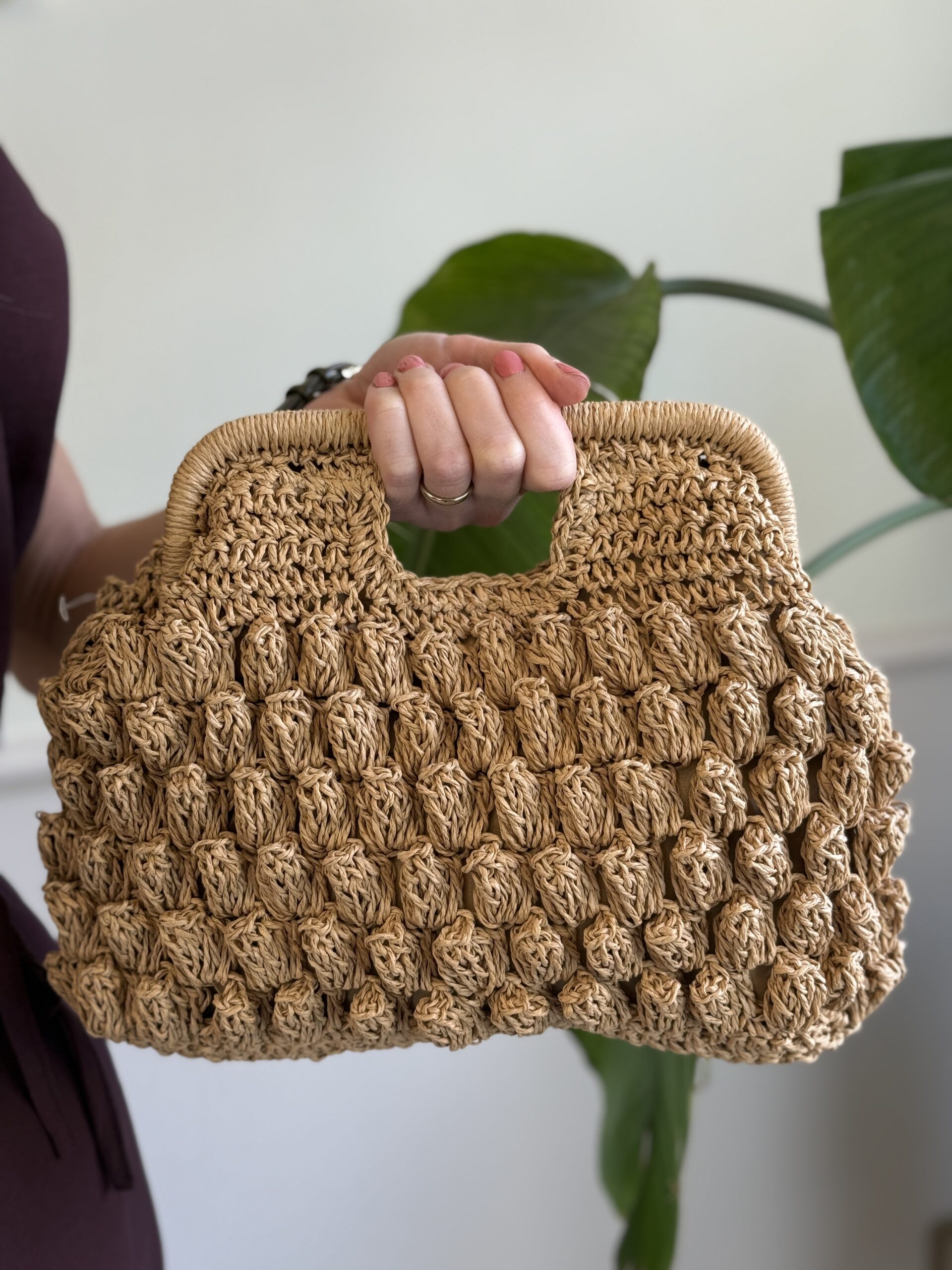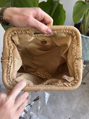 Clutch in rafia lavorazione in punto riso, rivestita in stoffa internamente.