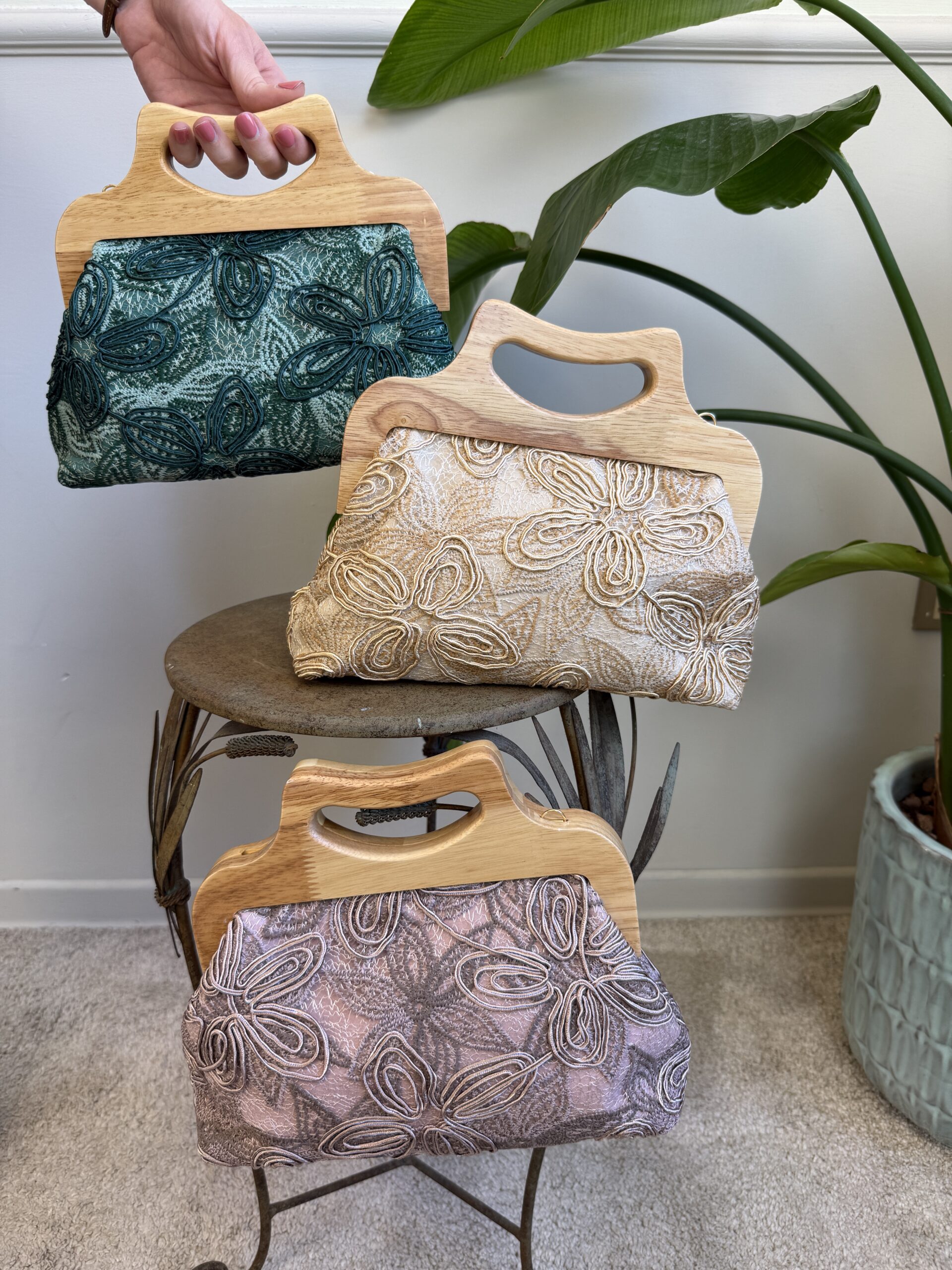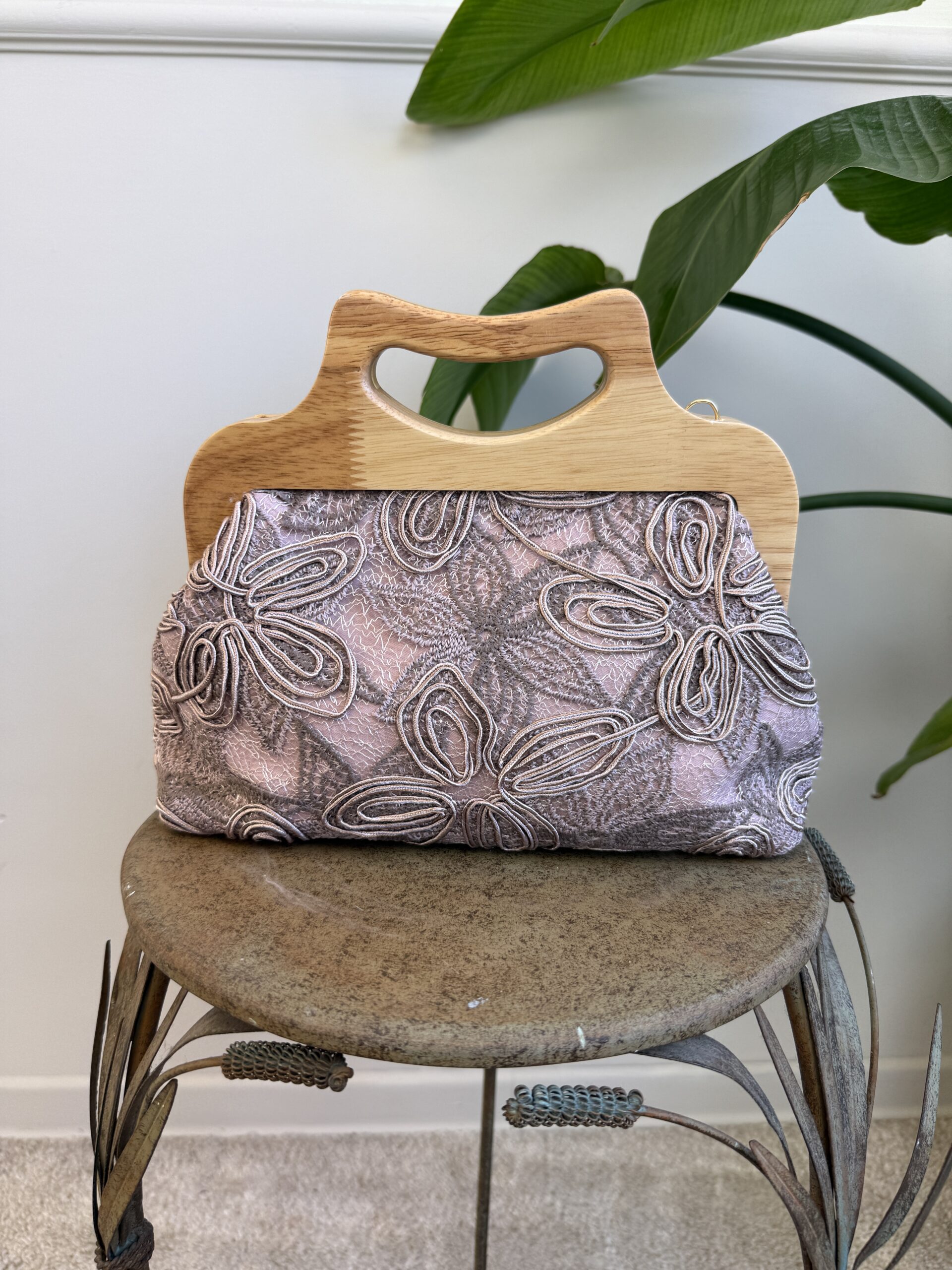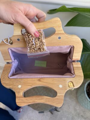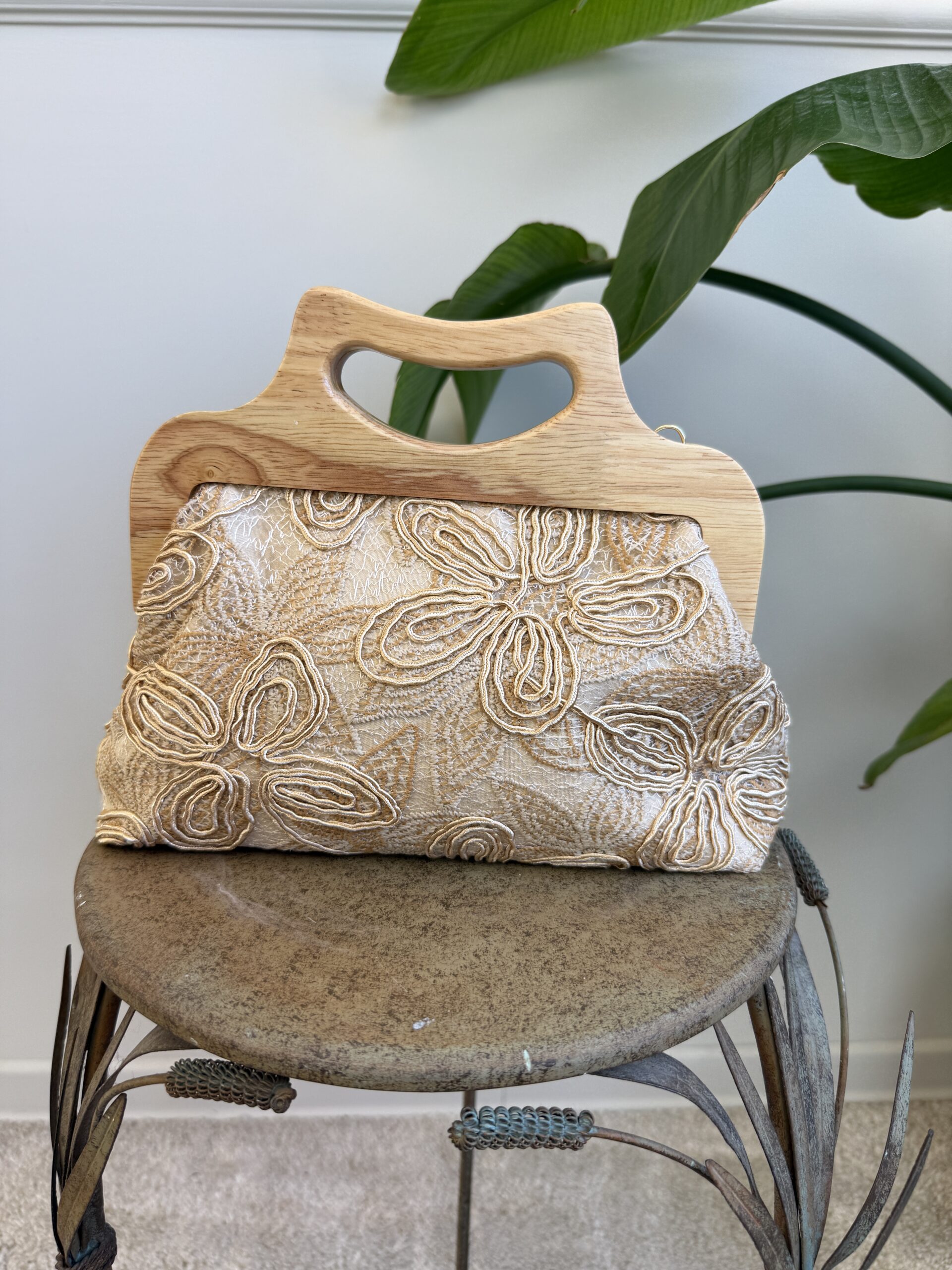 Clutch in stoffa ricamata con manico in legno e tracolla dorata.