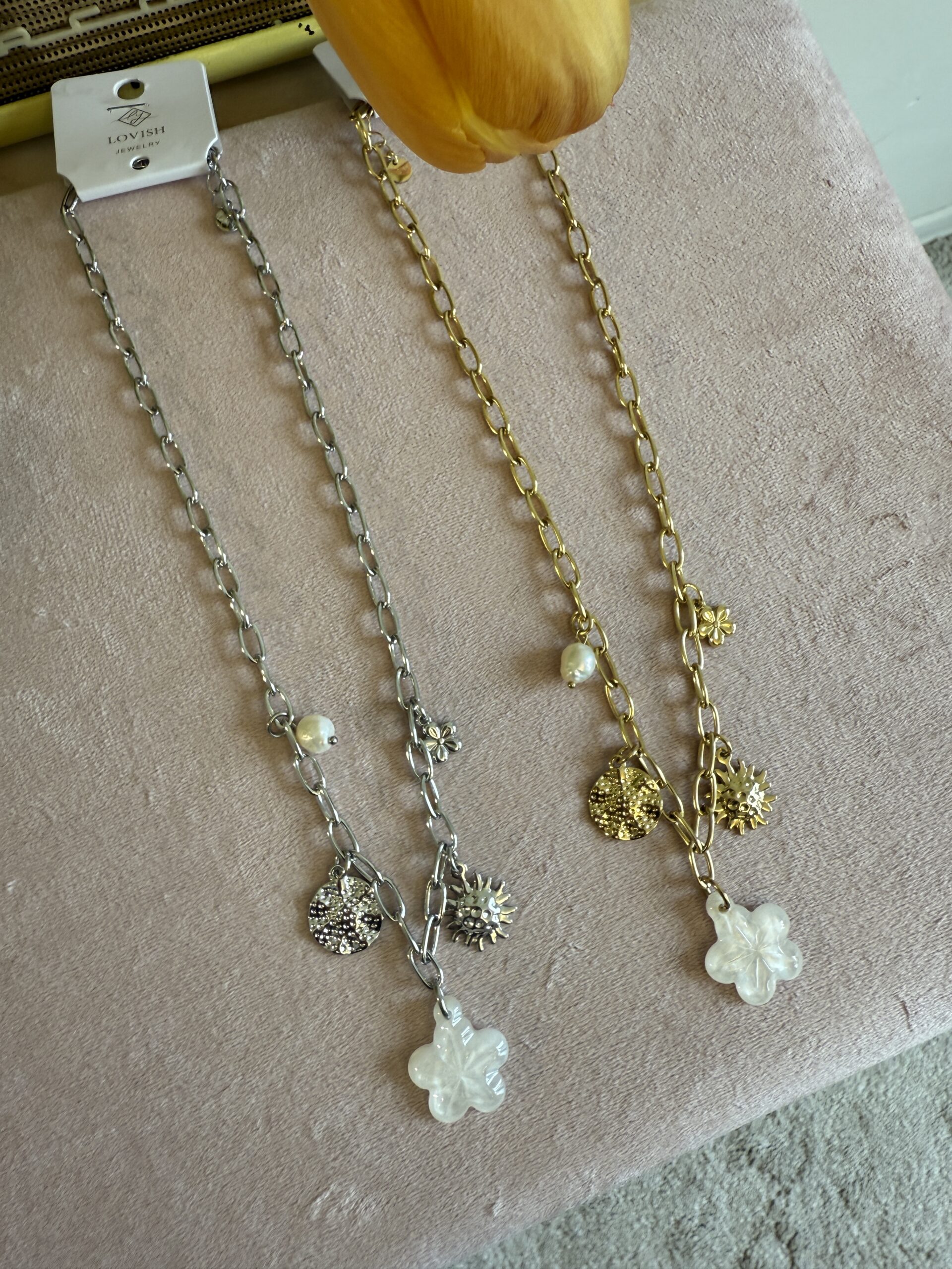 Collana con fiore bianco e charms.
