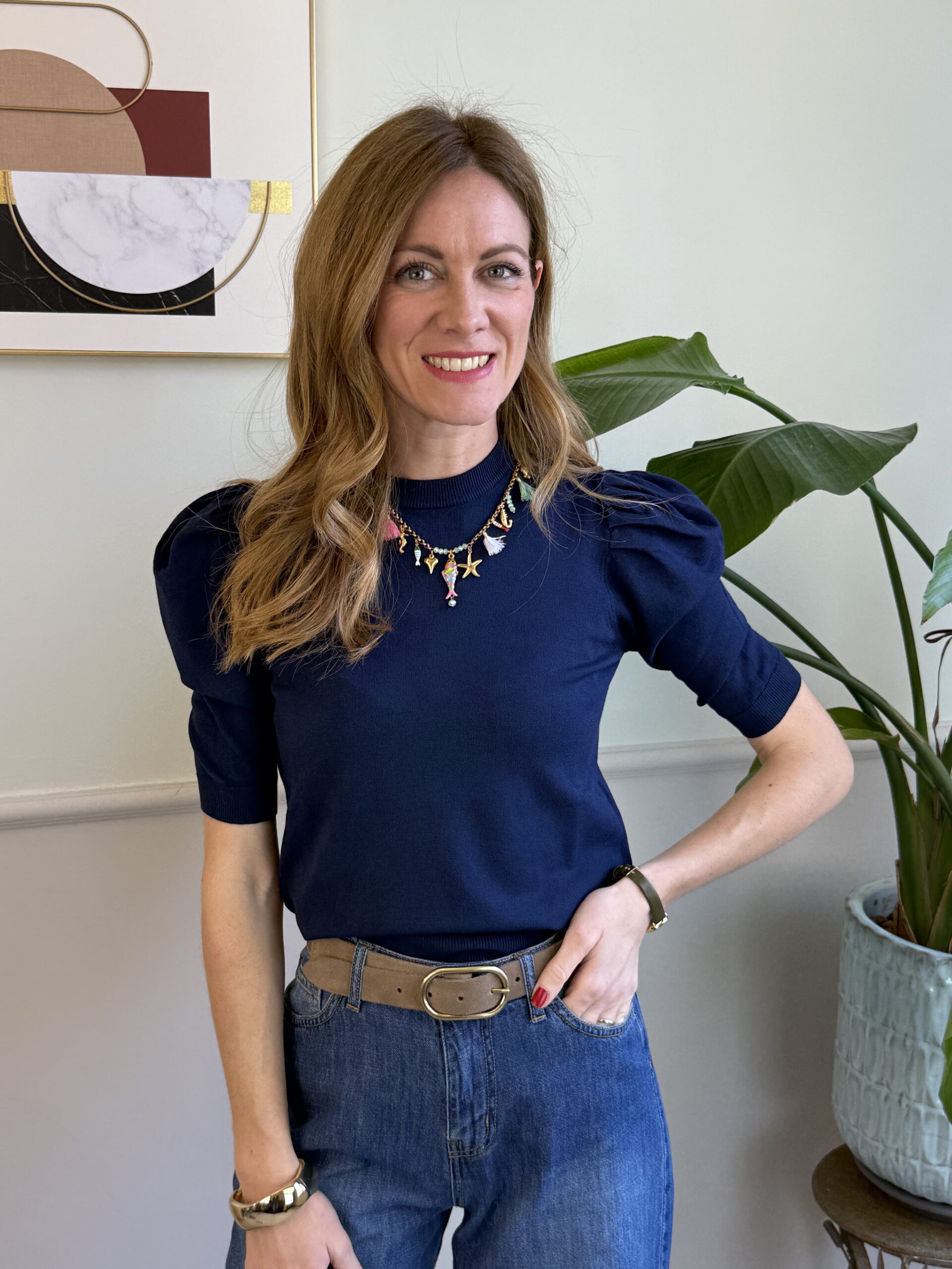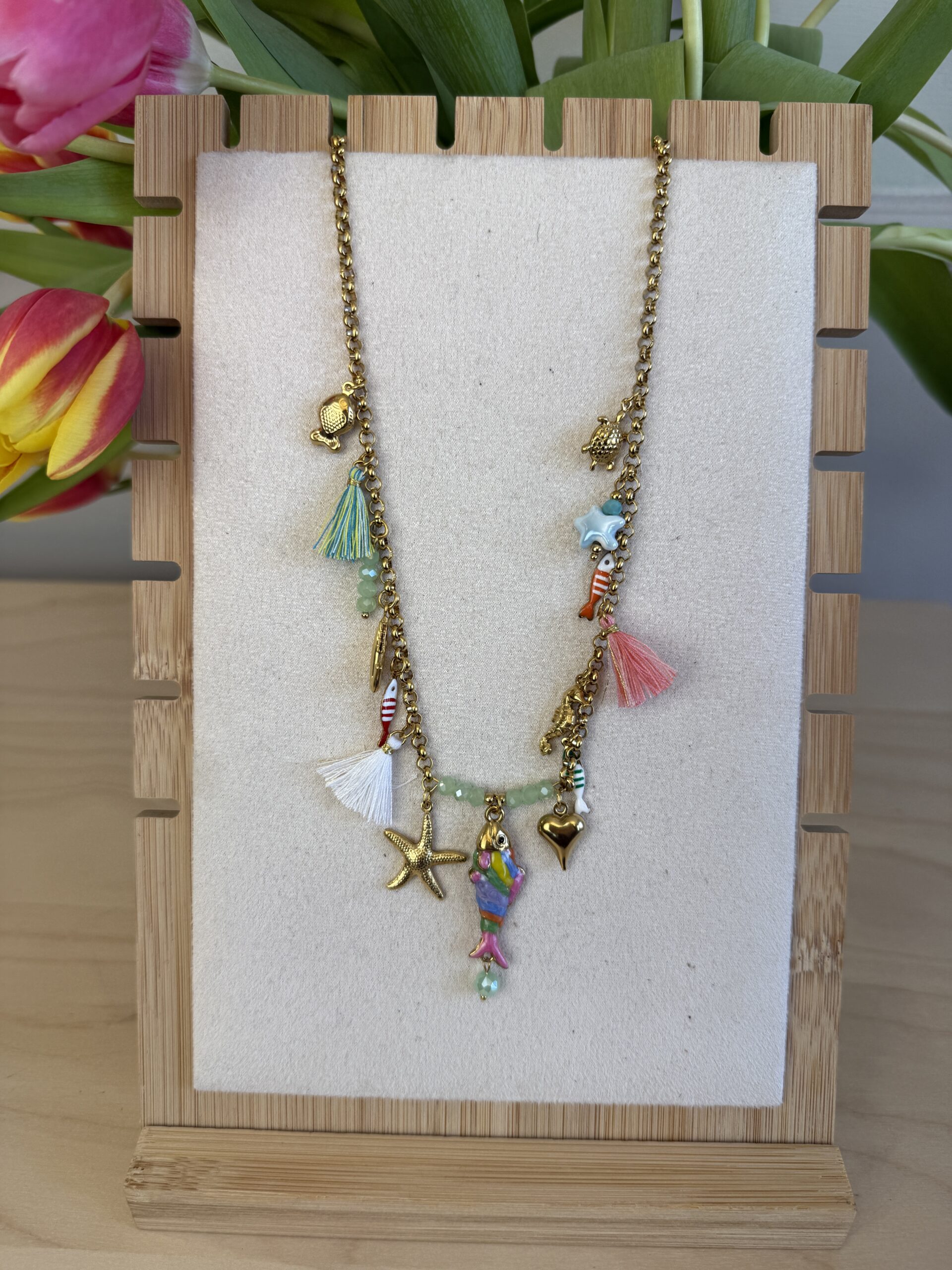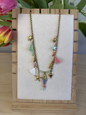 Collana dorata con nappine e pesciolini colorati.