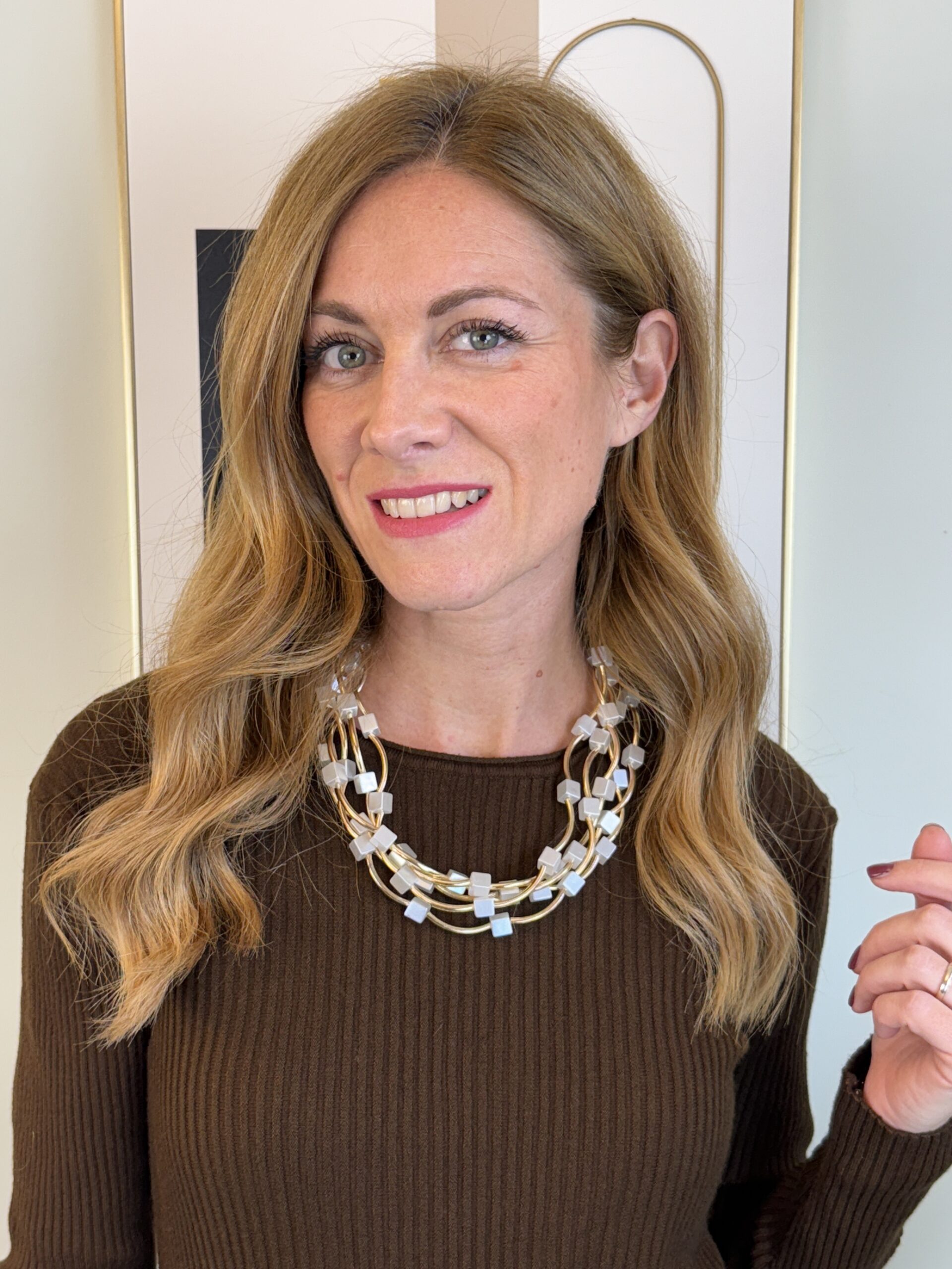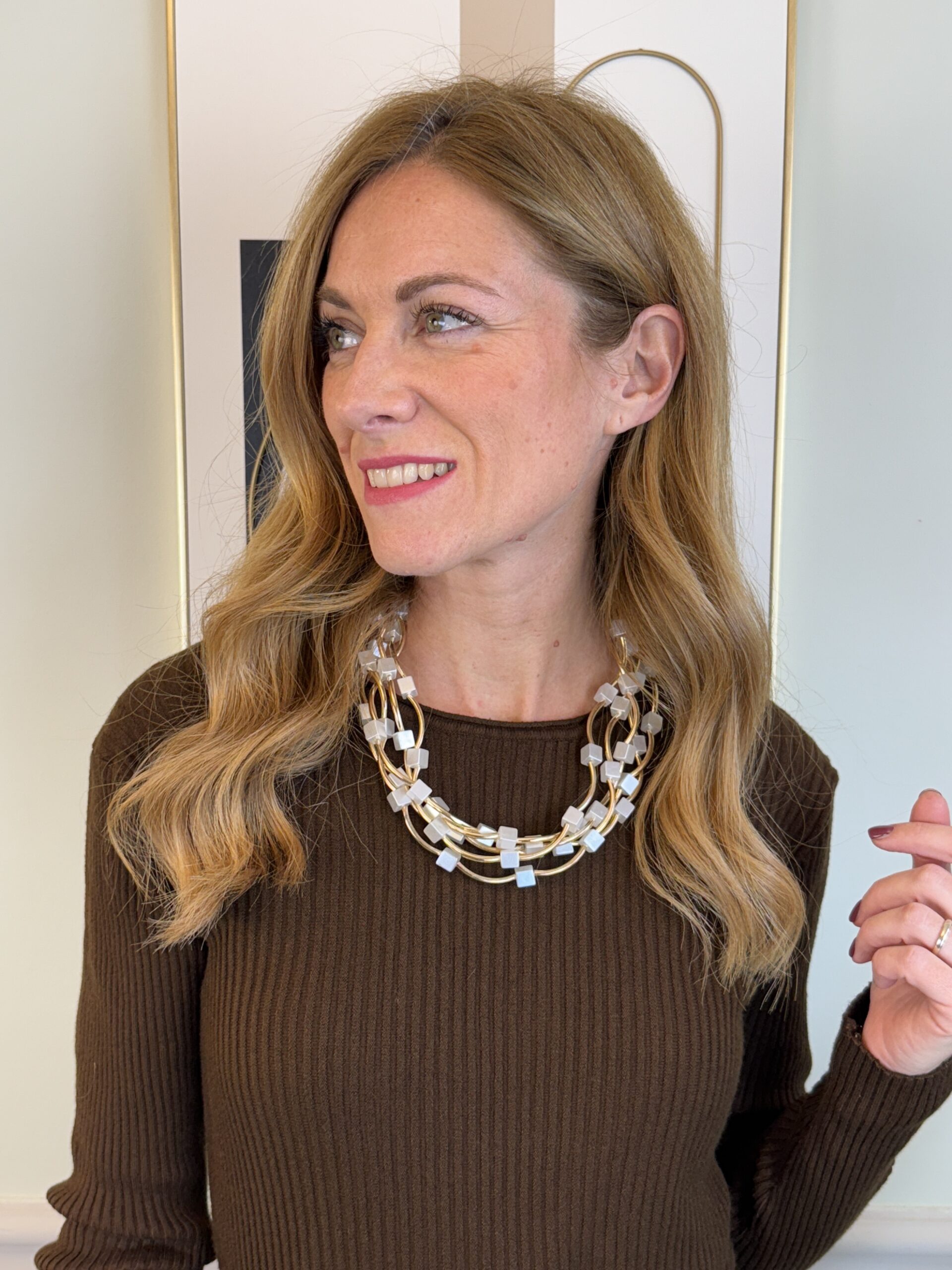 Collana multifili con quadratini perlati e onde dorate.