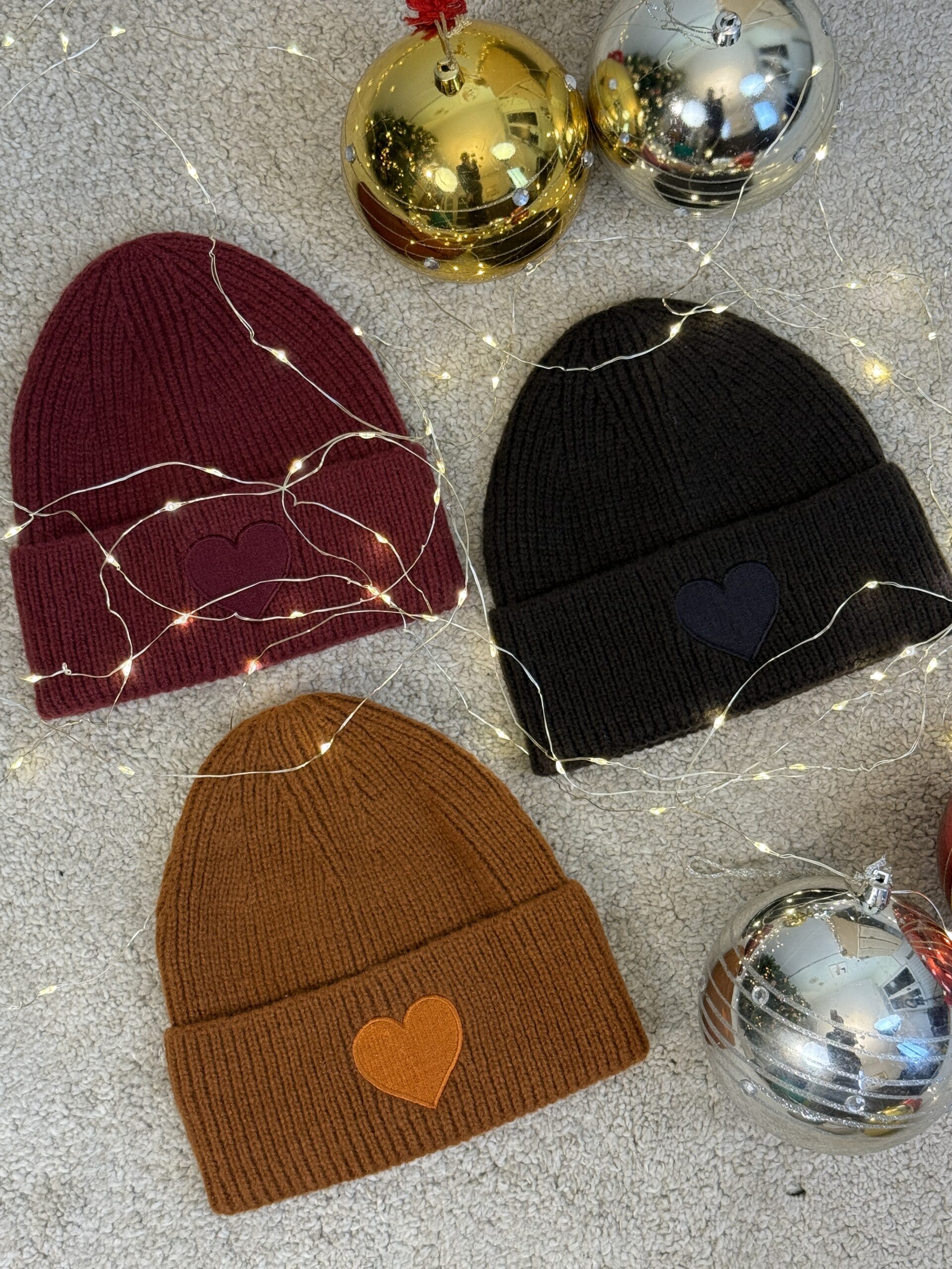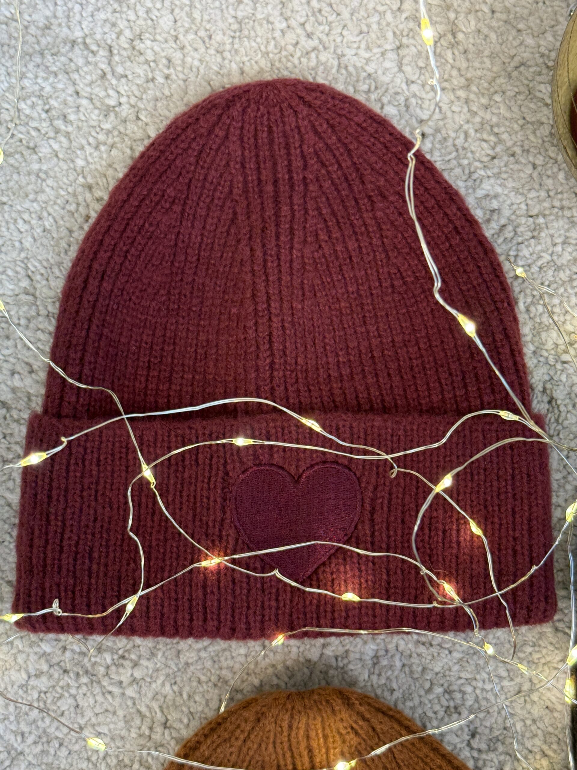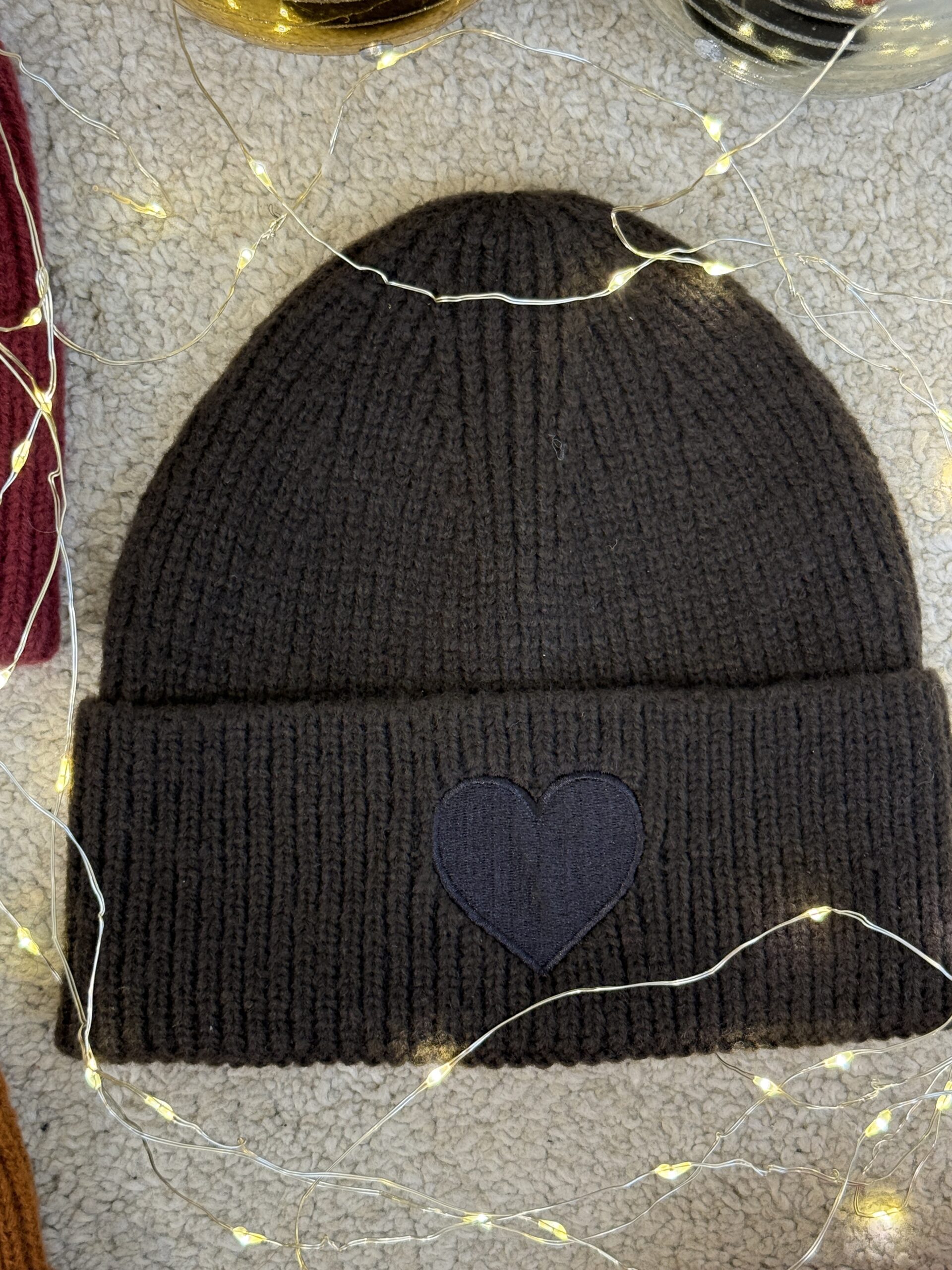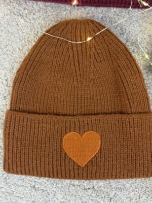 Cuffia a coste. Presenta un cuore ricamato sul risvolto.